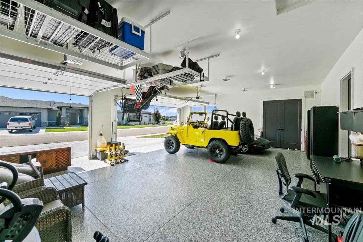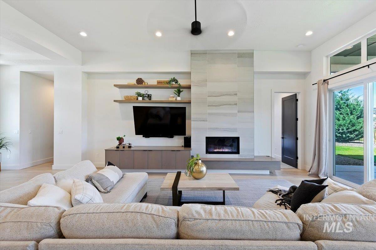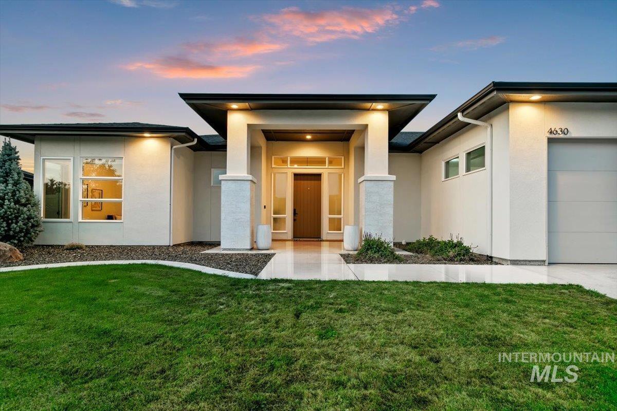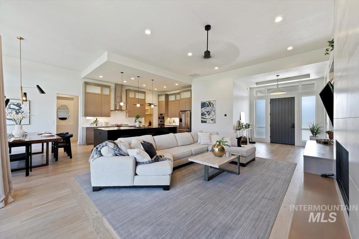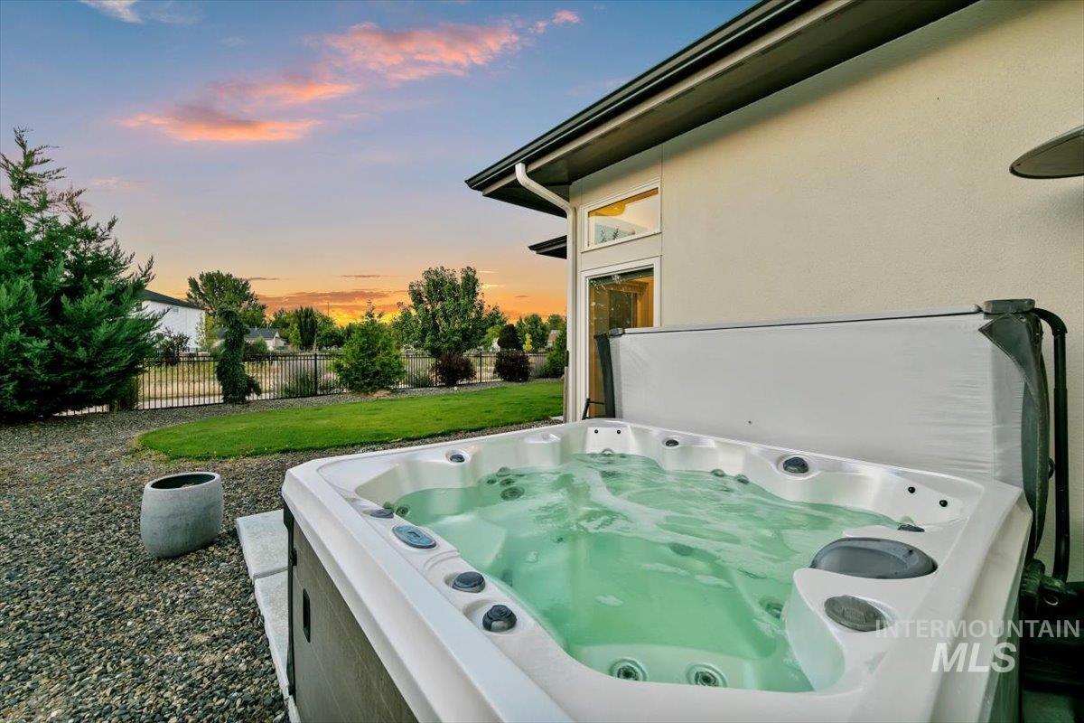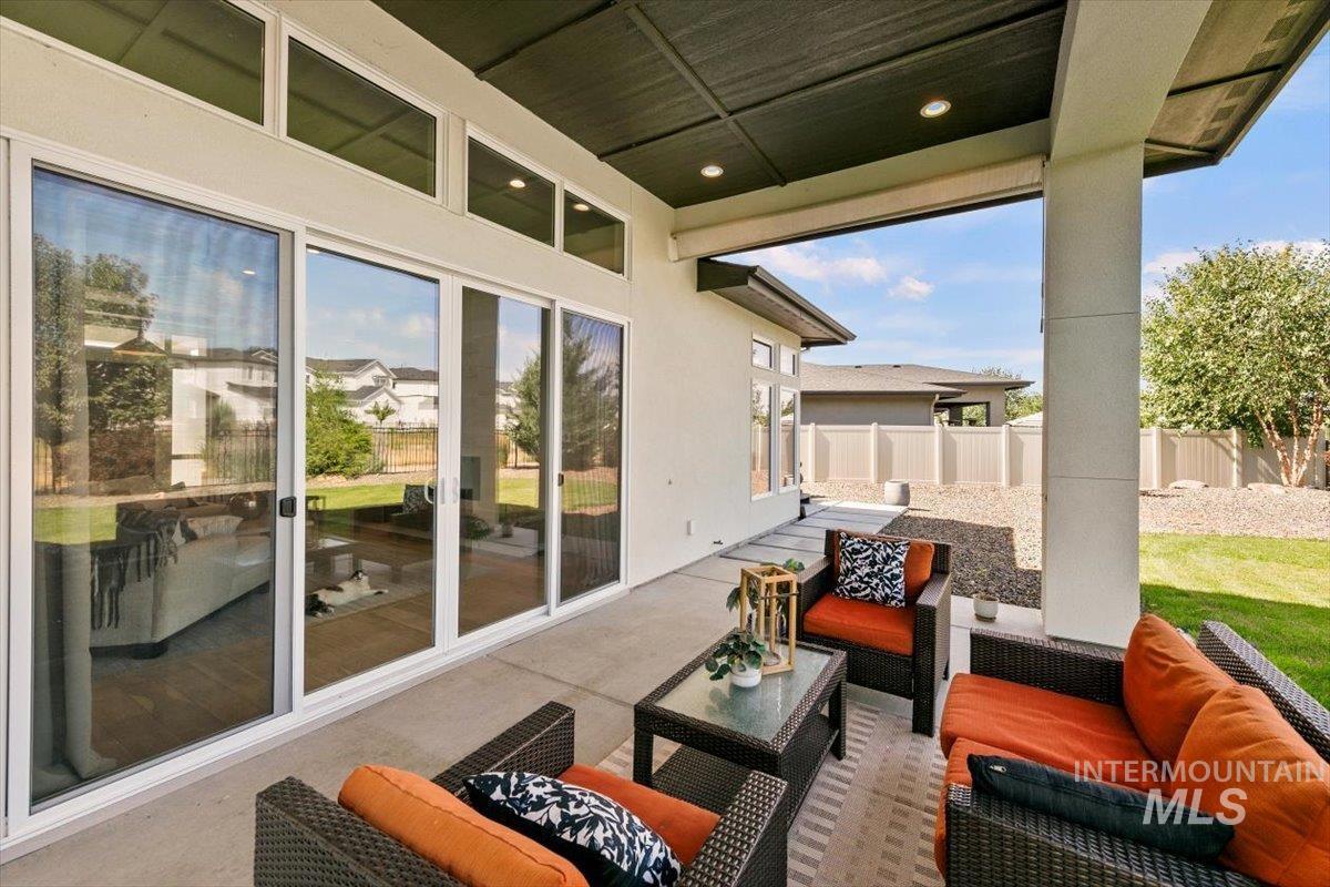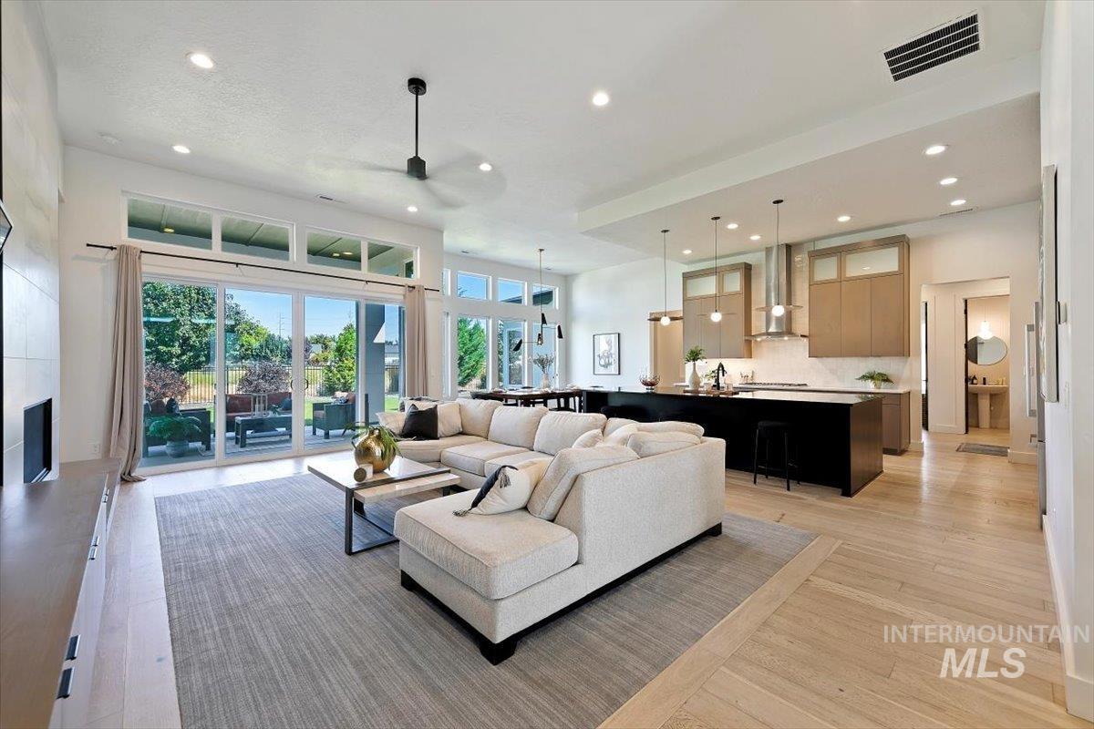 Welcome to this beautiful ZEC home in the highly desirable Movado Estates community, where thoughtful design meets luxury, comfort, and functionality. Inside, soaring 12’ and 10’ ceilings, transom windows, and an open-concept layout create a bright, inviting atmosphere. The chef-inspired kitchen features a Bosch 5-burner cooktop, Bosch chimney hood, and sleek quartz countertops, opening to a spacious living area centered around a cozy gas fireplace. The luxury primary suite is designed as a retreat, complete with a soaking tub, dual vanities, walk-in shower, and generous walk-in closet. Step outside to your private backyard oasis with full landscaping, a covered patio, hot tub, and no rear neighbors. An attached 3-car garage with epoxy-coated floors provides both storage and convenience, while community amenities include a pool, park, and walking paths, all just minutes from shopping, dining, and freeway access. This is Idaho living at its finest.