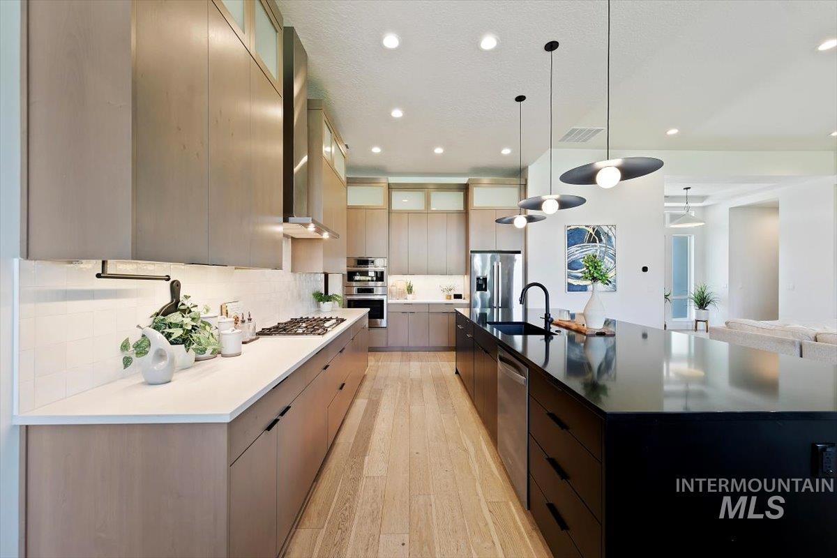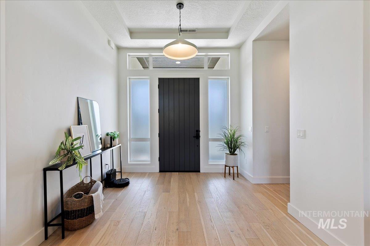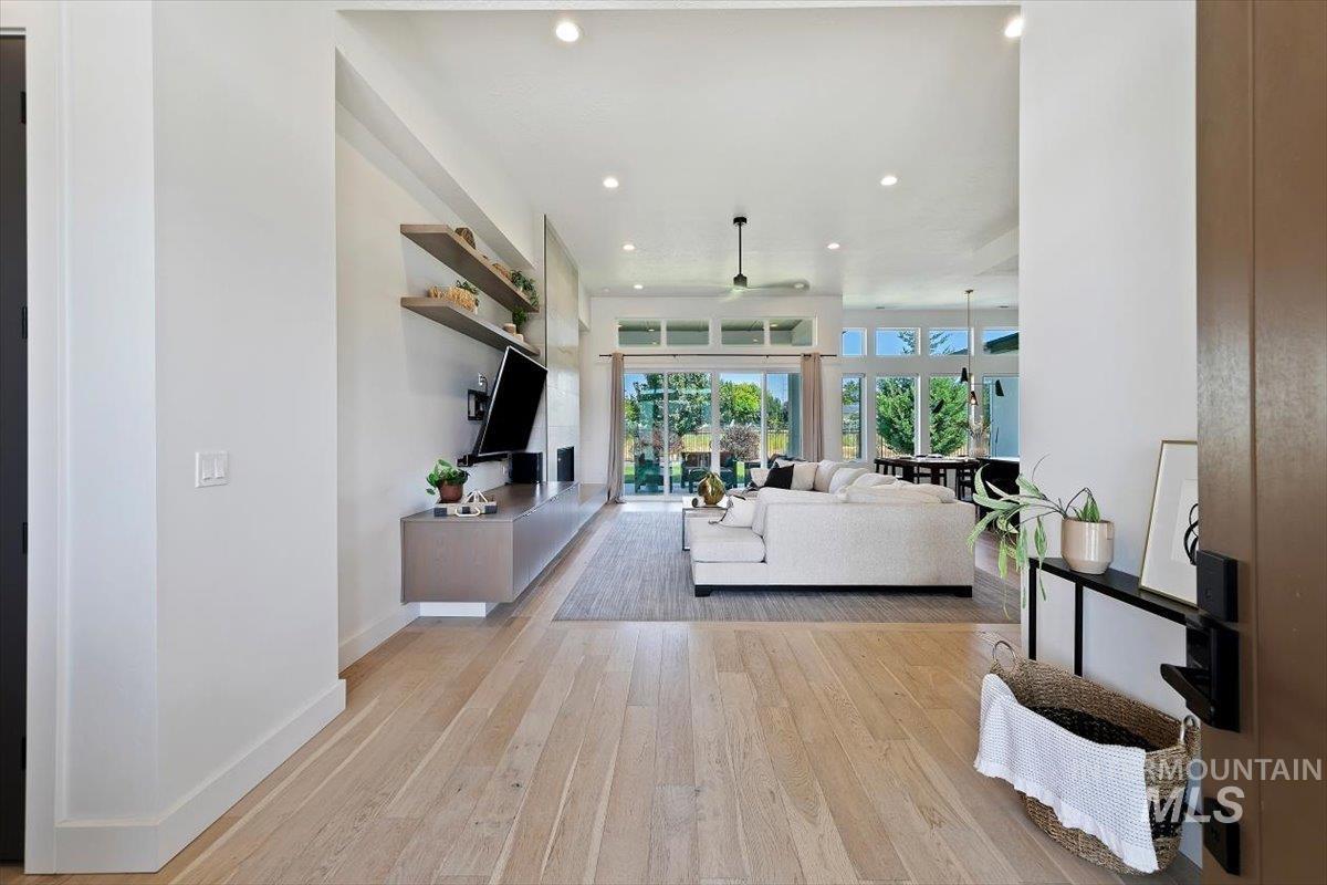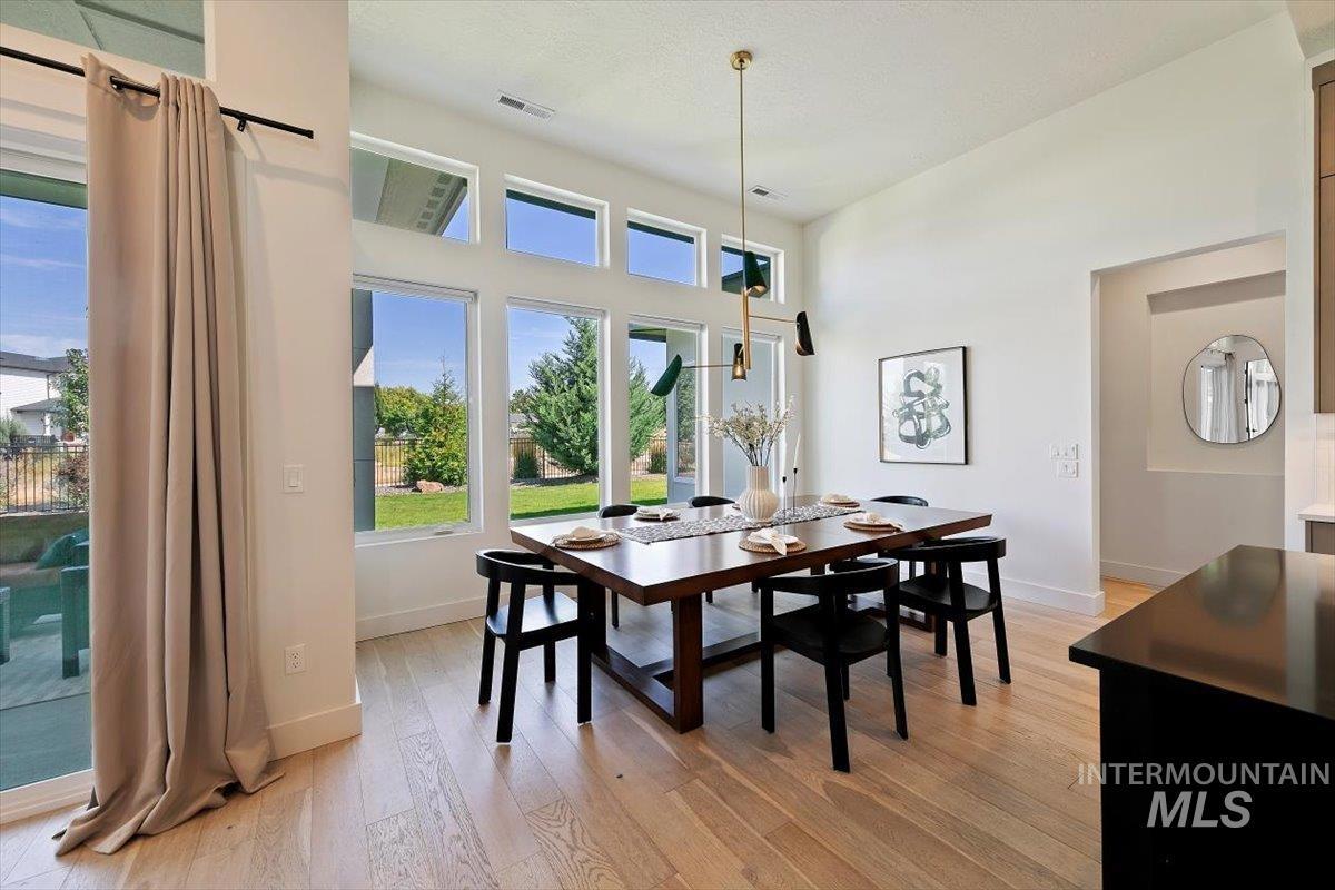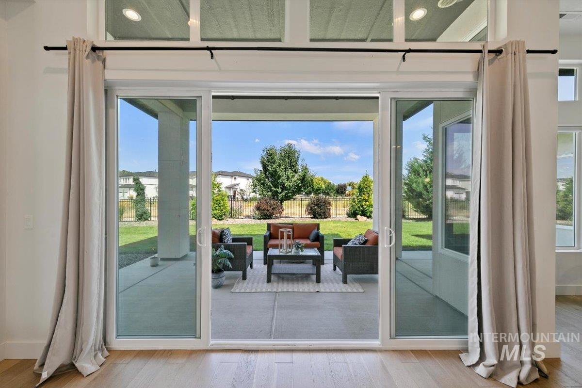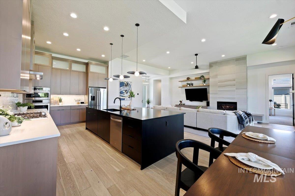 Welcome to this beautiful ZEC home in the highly desirable Movado Estates community, where thoughtful design meets luxury, comfort, and functionality. Inside, soaring 12’ and 10’ ceilings, transom windows, and an open-concept layout create a bright, inviting atmosphere. The chef-inspired kitchen features a Bosch 5-burner cooktop, Bosch chimney hood, and sleek quartz countertops, opening to a spacious living area centered around a cozy gas fireplace. The luxury primary suite is designed as a retreat, complete with a soaking tub, dual vanities, walk-in shower, and generous walk-in closet. Step outside to your private backyard oasis with full landscaping, a covered patio, hot tub, and no rear neighbors. An attached 3-car garage with epoxy-coated floors provides both storage and convenience, while community amenities include a pool, park, and walking paths, all just minutes from shopping, dining, and freeway access. This is Idaho living at its finest.