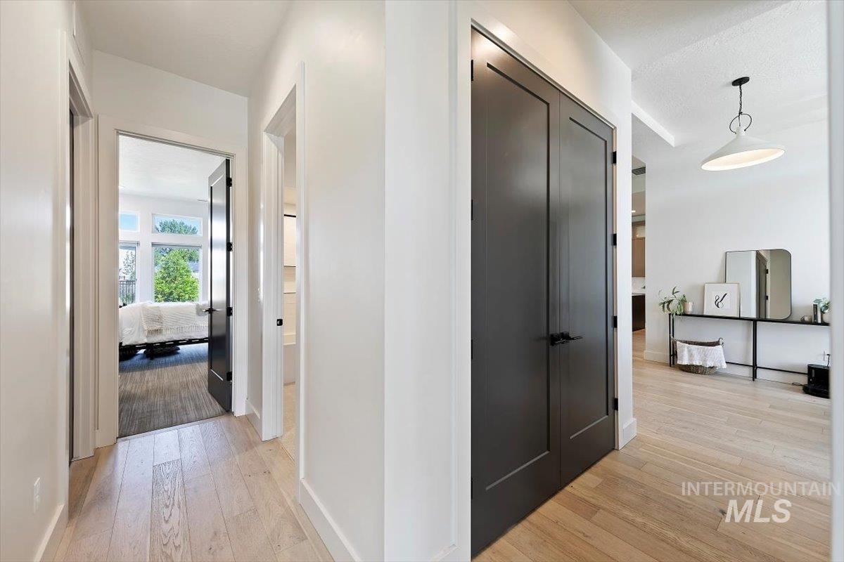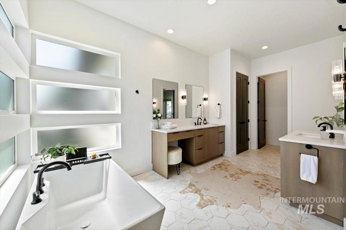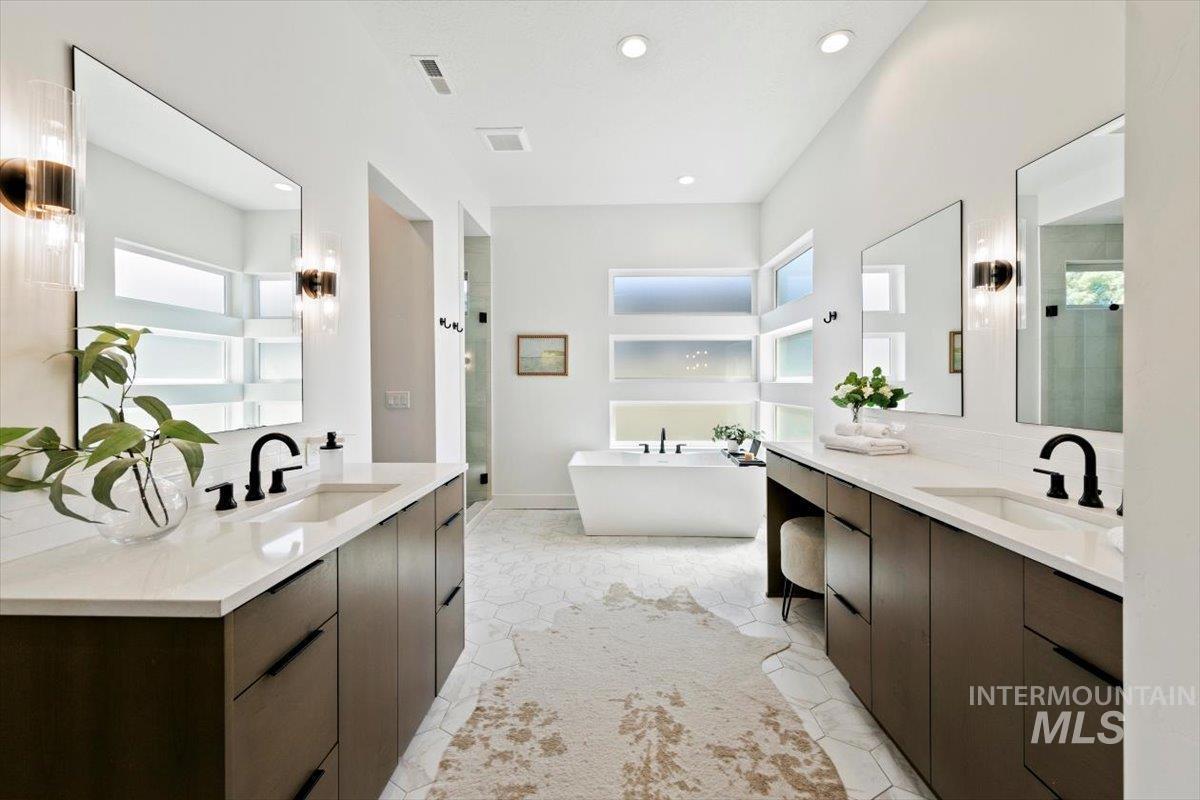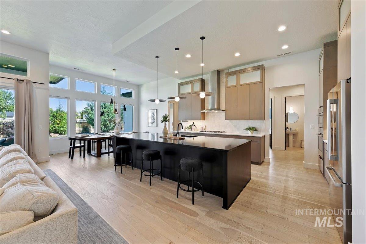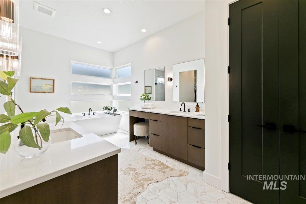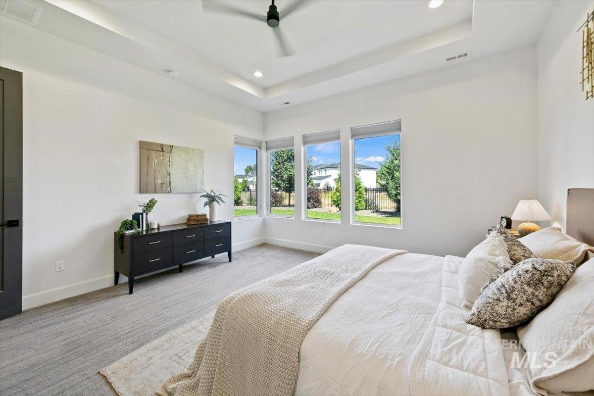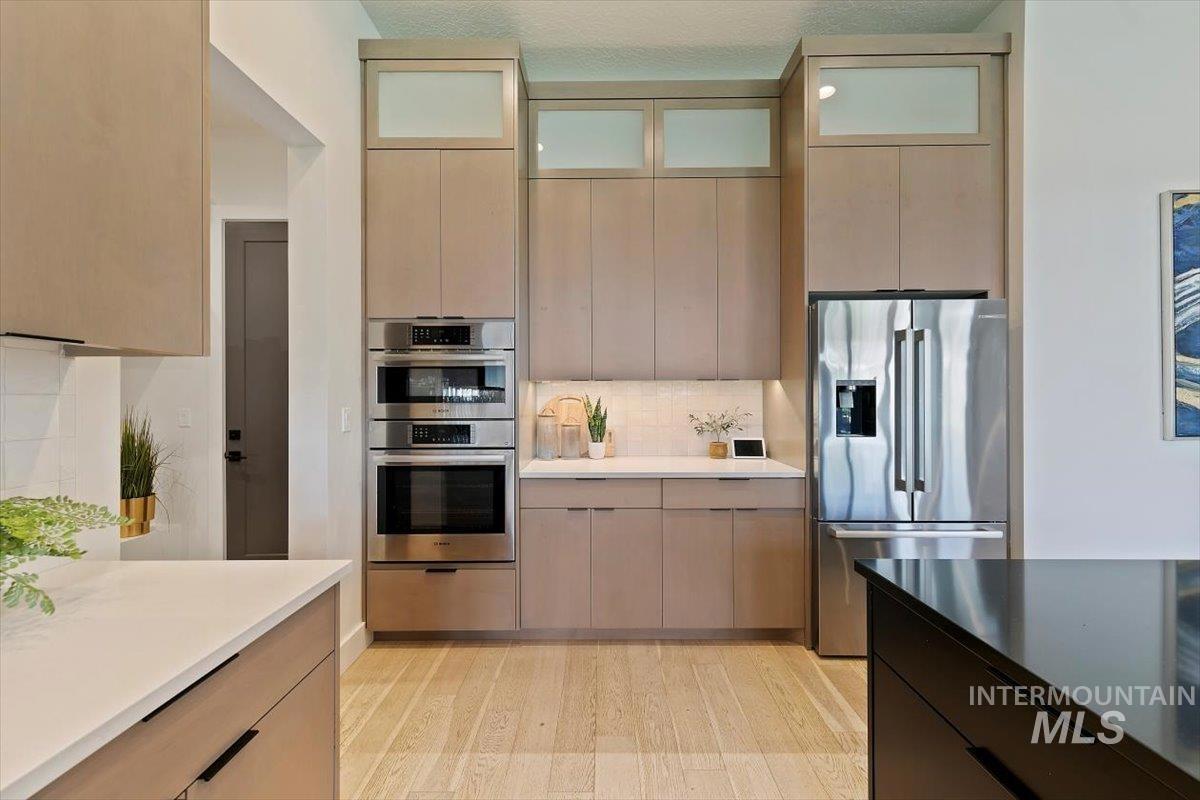 Welcome to this beautiful ZEC home in the highly desirable Movado Estates community, where thoughtful design meets luxury, comfort, and functionality. Inside, soaring 12’ and 10’ ceilings, transom windows, and an open-concept layout create a bright, inviting atmosphere. The chef-inspired kitchen features a Bosch 5-burner cooktop, Bosch chimney hood, and sleek quartz countertops, opening to a spacious living area centered around a cozy gas fireplace. The luxury primary suite is designed as a retreat, complete with a soaking tub, dual vanities, walk-in shower, and generous walk-in closet. Step outside to your private backyard oasis with full landscaping, a covered patio, hot tub, and no rear neighbors. An attached 3-car garage with epoxy-coated floors provides both storage and convenience, while community amenities include a pool, park, and walking paths, all just minutes from shopping, dining, and freeway access. This is Idaho living at its finest.