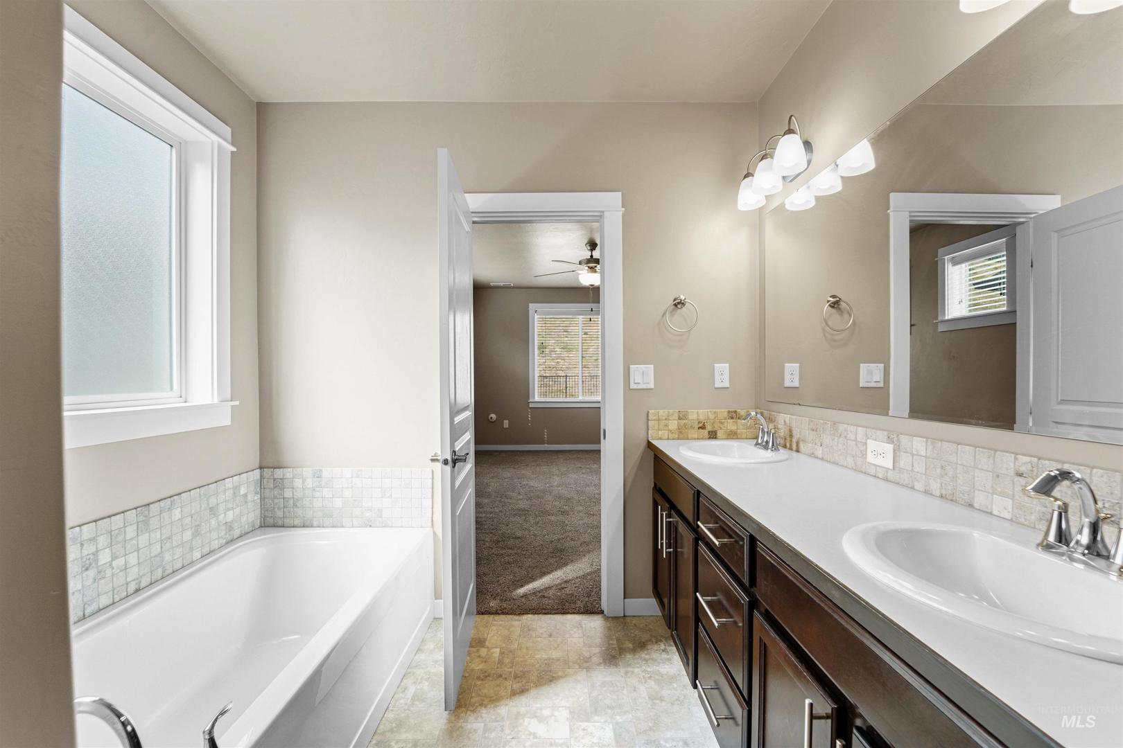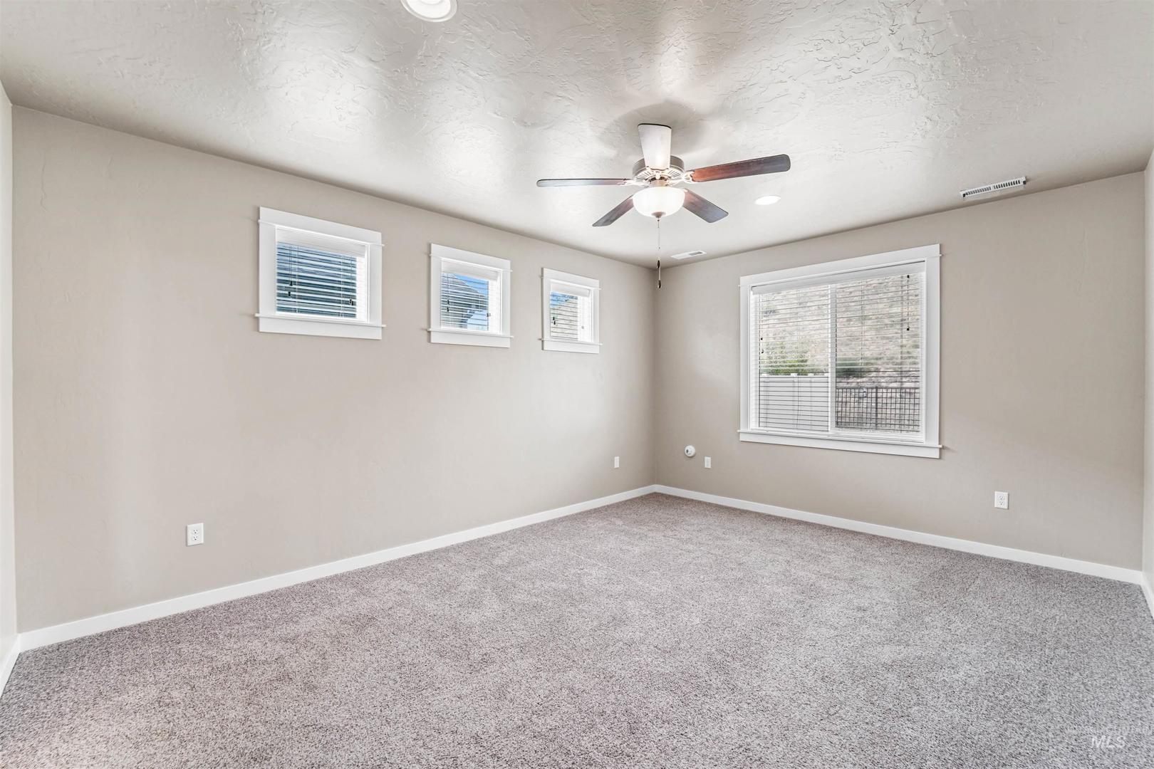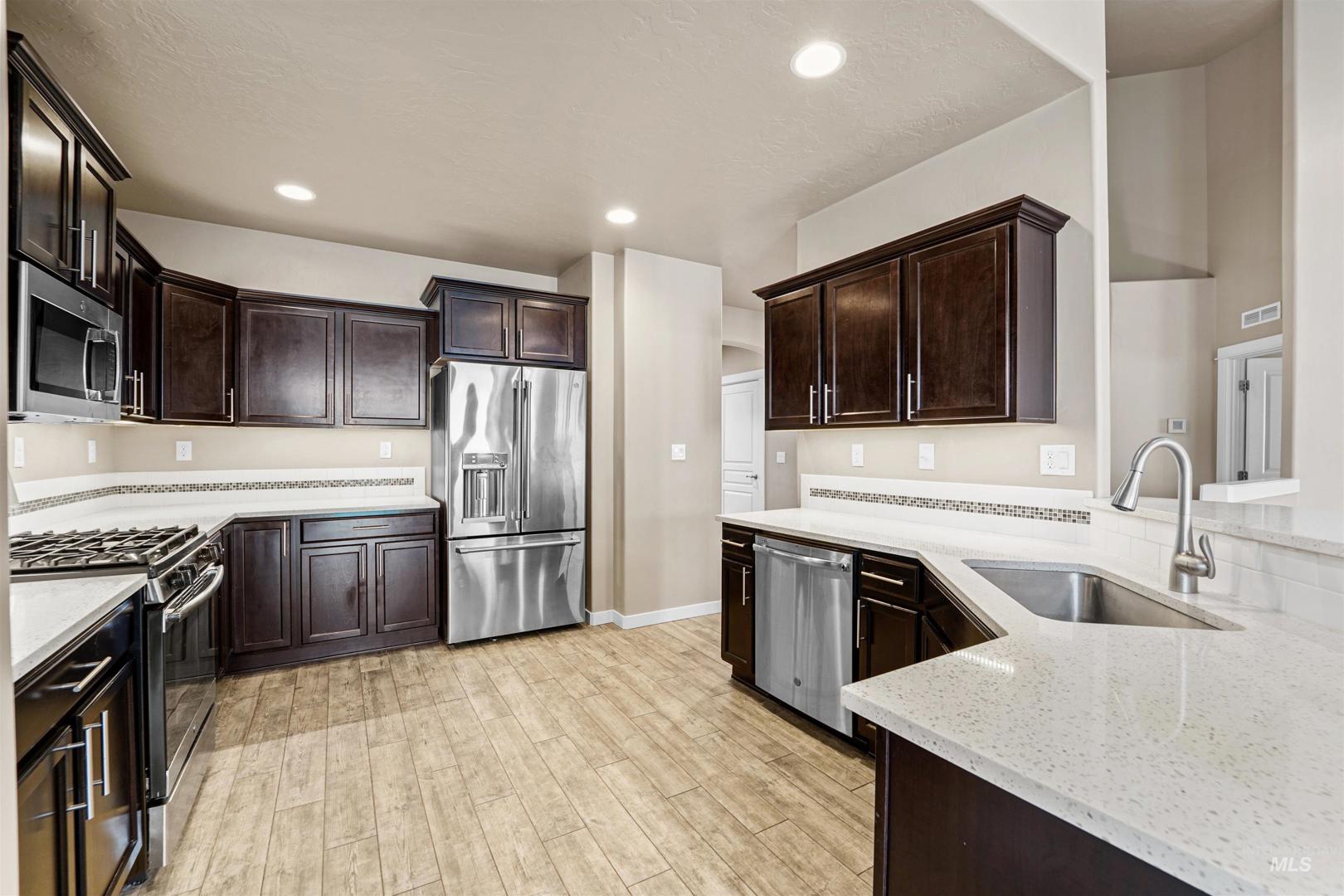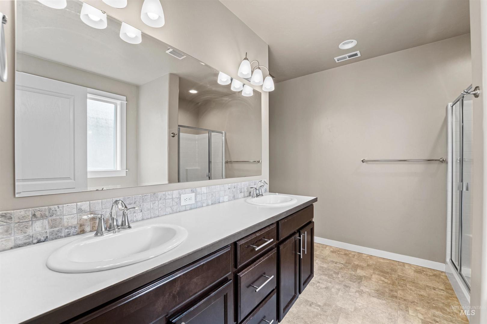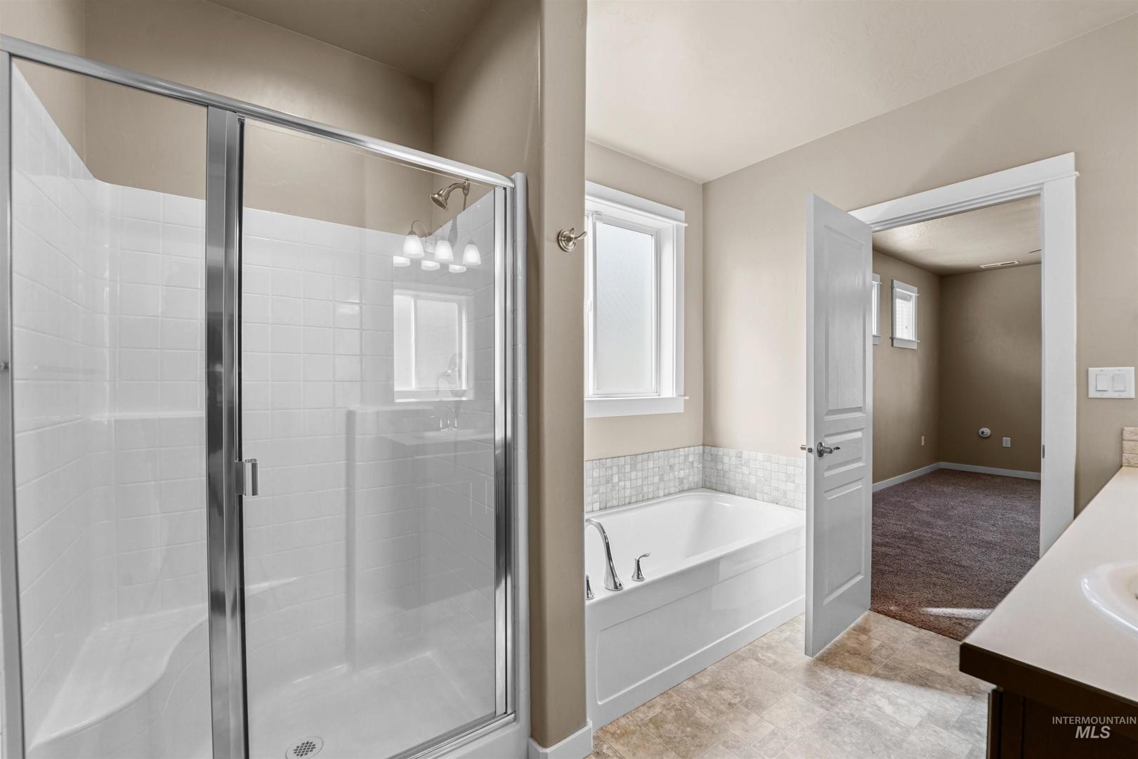 Fantastic opportunity to live centrally in Eagle in a spacious two-story home offering main level master and no backyard neighbors! Enjoy high vaulted ceilings in the expansive great room with wood-look tile flooring. Open kitchen with stainless steel appliances, quartz countertops & pantry. Large master suite with dual vanities, soaker tub, and walk-in closet. Wonderful office on the main level also! Enjoy gas fireplace, alarm system and dual zone climate control. Three generous bedrooms upstairs all featuring east-facing Mountain Views, plus large bonus room / loft for entertaining. Exterior features cement board siding, with extra large covered patio and private yard! Conveniently located in Redstone Ranch between downtown and Eagle Sports Complex, walk or ride to Guerber Community Park. Highly rated Eagle Schools!