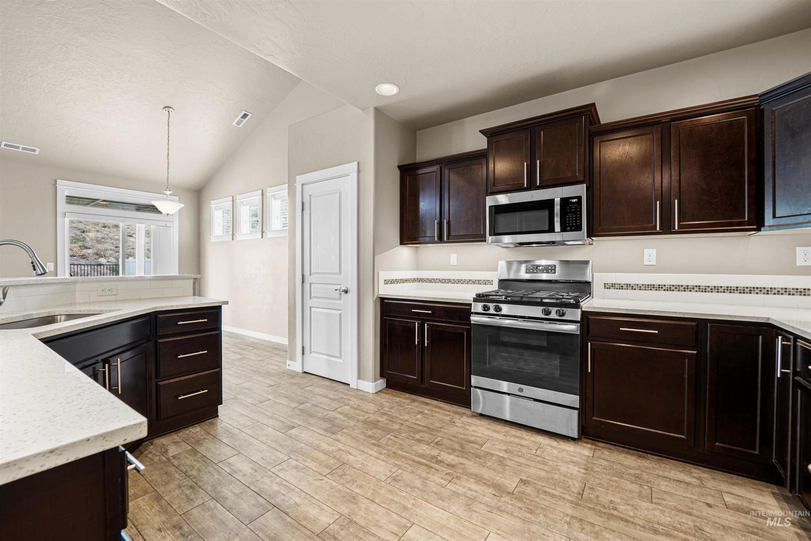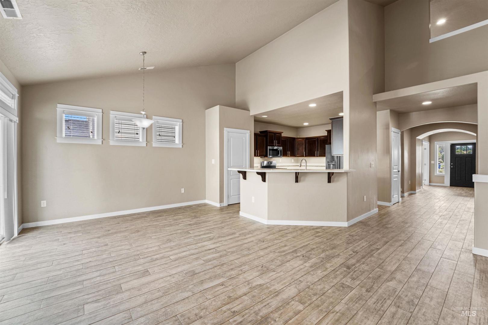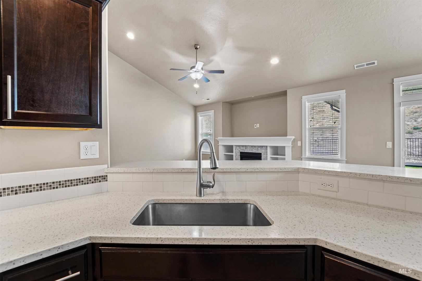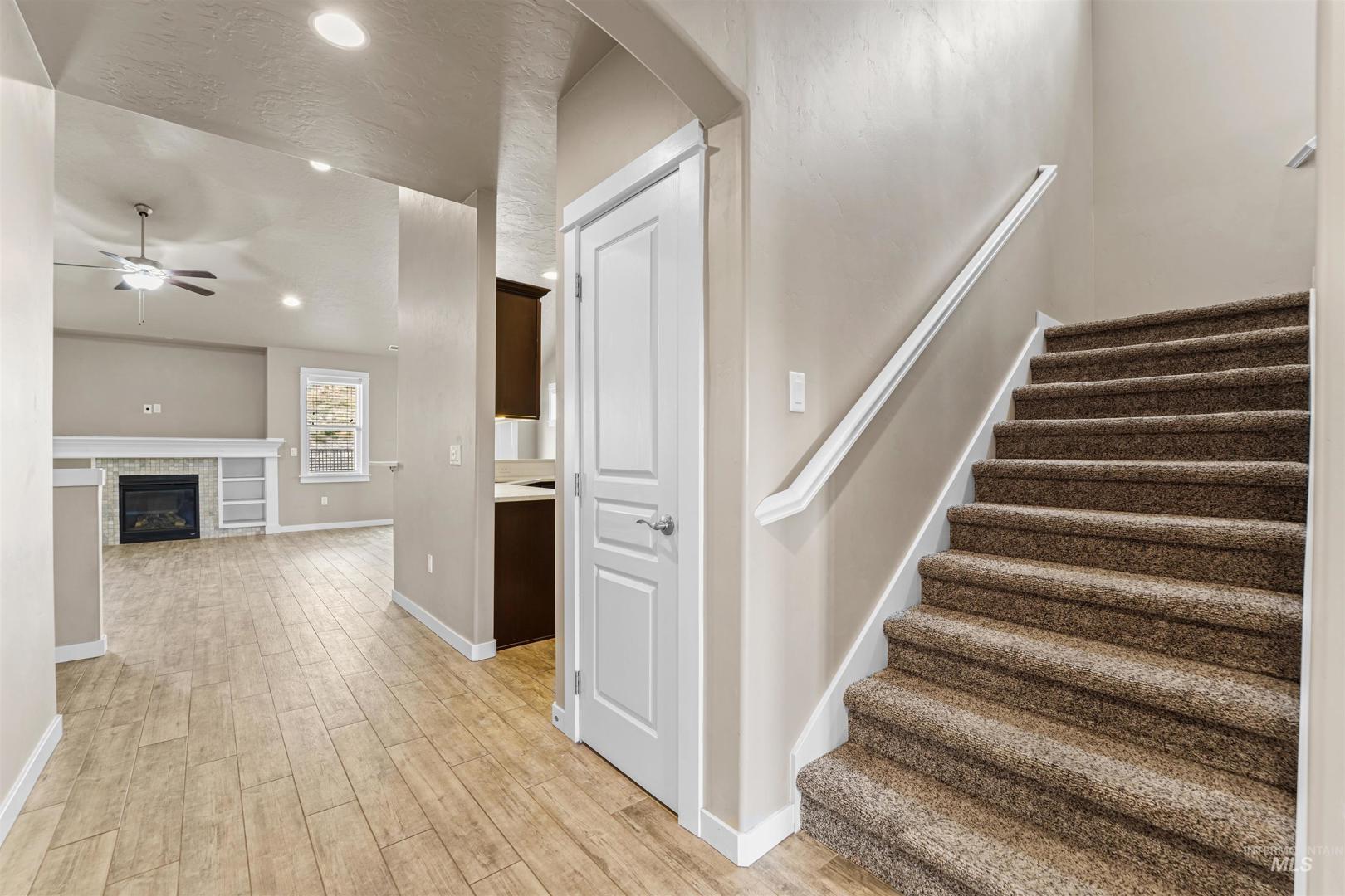 Fantastic opportunity to live centrally in Eagle in a spacious two-story home offering main level master and no backyard neighbors! Enjoy high vaulted ceilings in the expansive great room with wood-look tile flooring. Open kitchen with stainless steel appliances, quartz countertops & pantry. Large master suite with dual vanities, soaker tub, and walk-in closet. Wonderful office on the main level also! Enjoy gas fireplace, alarm system and dual zone climate control. Three generous bedrooms upstairs all featuring east-facing Mountain Views, plus large bonus room / loft for entertaining. Exterior features cement board siding, with extra large covered patio and private yard! Conveniently located in Redstone Ranch between downtown and Eagle Sports Complex, walk or ride to Guerber Community Park. Highly rated Eagle Schools!