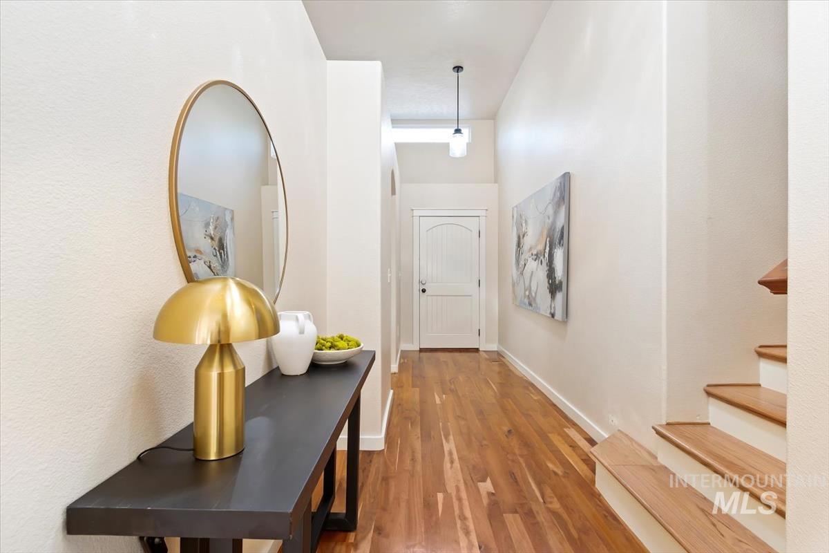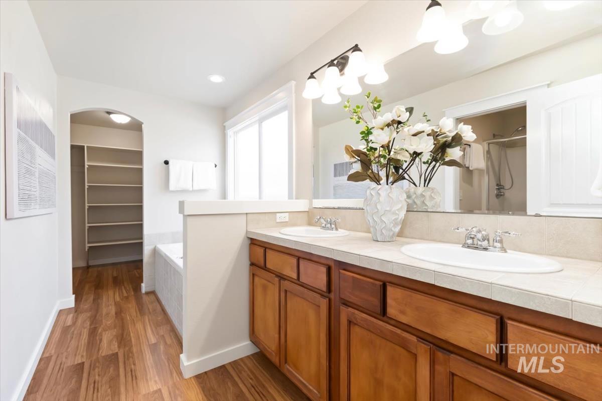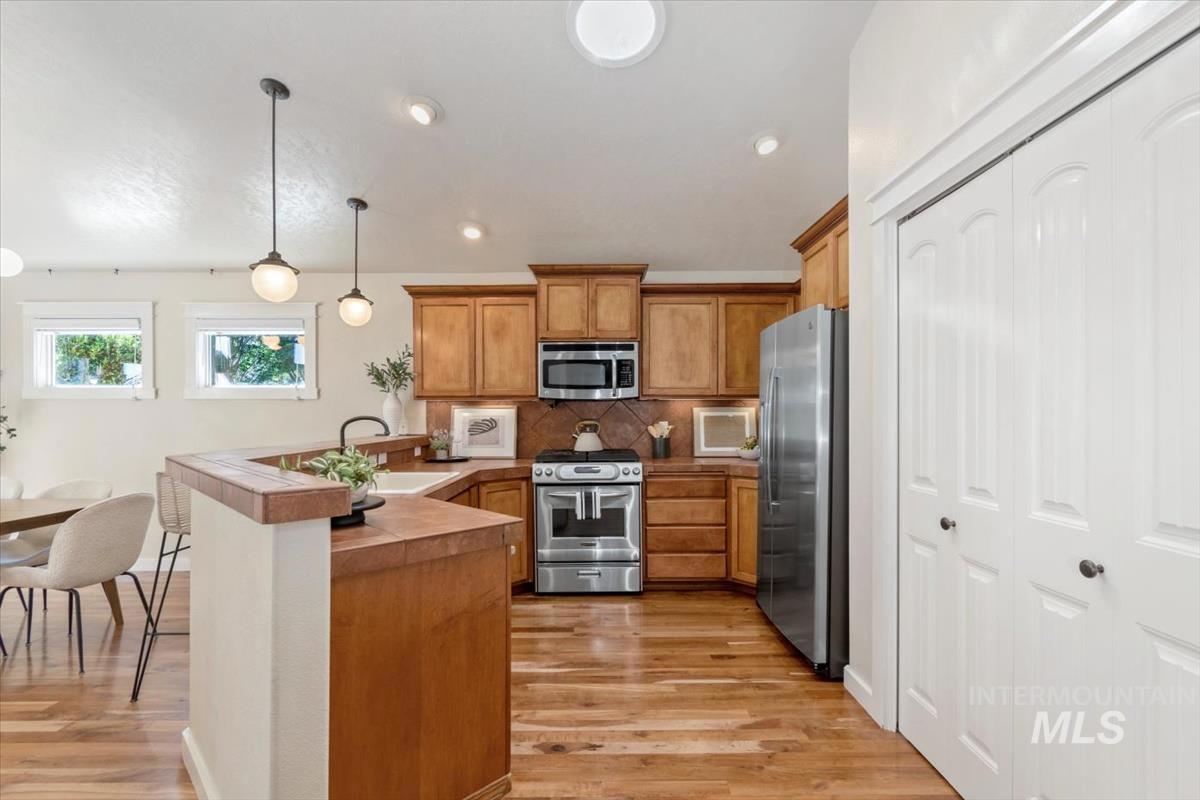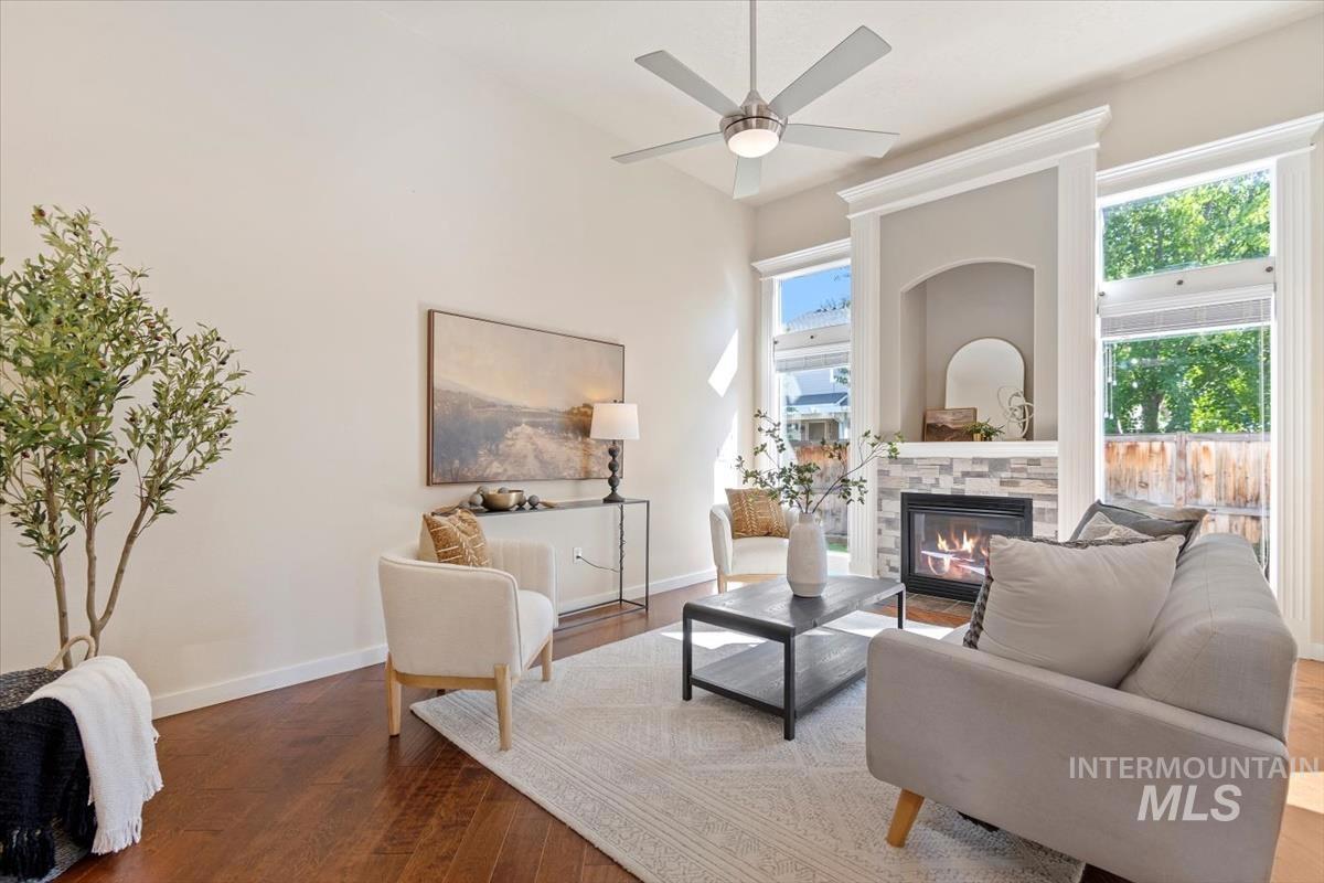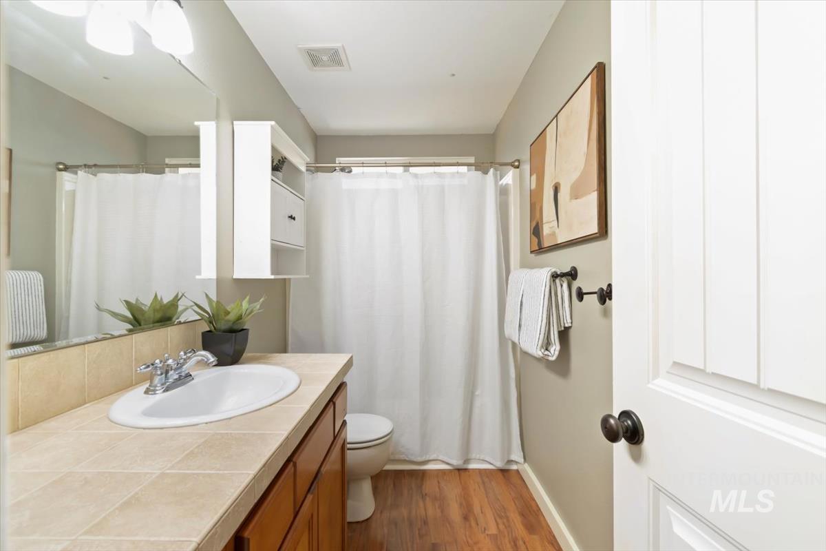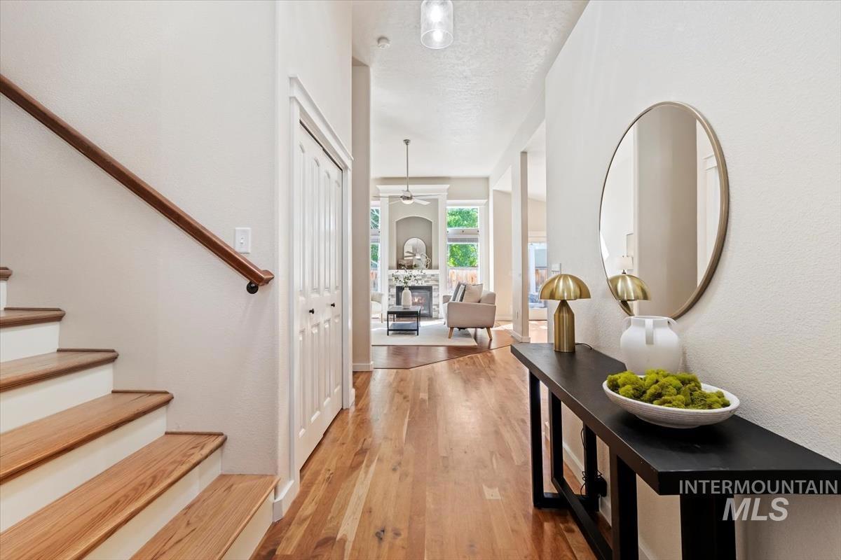 Functional and inviting, this home offers a thoughtful layout in an established Southwest Boise neighborhood, featuring convenient main level living with flexible upstairs bonus space. Durable wood flooring throughout ensures easy upkeep, while wood blinds add both privacy and timeless style. Well-appointed kitchen is complete with Bosch dishwasher, gas range, under-cabinet lighting, and pantry. The kitchen flows seamlessly into the dining nook and great room, accented by a cozy gas fireplace. Private master retreat overlooks the backyard and includes an ensuite with dual sinks, soaker tub, separate shower, and walk-in closet. Upstairs, a versatile bonus room provides the perfect space for guests, a media room, or home office. Enjoy the peaceful backyard with its pergola-covered patio and ideal balance of lawn and low-maintenance landscaping—perfect for both relaxing and entertaining.