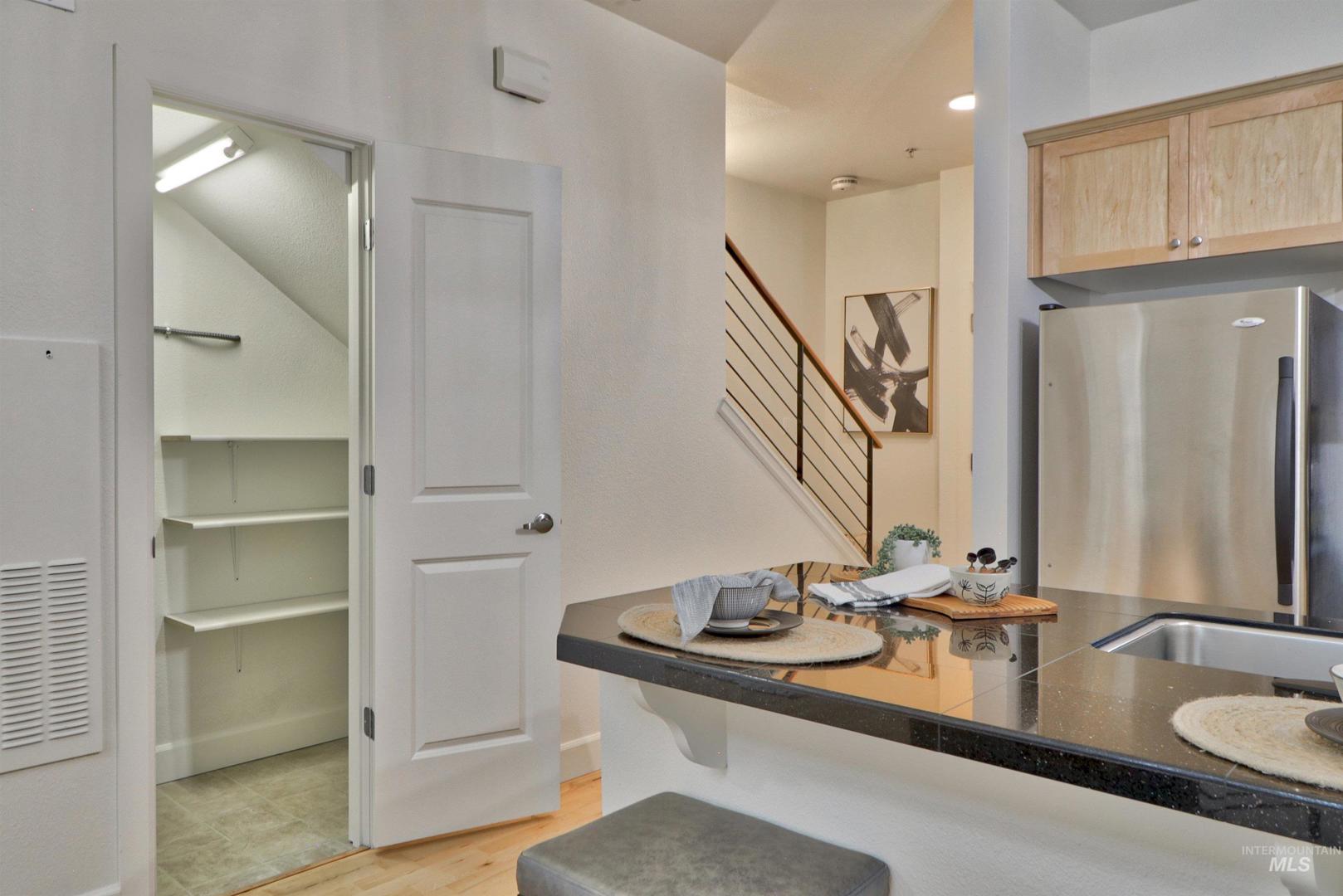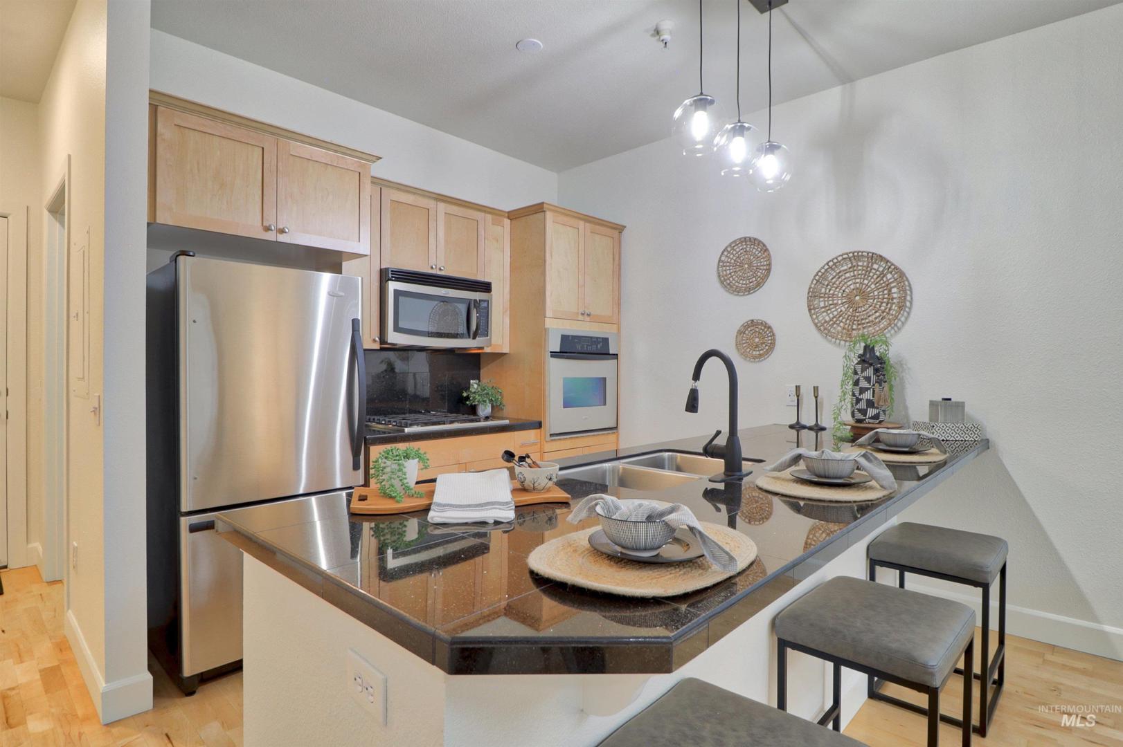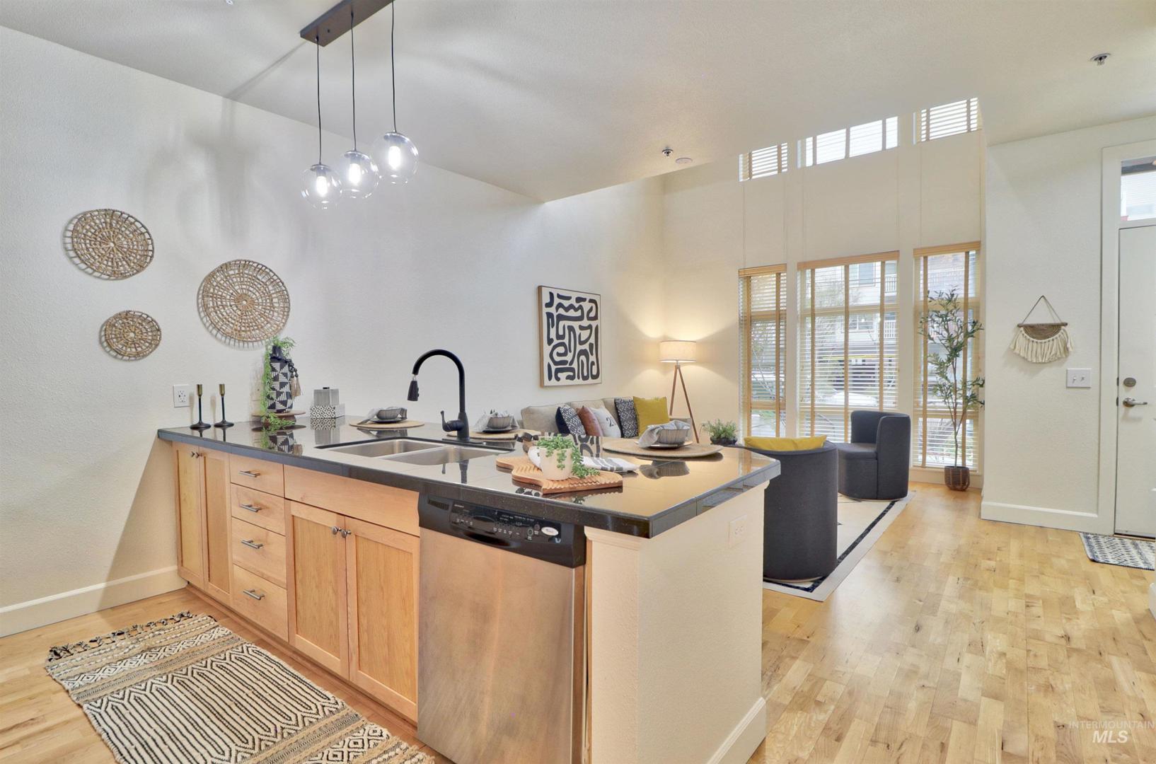 Welcome to your urban oasis in the heart of vibrant Downtown Boise! Located just steps from the Boise River, BSU & parks, this chic 1-bedroom loft-style condo offers a perfect blend of modern comfort and city sophistication. This condo lives like a townhome with easy, private street-entry/access and your own gated courtyard. Walking into the great room, you are greeted by the open floor plan featuring high ceilings and large windows that flood the space with natural light, it`s the perfect space to gather and make memories. Freshly painted, new fixtures, engineered hardwood flooring, granite countertops, stainless appliances, pantry, 1/2 bath & full laundry. The 2nd level is home to the spacious primary suite with glass shower, soaker tub, walk in closet and private balcony. *Includes 1 deeded, secured parking space in the gated community garage. Rooftop patio with bbq and views of the city. This condo is perfect for those seeking a modern, low-maintenance lifestyle with all the benefits of downtown living.
