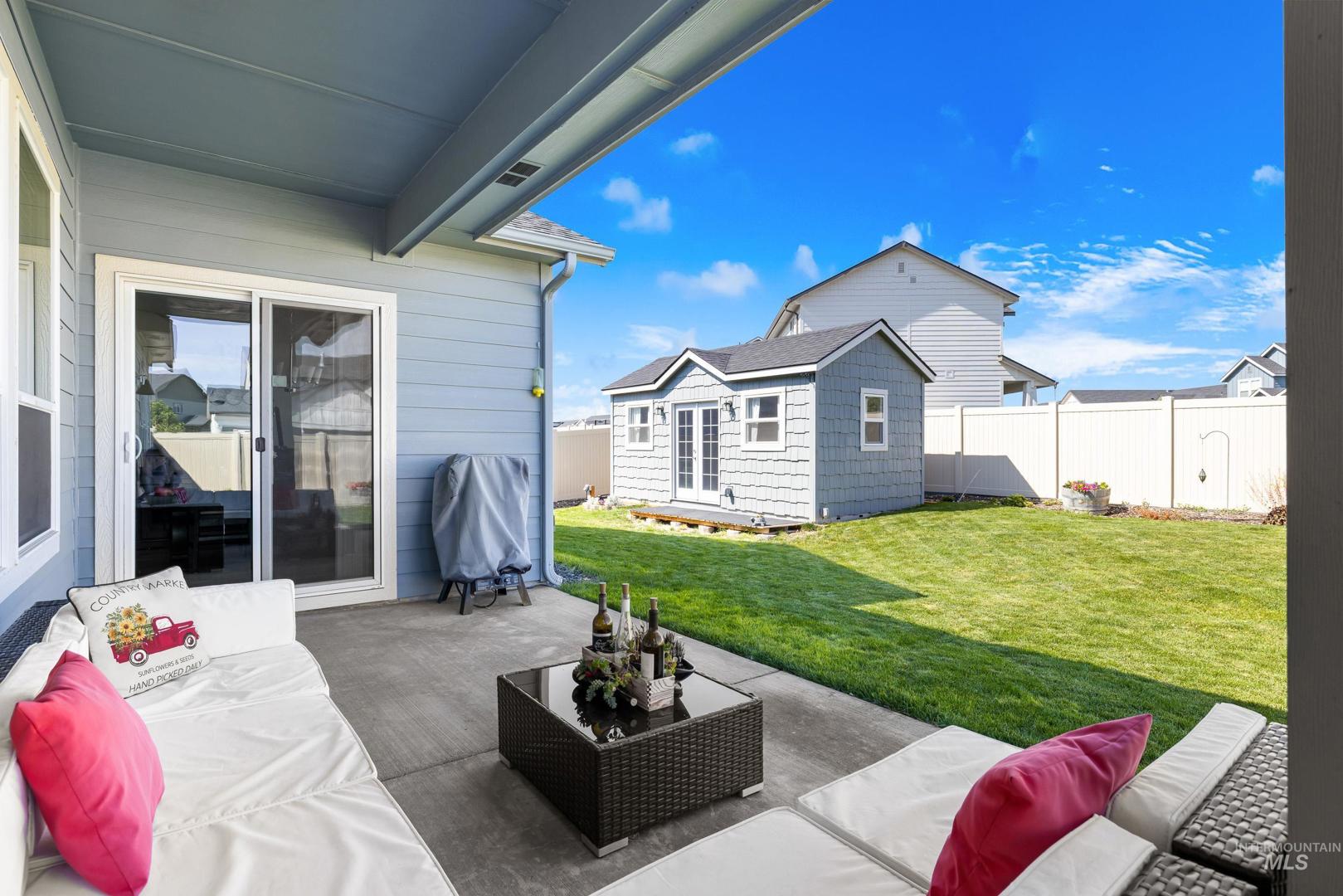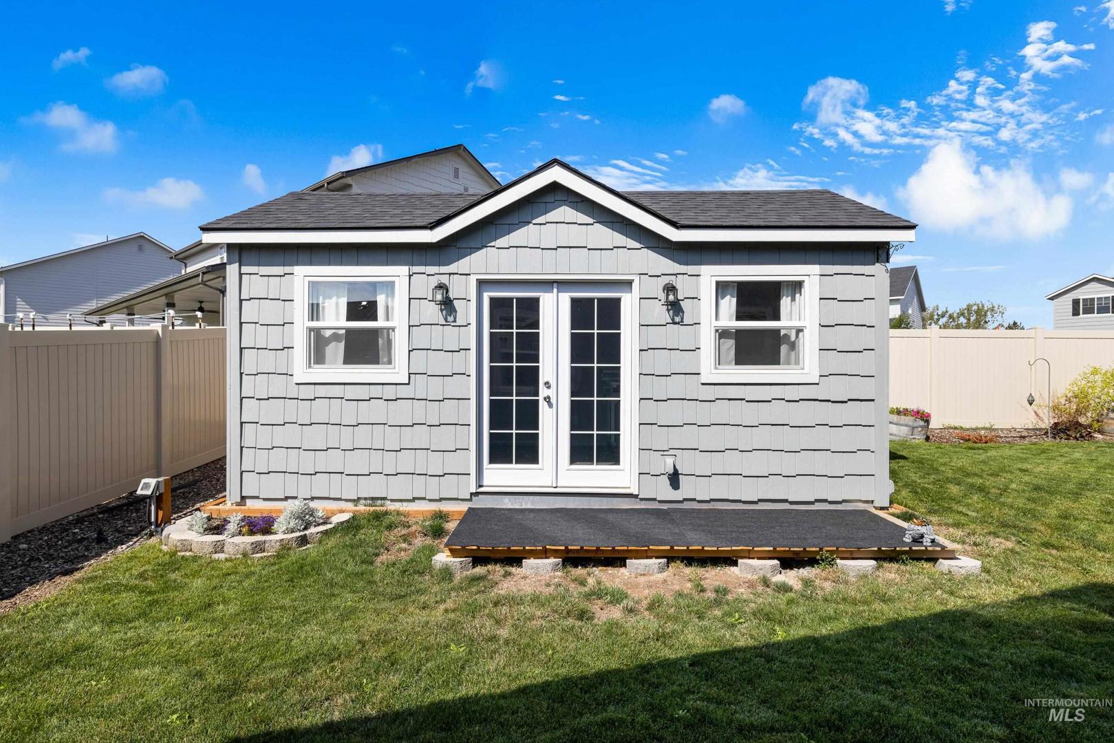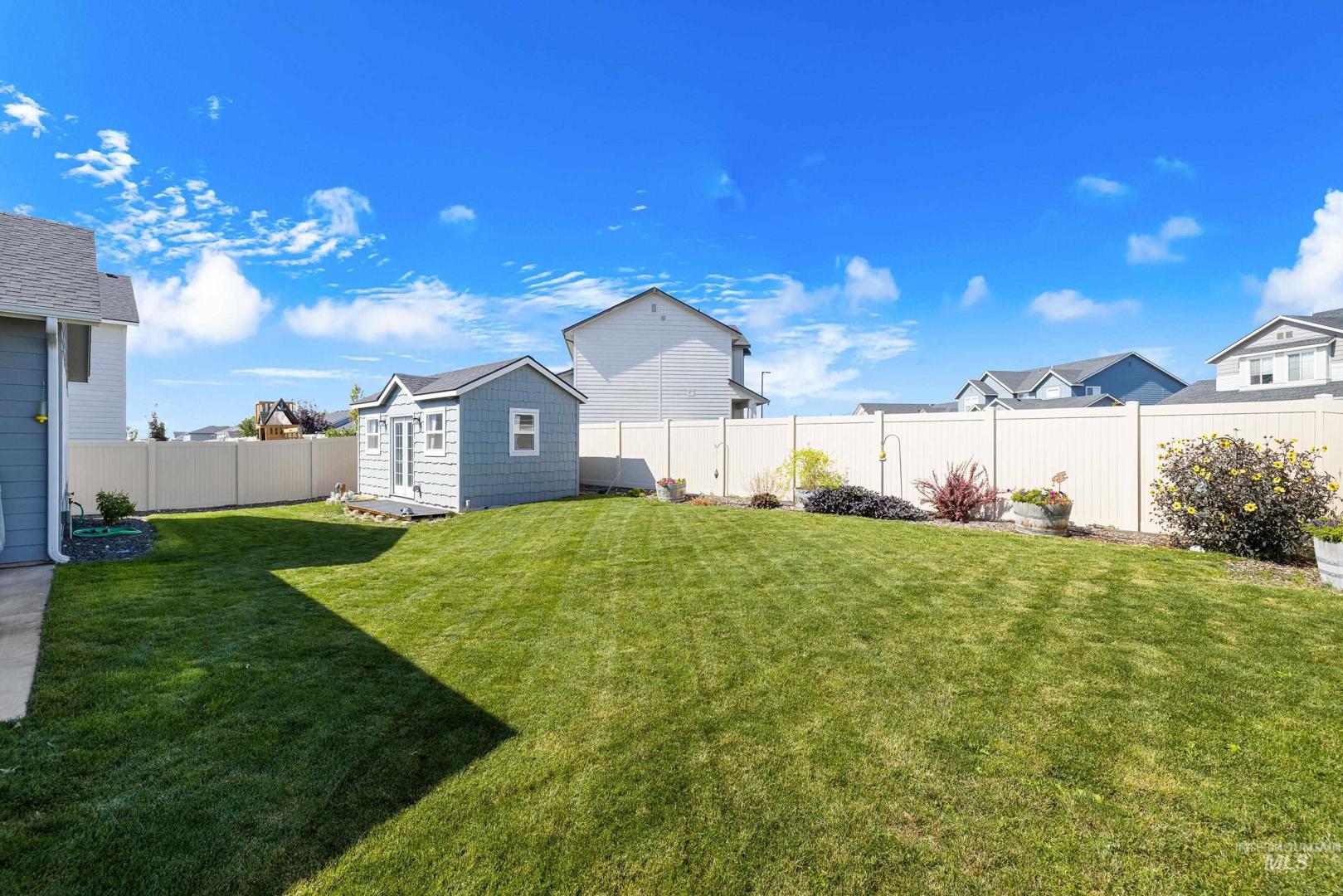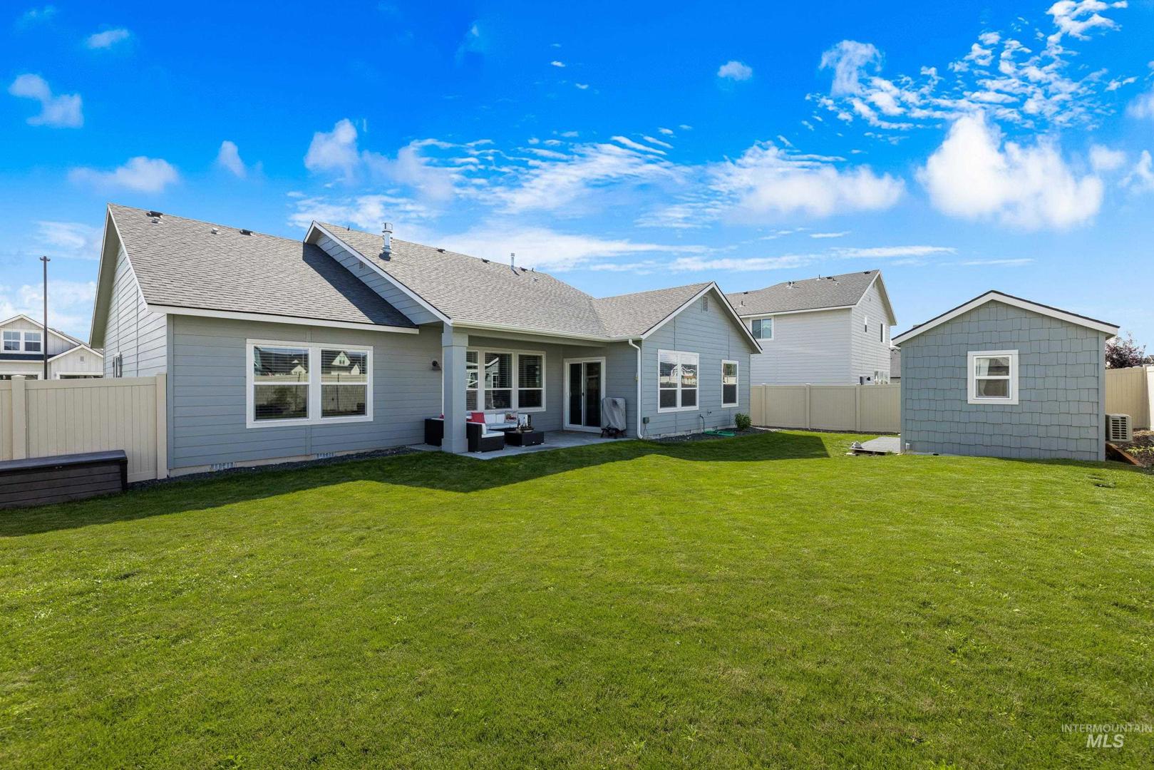Built in 2022 and still presenting like new, this single-level home offers a thoughtfully designed split floorplan that balances privacy and flow. The kitchen anchors the living space with sleek quartz countertops, ample storage, and an open layout that connects seamlessly to dining and gathering areas. A spacious three-car garage provides room for vehicles and hobbies, while a newly built 10x20 shed with full power, heating, and AC adds even more versatility—ideal as a workshop, office, or creative retreat. Positioned on a desirable corner lot, the property enjoys extra light and a sense of openness, complemented by a covered patio perfect for relaxing or entertaining year-round. Located just minutes from freeway access and downtown Meridian, you’ll find everyday convenience paired with modern comfort. Whether hosting friends, working from home, or enjoying a quiet evening, this residence offers a lifestyle that feels both elevated and easy.