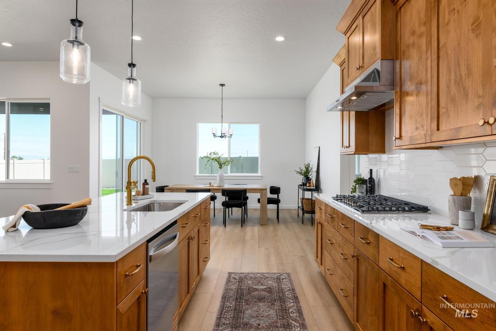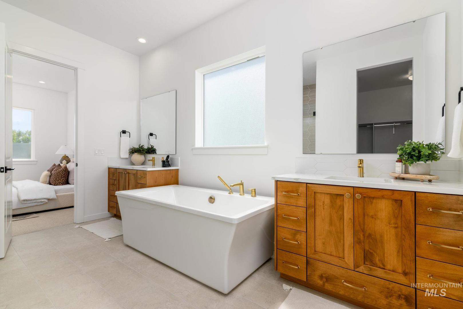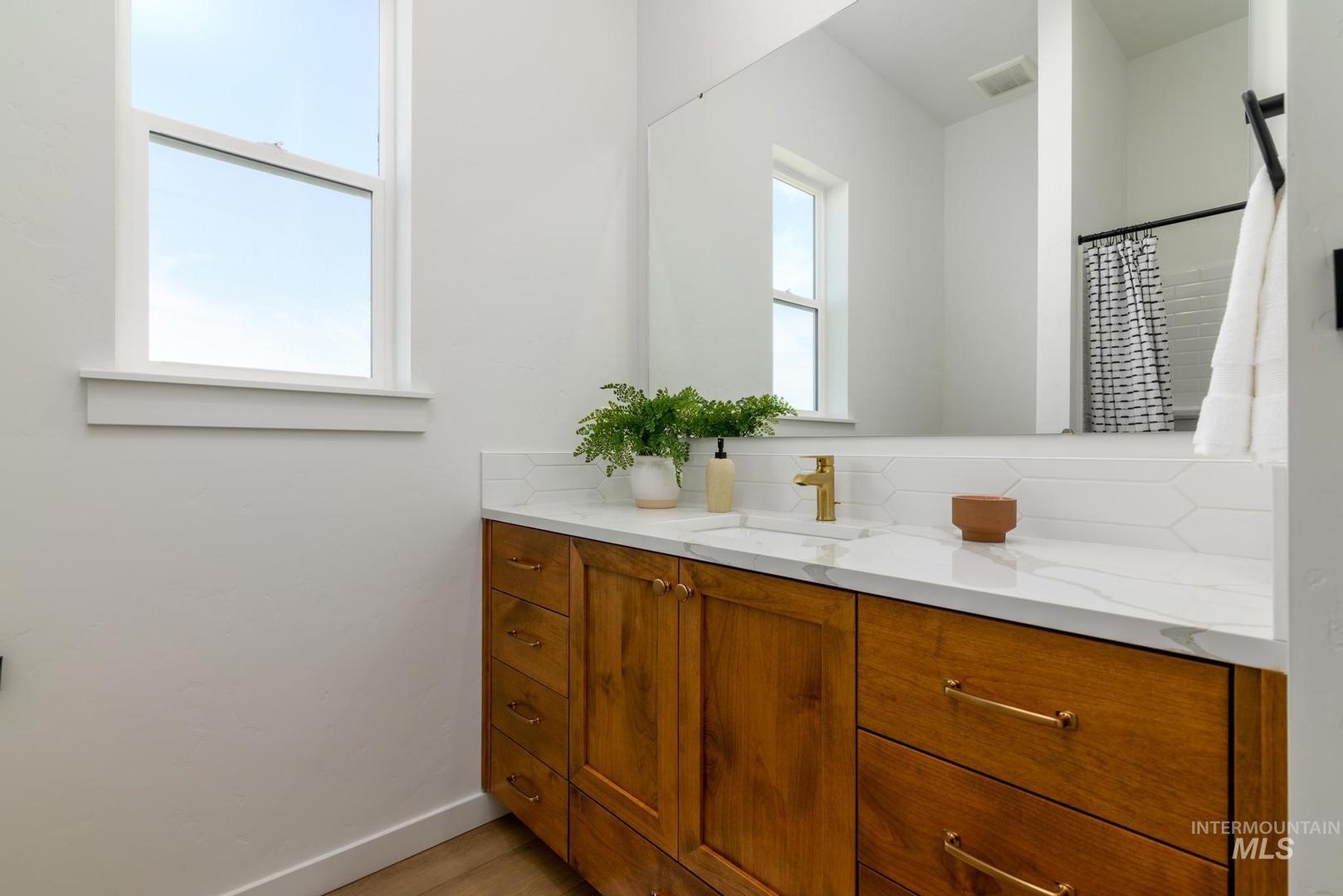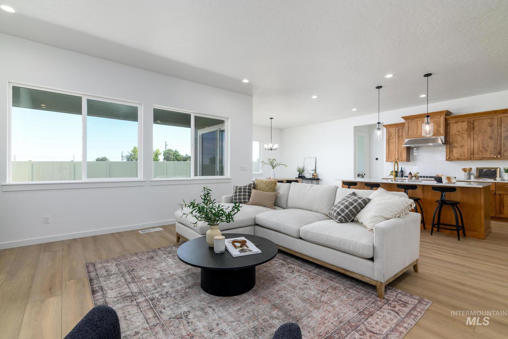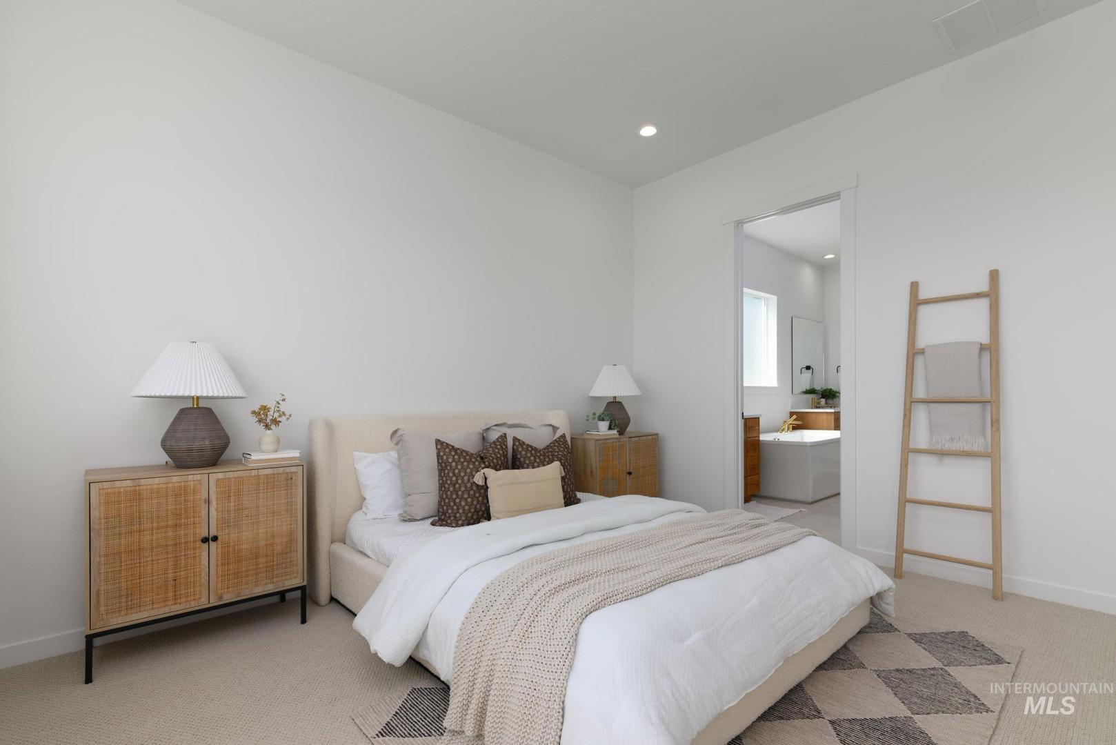 The Bannock exudes contemporary comfort and functionality, exemplified by its thoughtfully crafted single-story layout. A long foyer sets the stage, leading to a spacious great room seamlessly connected to the kitchen, casual dining area, and covered patio—an ideal setting for gatherings and relaxation. The kitchen is centered around a striking large center island and enhanced by its expansive walk-in pantry. The primary bedroom suite, nestled in the rear of the home, features a serene sanctuary complete with a luxurious walk-in closet and a primary bath with separate vanities, freestanding tub and a luxe shower. Off the foyer, three secondary bedrooms and two bathrooms offer privacy and comfort. Front and rear landscape included. Large 3 car garage. BTVAI
