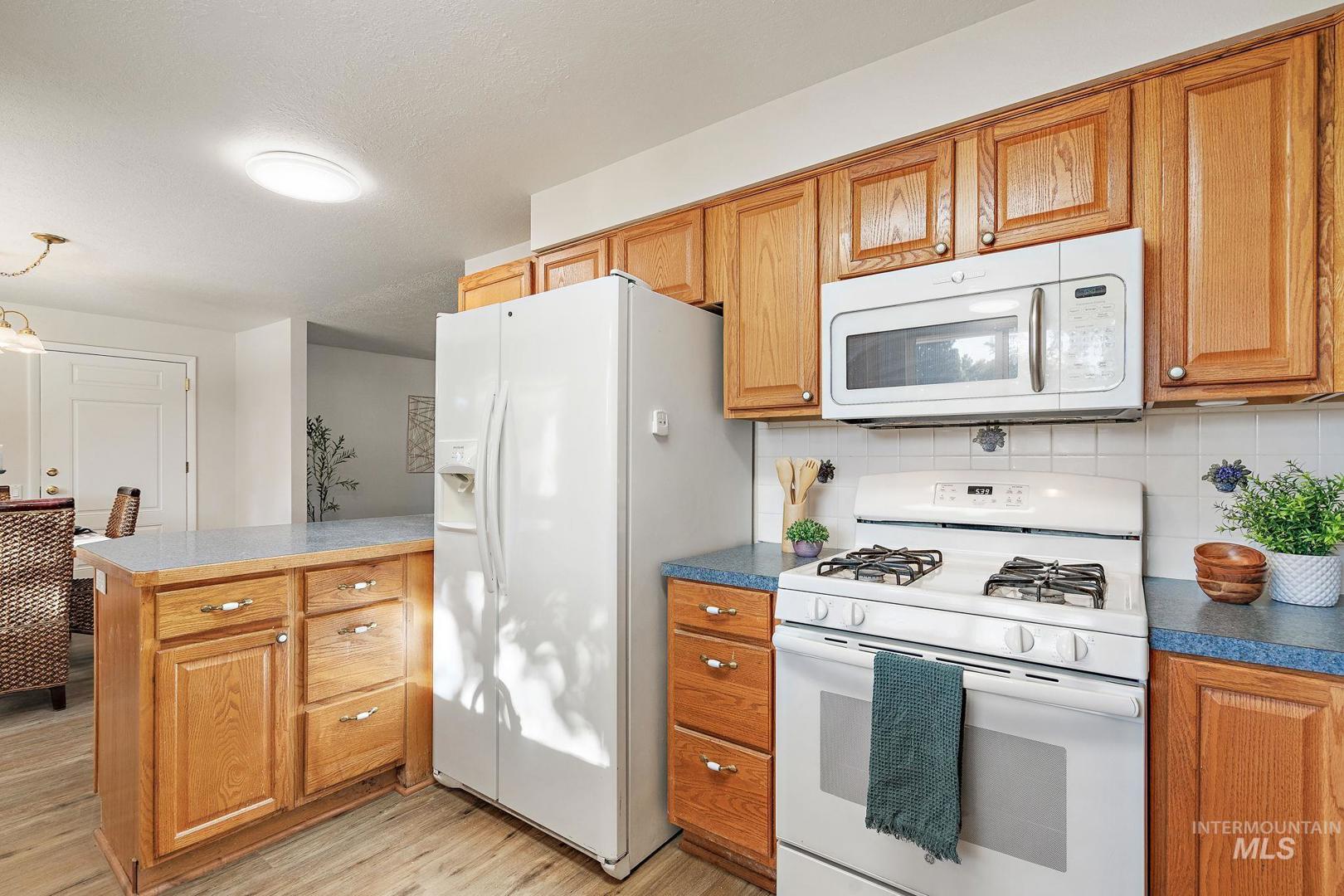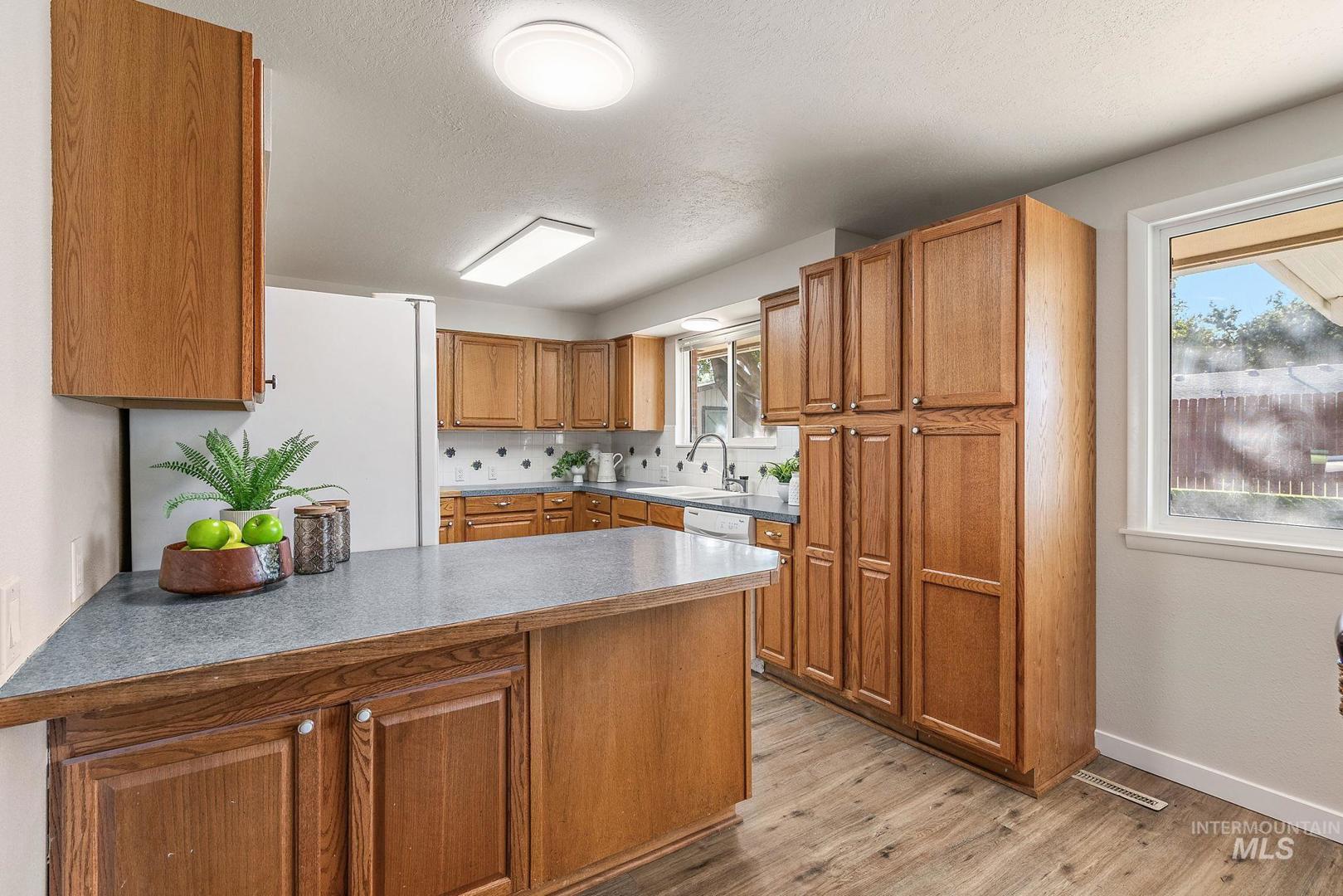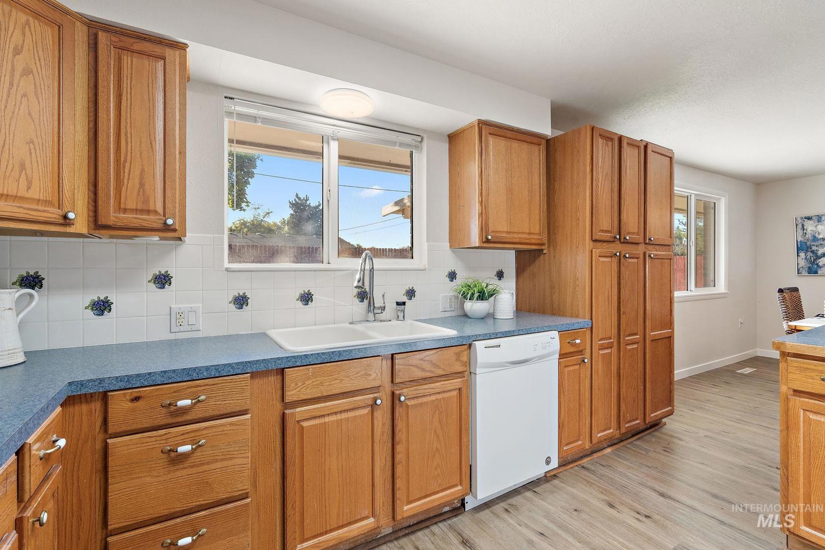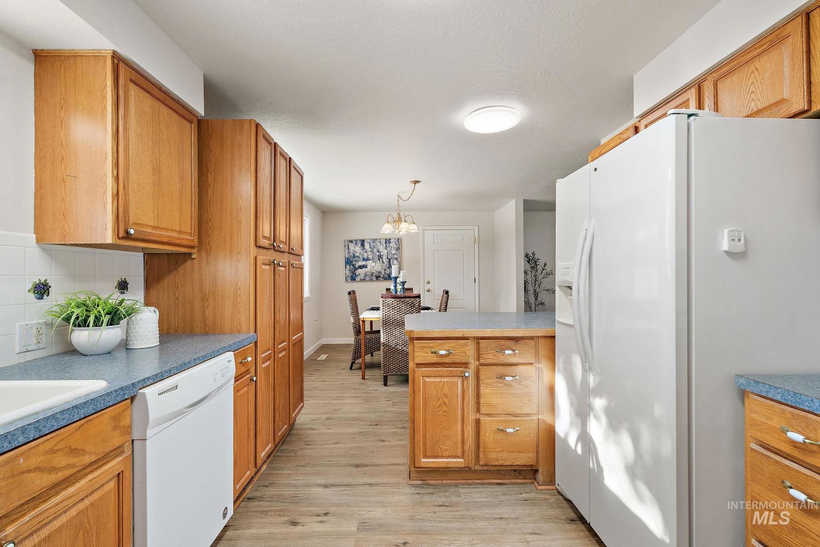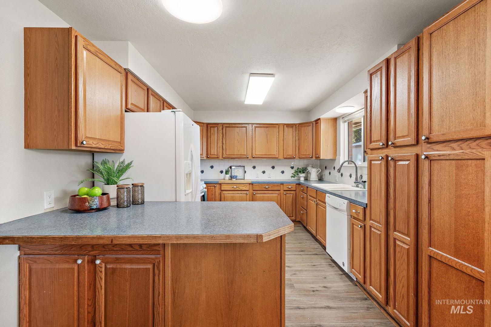 Tucked on a quiet dead-end street finishing in a cul-de-sac, this single-level home offers comfort and convenience: 4 bedrooms, 2 baths, and approx. 2,035 sq ft on a roomy quarter-acre lot. Freshly updated with full interior paint and new flooring. Everyday living extends outdoors to a covered patio and oversized concrete pad with gas stub—ideal for grilling and gatherings. The primary bath features a spacious, accessible shower. An oversized 2-car garage with workbench, backyard shed, 16x10 steel shop with power, and RV parking provide abundant storage. Fully fenced yard with irrigation and sprinklers. Refrigerator, washer, and dryer included for easy move-in. Brick exterior, central air, and gas heat ensure lasting comfort. Fantastic Caldwell location—near West Valley Medical Center, schools, shopping, Indian Creek Plaza, and quick I-84 access. Low-traffic setting with room to spread out—ideal for living or entertaining. Buyer to verify all information.