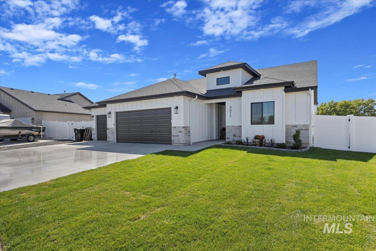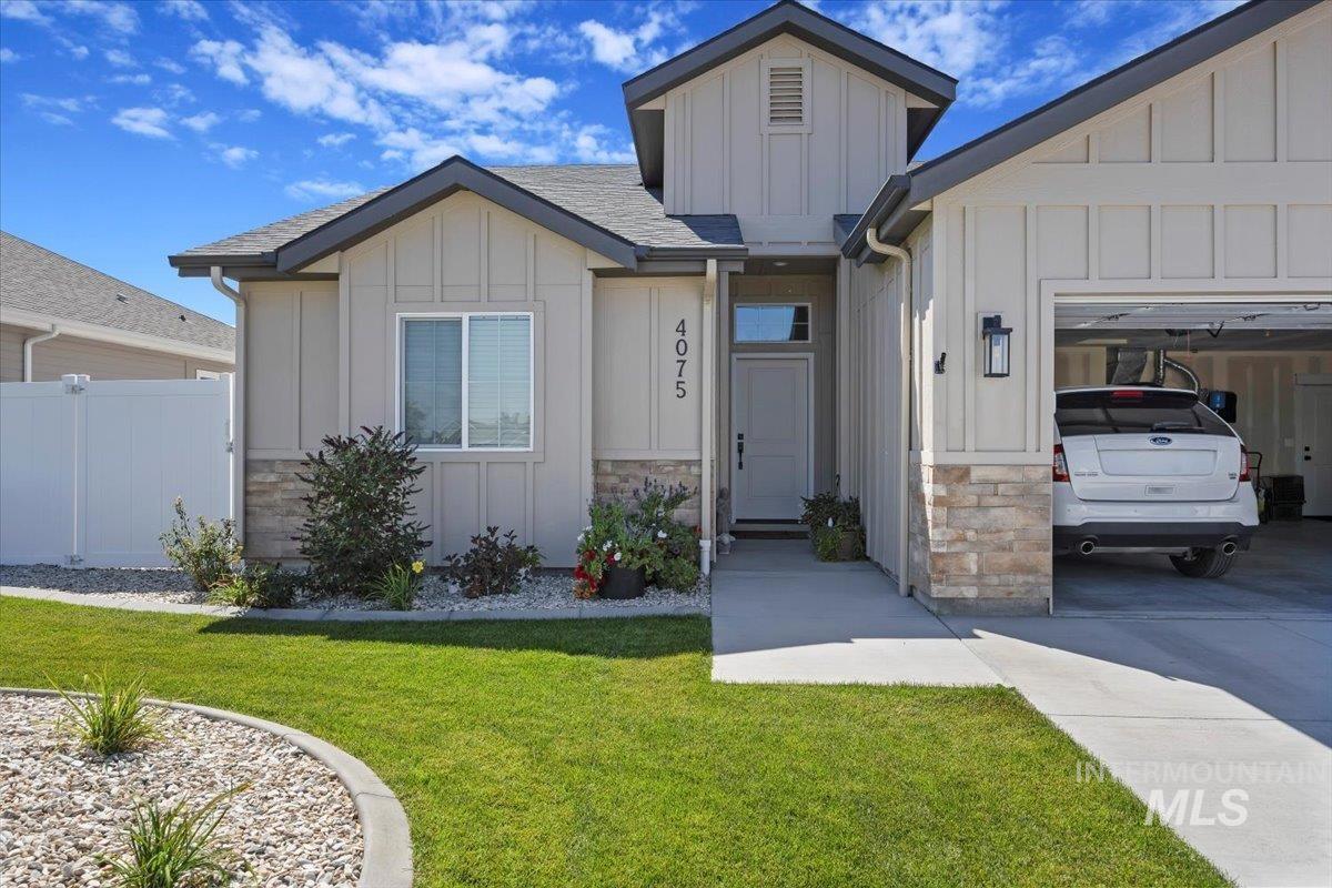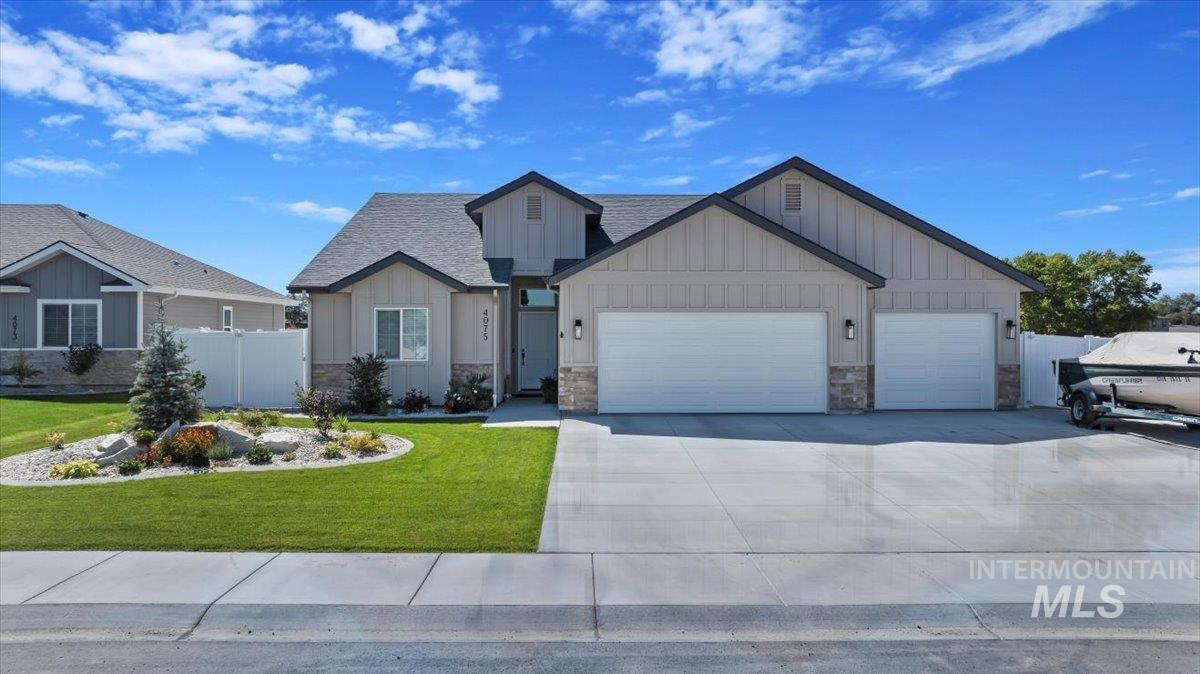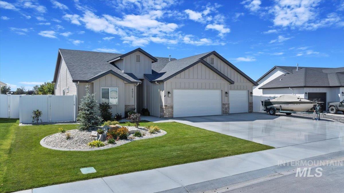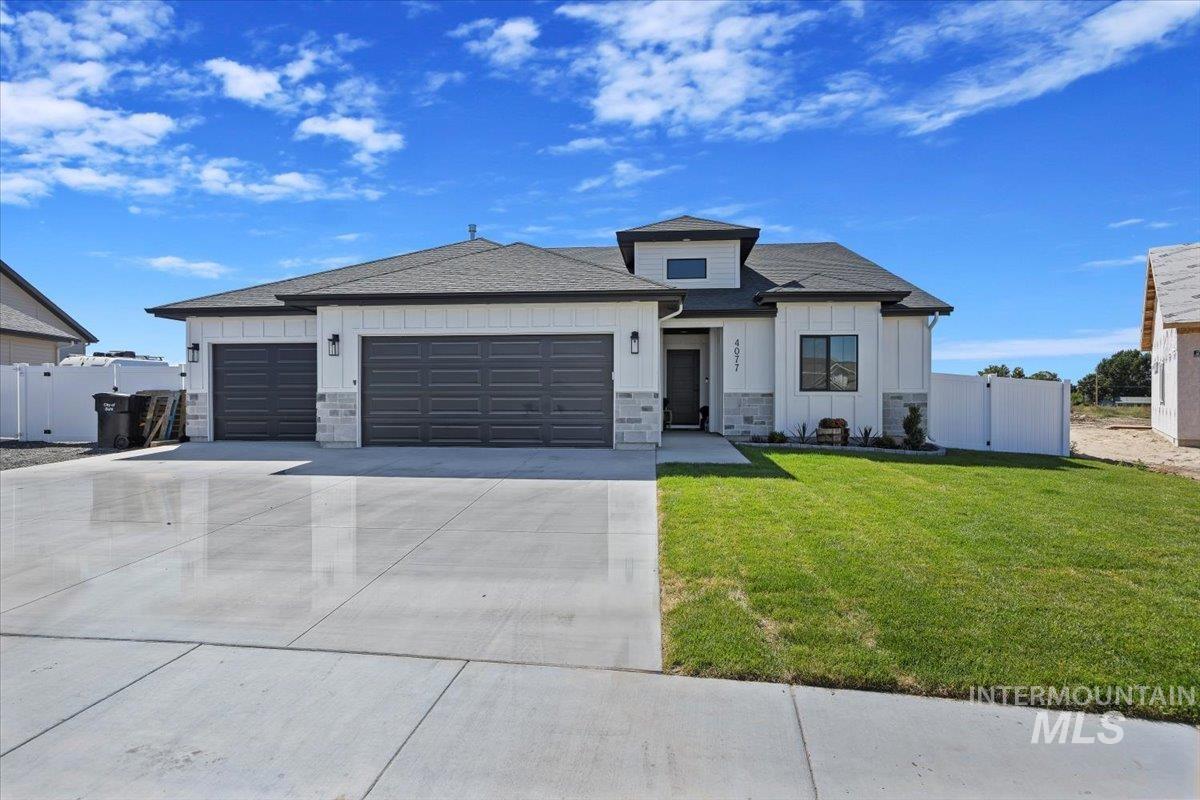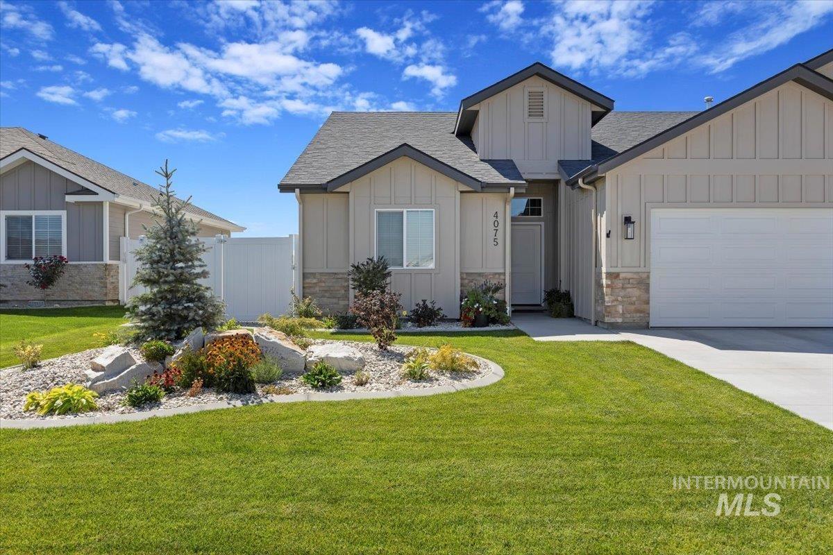 Welcome to this stunning 1,501 square foot residence, designed and built by Riverfront Custom Homes. This home features a spacious three-car garage, three bedrooms, and two full baths. Upon entering, you`ll be impressed by the ten-foot ceilings in the entry, family room, and dining, creating a sense of openness and grandeur. The home is filled with natural light, thanks to the large windows that adorn the living spaces. The kitchen is a highlight, offering custom alder cabinetry, a corner pantry, a large island, and elegant quartz countertops. It`s a perfect blend of style and functionality, ideal for both everyday cooking and guests. This home is also designed with accessibility in mind, featuring wide hallways and 36" wide doors and a roll-in tiles shower, making it ideal for wheelchair users. The east facing back yard will allow for many afternoon spending time in the shaded back yard. The exterior boasts Masonite wood siding complemented by beautiful stone accents, adding to its curb appeal. Pics similar