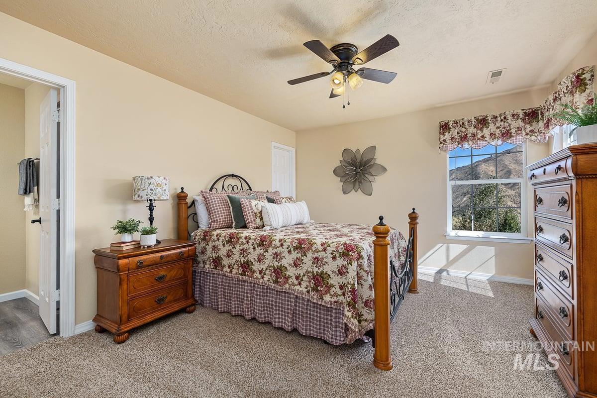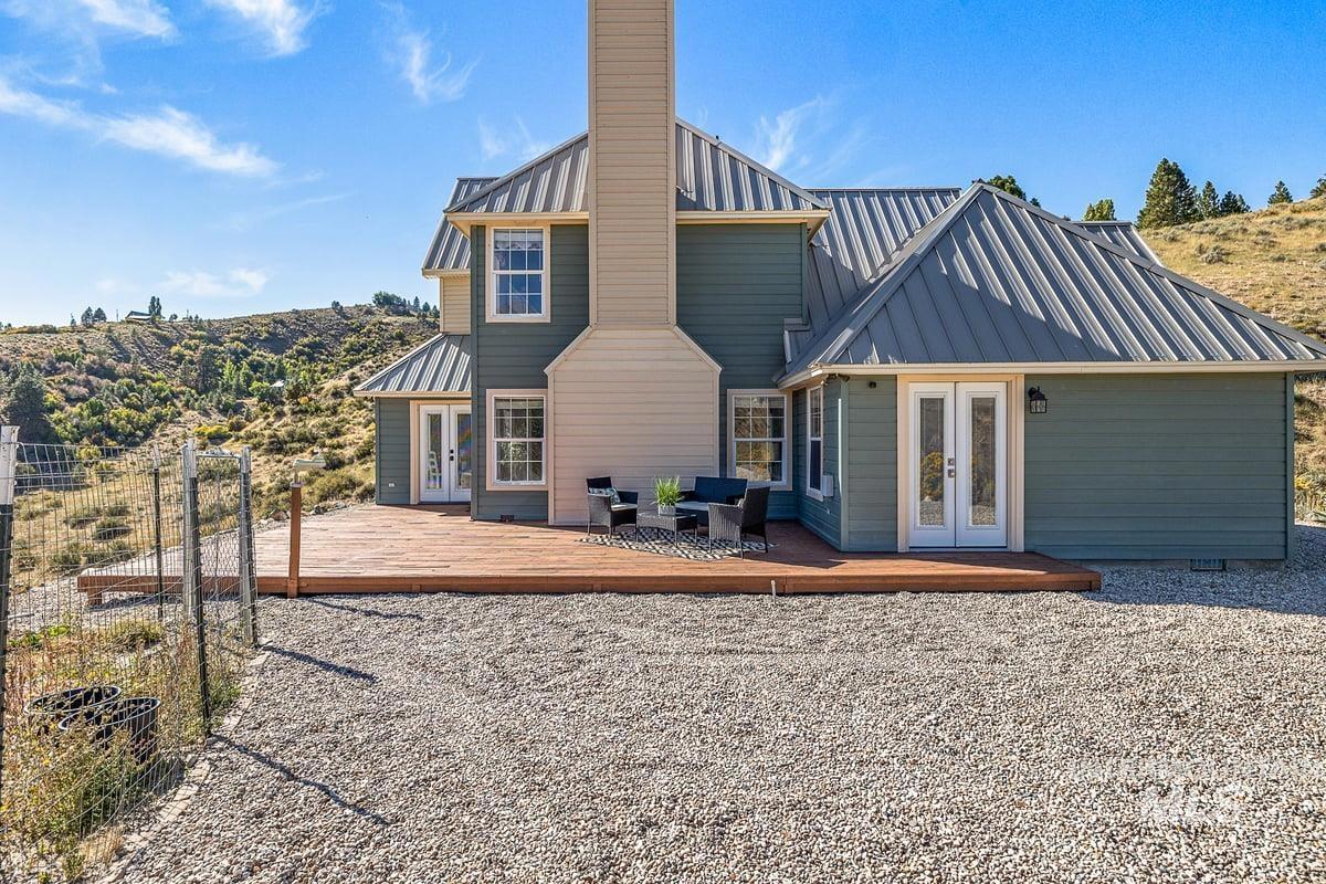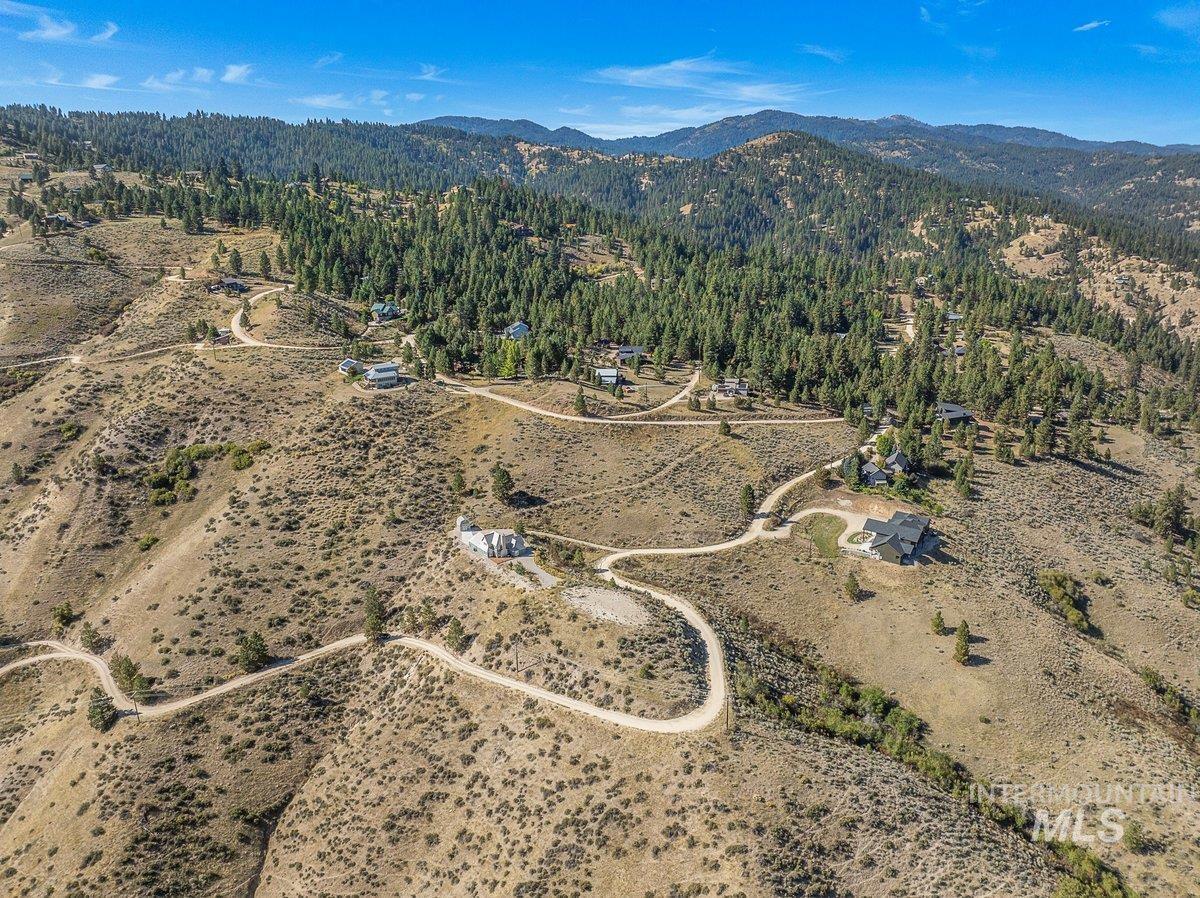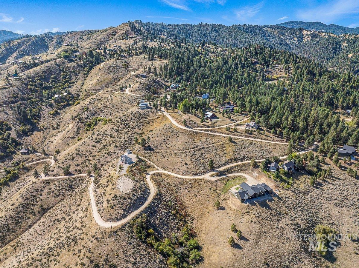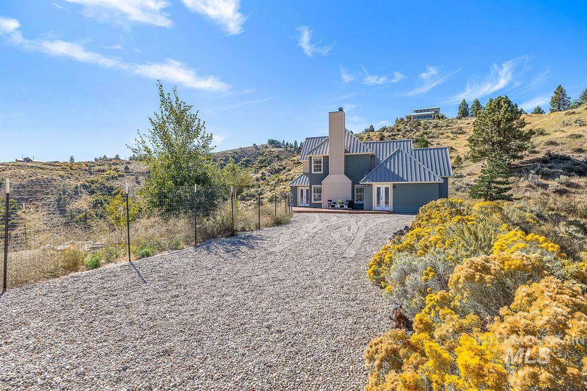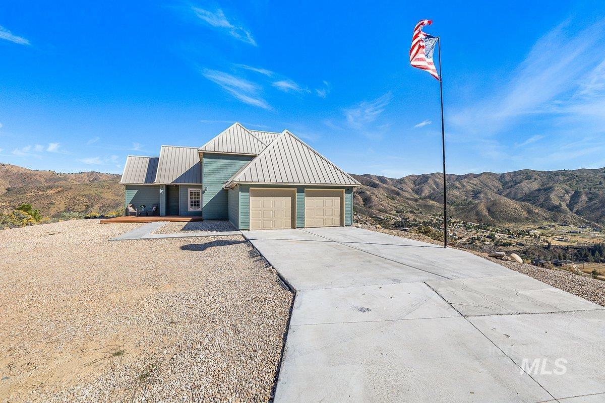 Welcome home to your very own private retreat on 5.42 acres which offers stunning 360° views, peace, and privacy—just 35-40 mins from downtown Boise. Enjoy the spacious living room with a cozy wood-burning fireplace, built-in wood storage, and abundant natural light throughout. The main-level primary suite features tall ceilings, private patio access w/ French doors, large walk-in closet with built-ins, Bluetooth speaker, and a walk-in shower. Each bedroom includes a walk-in closet and ceiling fan, and a Jack & Jill bathroom upstairs blends comfort and functionality. The kitchen offers a butler pantry, storage closet, breakfast bar, all electric utilities and direct patio access w/ French doors to the newly painted deck for easy indoor-outdoor living and entertaining. The upstairs loft adds versatility and extra space. The fully equipped laundry room includes a washer, dryer, sink, hanging rod, and storage for added convenience. This charming home also has a 14x14 shed with loft, fenced garden with a peach tree, metal roof, Blink security system, newer heat pump, added attic insulation, new exterior paint, newer flooring, and an oversized front porch to view the abundant wildlife and mountains!