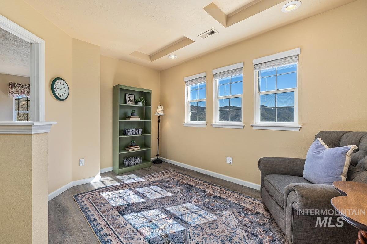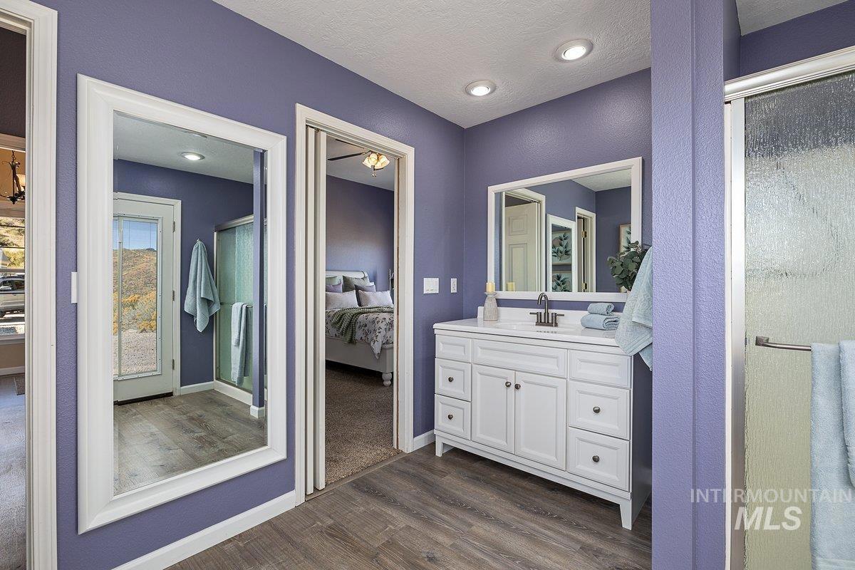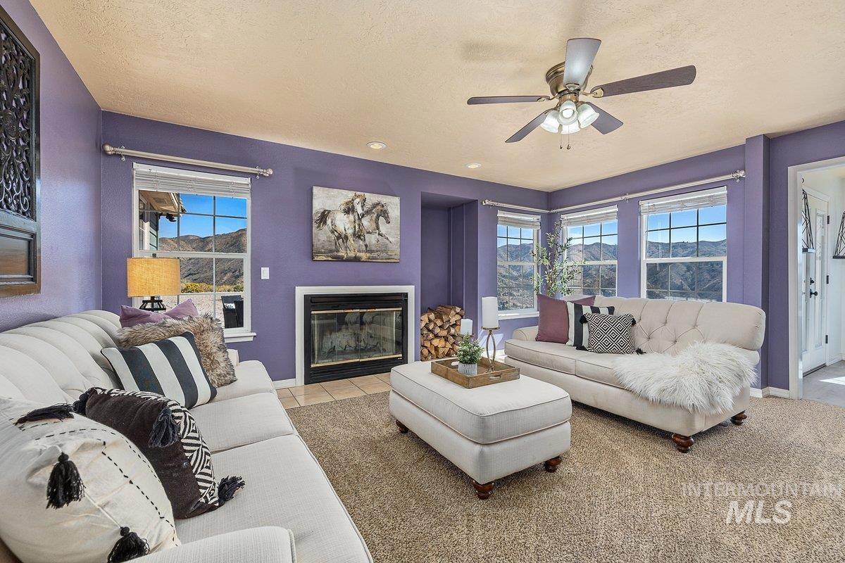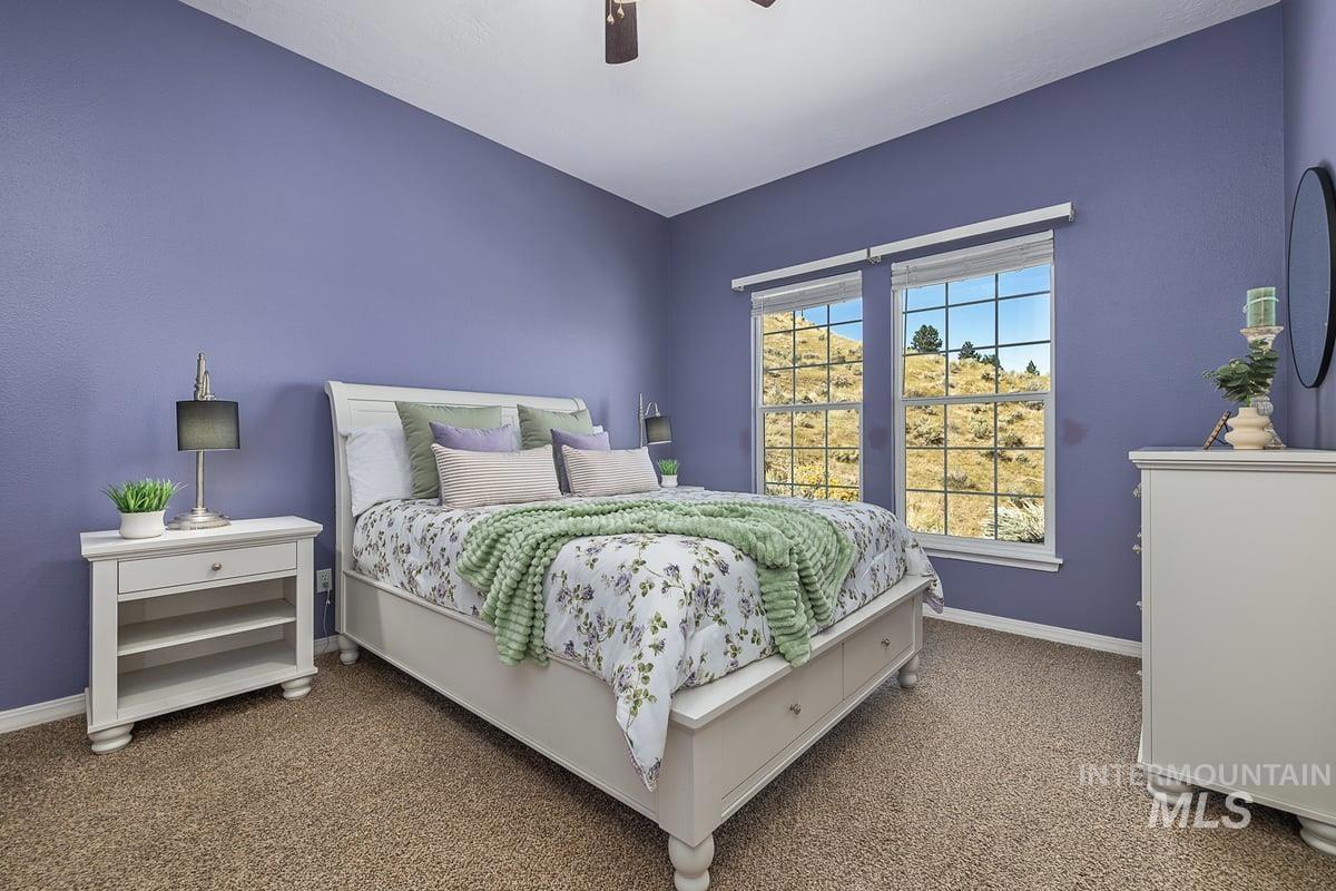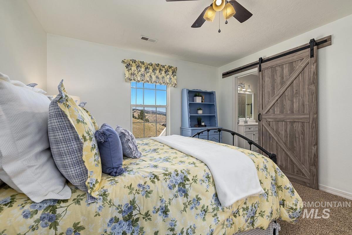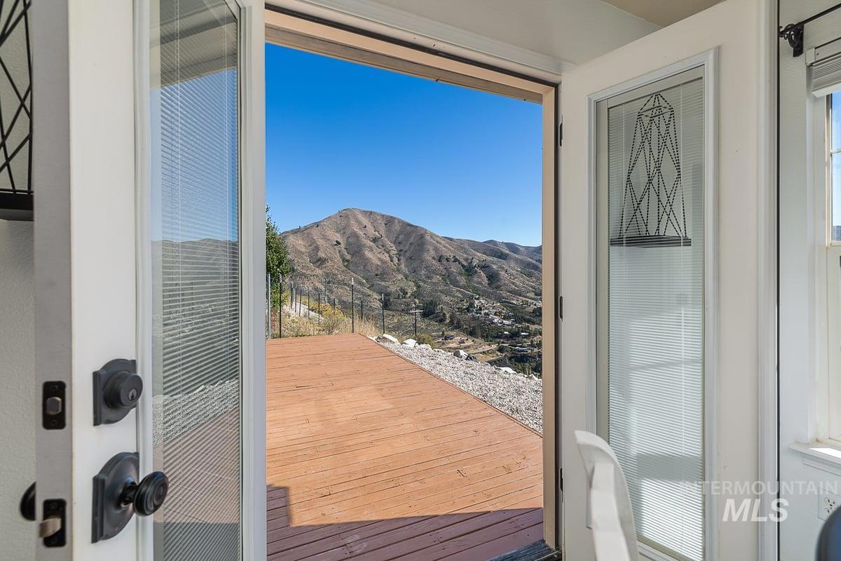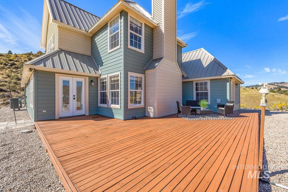 Welcome home to your very own private retreat on 5.42 acres which offers stunning 360° views, peace, and privacy—just 35-40 mins from downtown Boise. Enjoy the spacious living room with a cozy wood-burning fireplace, built-in wood storage, and abundant natural light throughout. The main-level primary suite features tall ceilings, private patio access w/ French doors, large walk-in closet with built-ins, Bluetooth speaker, and a walk-in shower. Each bedroom includes a walk-in closet and ceiling fan, and a Jack & Jill bathroom upstairs blends comfort and functionality. The kitchen offers a butler pantry, storage closet, breakfast bar, all electric utilities and direct patio access w/ French doors to the newly painted deck for easy indoor-outdoor living and entertaining. The upstairs loft adds versatility and extra space. The fully equipped laundry room includes a washer, dryer, sink, hanging rod, and storage for added convenience. This charming home also has a 14x14 shed with loft, fenced garden with a peach tree, metal roof, Blink security system, newer heat pump, added attic insulation, new exterior paint, newer flooring, and an oversized front porch to view the abundant wildlife and mountains!