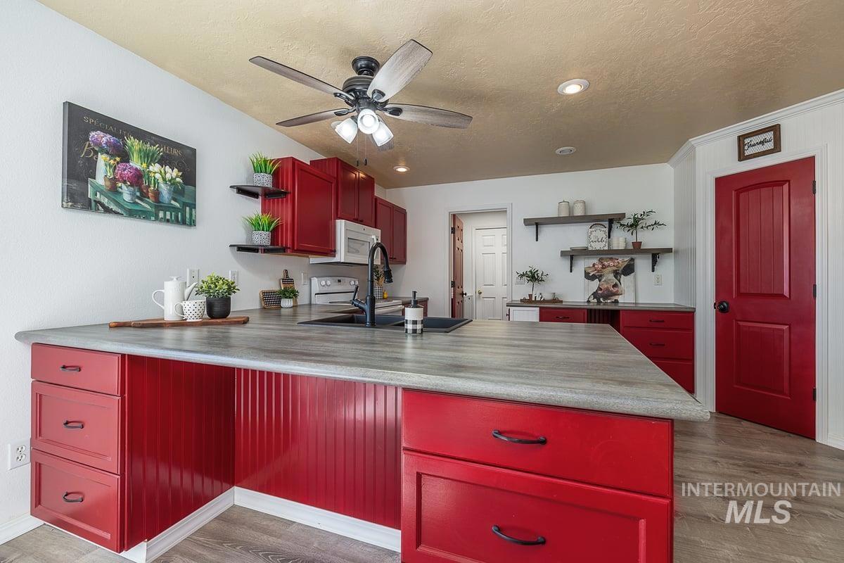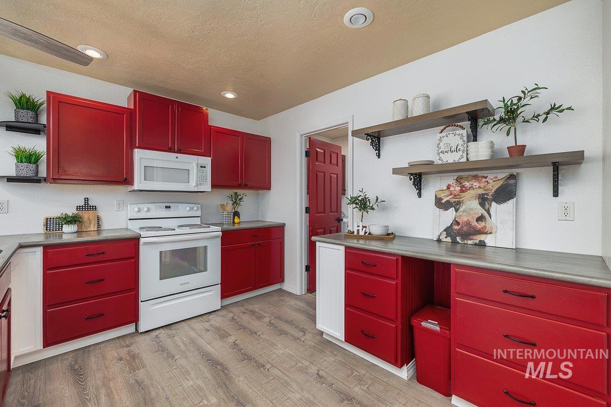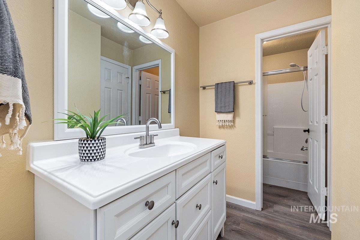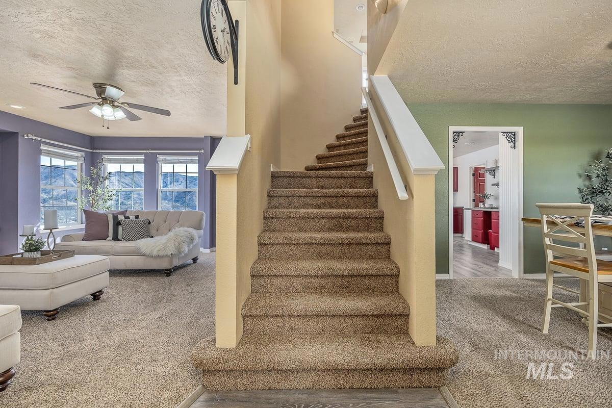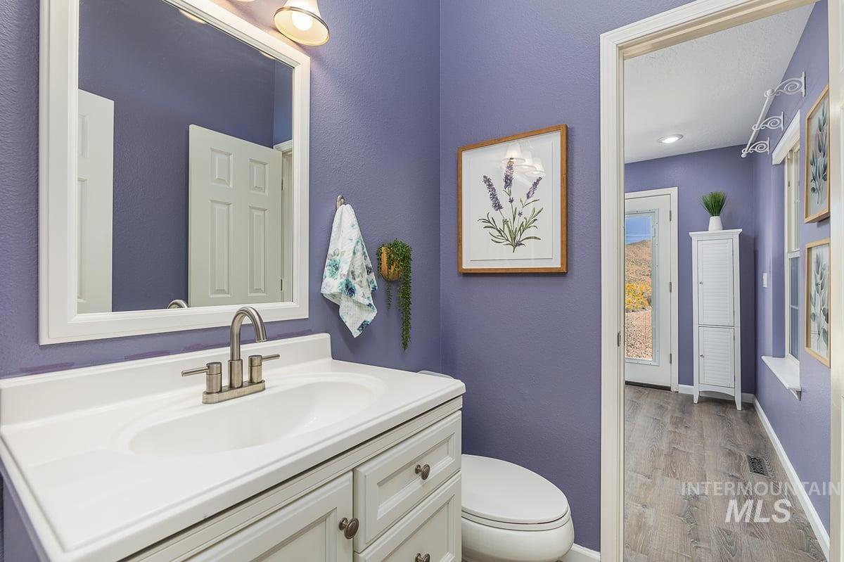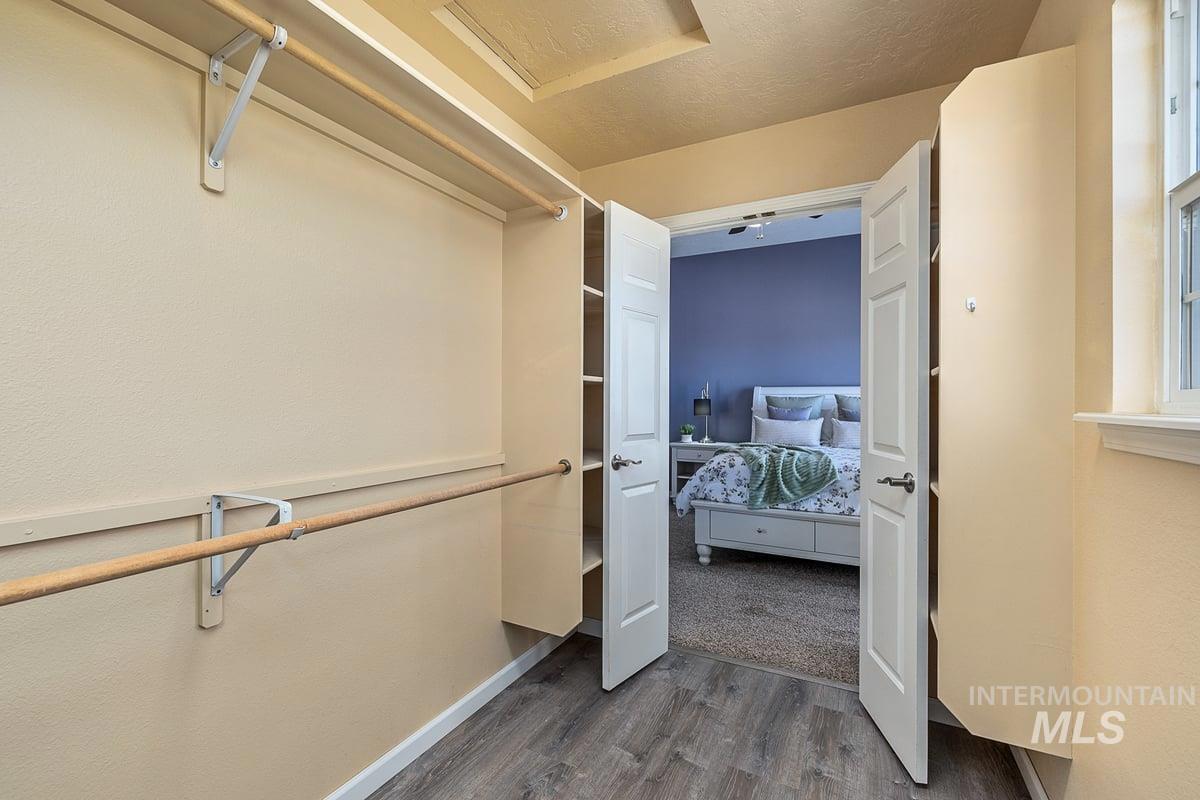 Welcome home to your very own private retreat on 5.42 acres which offers stunning 360° views, peace, and privacy—just 35-40 mins from downtown Boise. Enjoy the spacious living room with a cozy wood-burning fireplace, built-in wood storage, and abundant natural light throughout. The main-level primary suite features tall ceilings, private patio access w/ French doors, large walk-in closet with built-ins, Bluetooth speaker, and a walk-in shower. Each bedroom includes a walk-in closet and ceiling fan, and a Jack & Jill bathroom upstairs blends comfort and functionality. The kitchen offers a butler pantry, storage closet, breakfast bar, all electric utilities and direct patio access w/ French doors to the newly painted deck for easy indoor-outdoor living and entertaining. The upstairs loft adds versatility and extra space. The fully equipped laundry room includes a washer, dryer, sink, hanging rod, and storage for added convenience. This charming home also has a 14x14 shed with loft, fenced garden with a peach tree, metal roof, Blink security system, newer heat pump, added attic insulation, new exterior paint, newer flooring, and an oversized front porch to view the abundant wildlife and mountains!