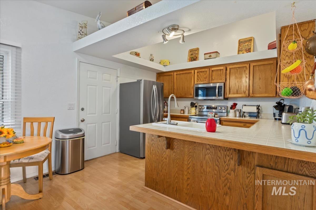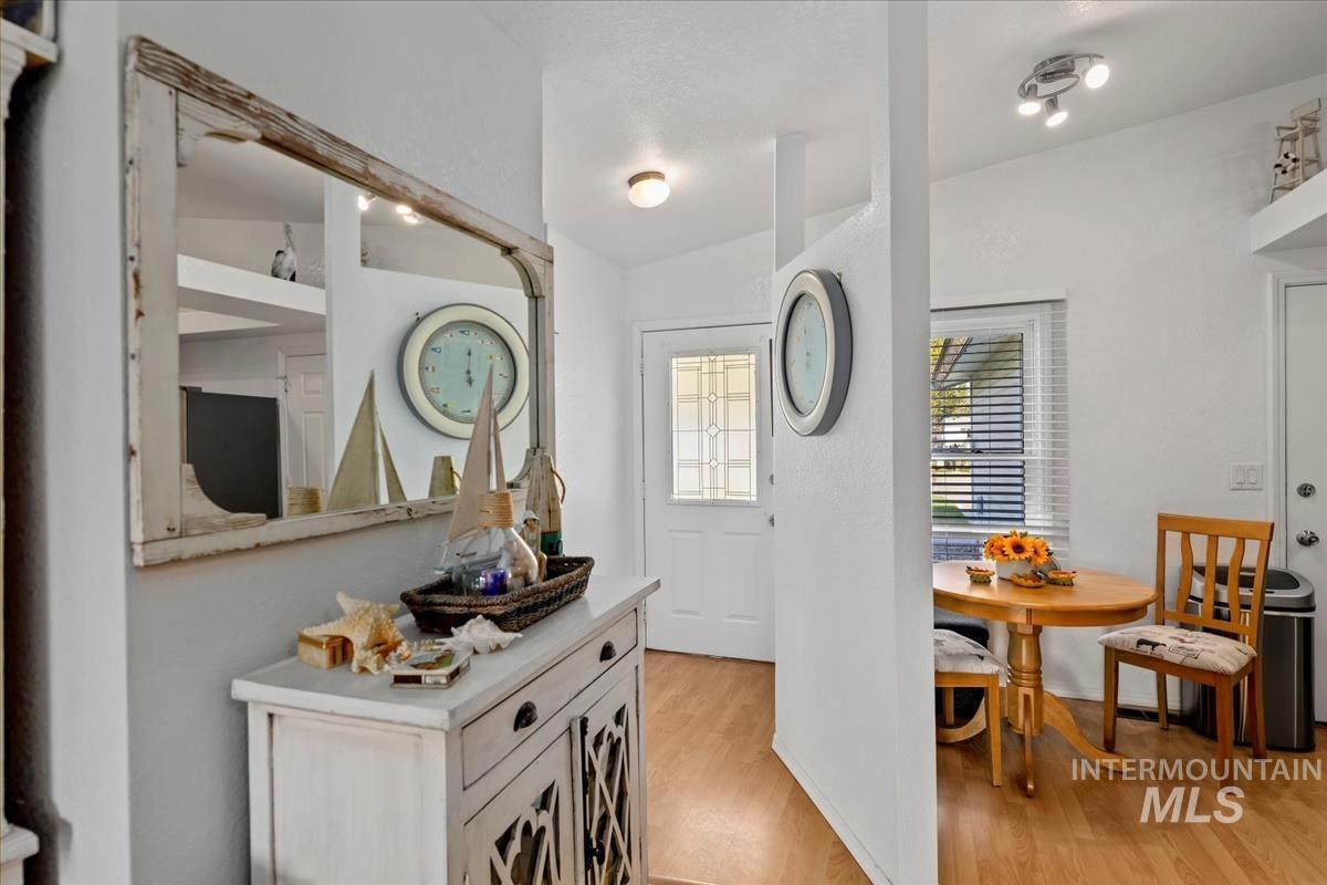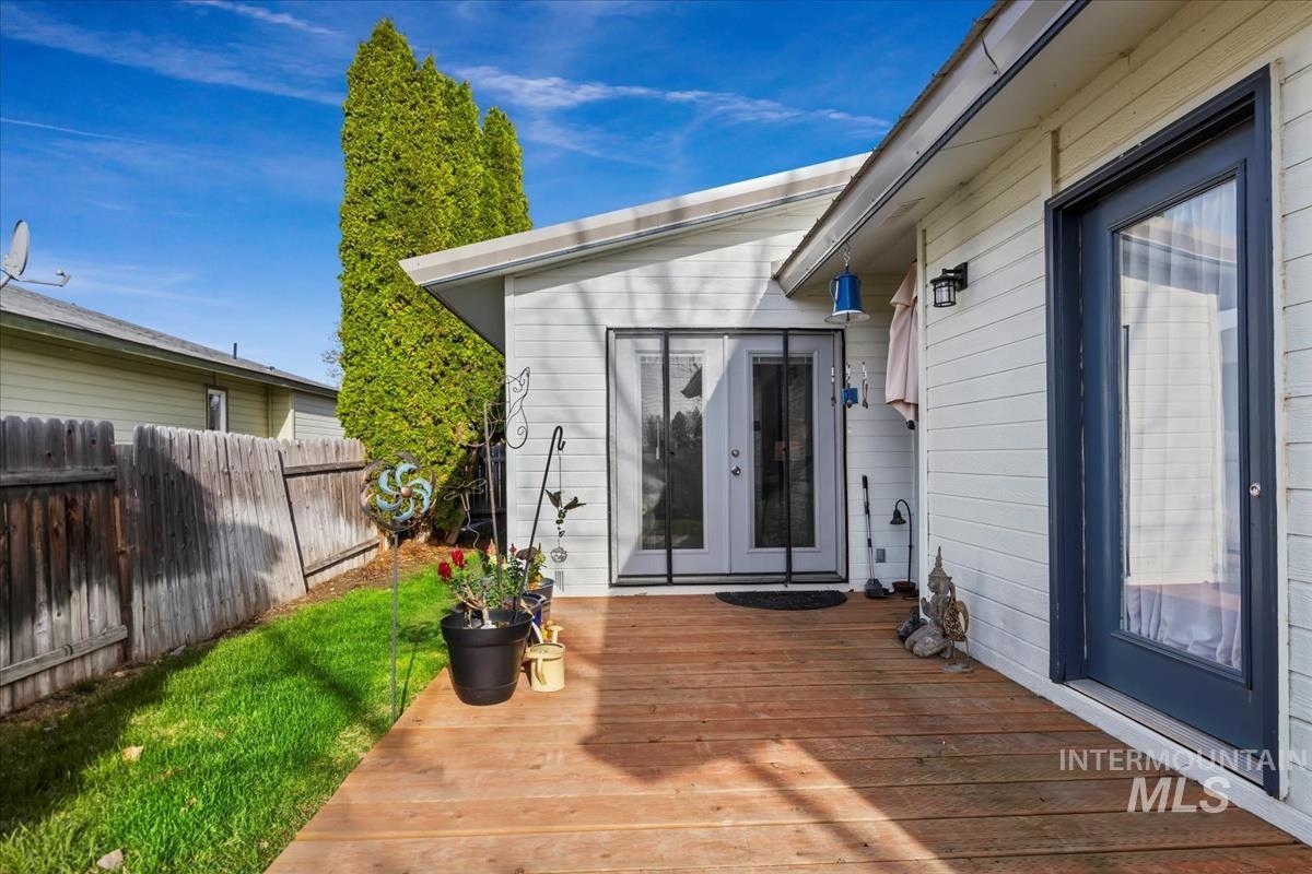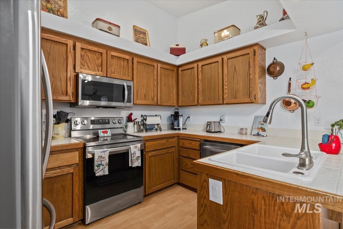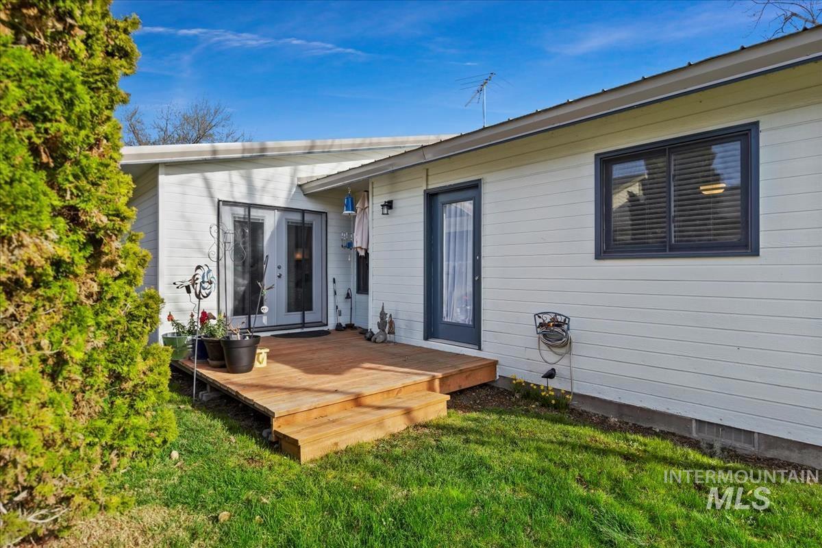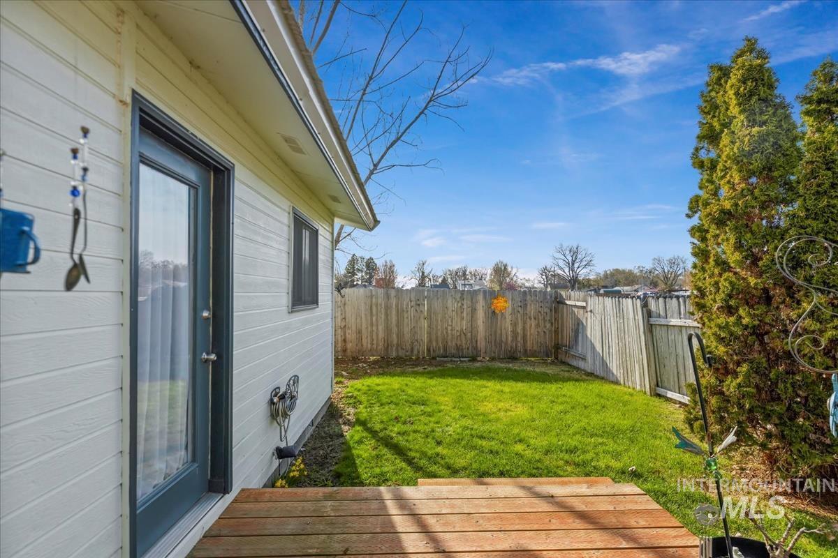 Charming and beautifully maintained 2-bedroom, 2-bath townhome with an oversized 1-car garage, located in a quiet, convenient neighborhood. This inviting home features a durable metal roof, a stained redwood deck, and a fully fenced backyard offering privacy and low-maintenance landscaping. Inside, enjoy vaulted ceilings, updated lighting, a spacious kitchen with tiled countertops, oak cabinetry, and stainless appliances including a smooth-top range, dishwasher, and microwave. The primary suite offers deck access, a large window for natural light, and an ensuite bath with a glass-door shower. Laminate floors flow throughout the main living areas, with a dedicated laundry space and added storage for convenience. Ideal for low-maintenance living or a lock-and-leave lifestyle, this charming home blends comfort and functionality. Nearby parks, shops, and dining add to the convenience, while the peaceful setting and thoughtful layout make it a true gem in the heart of Payette.