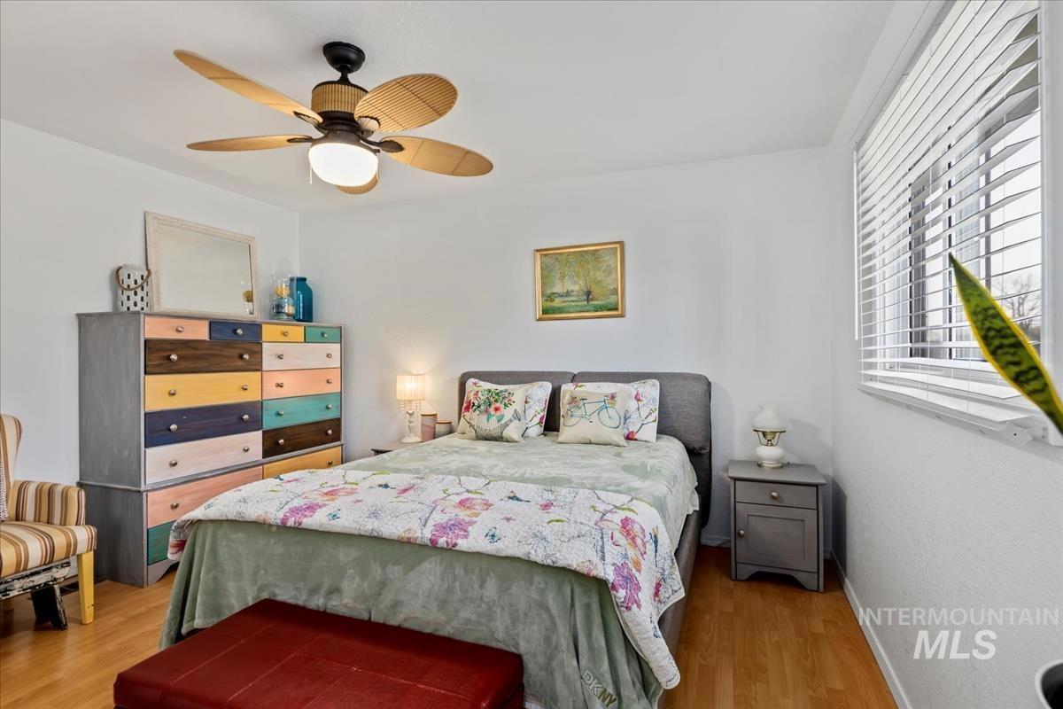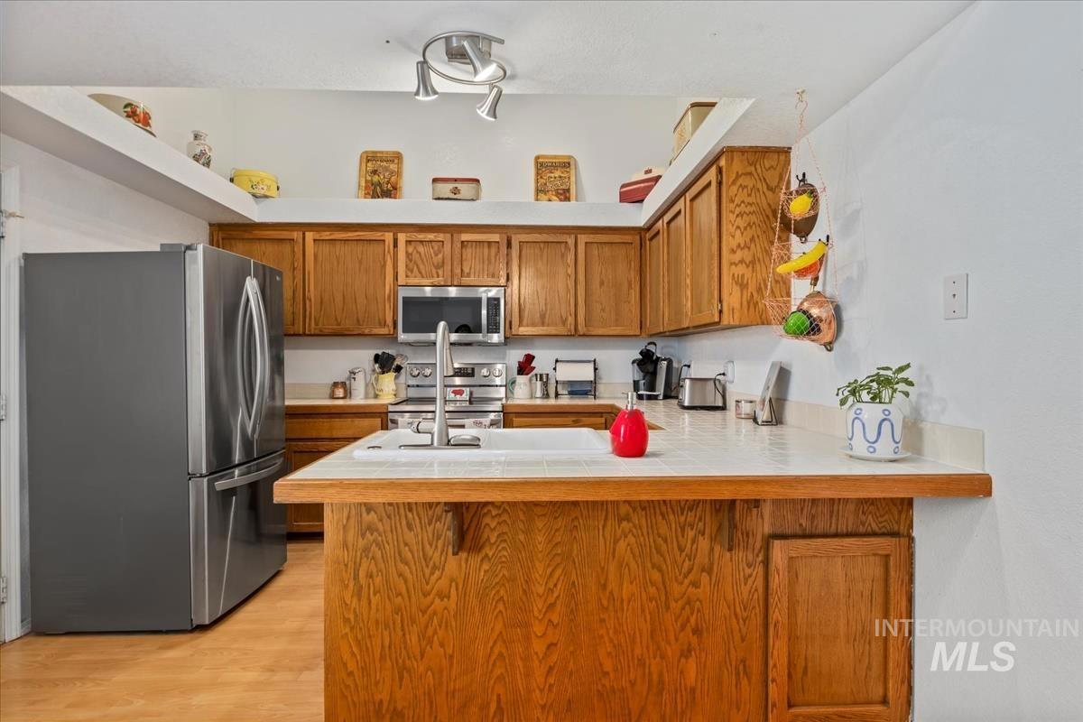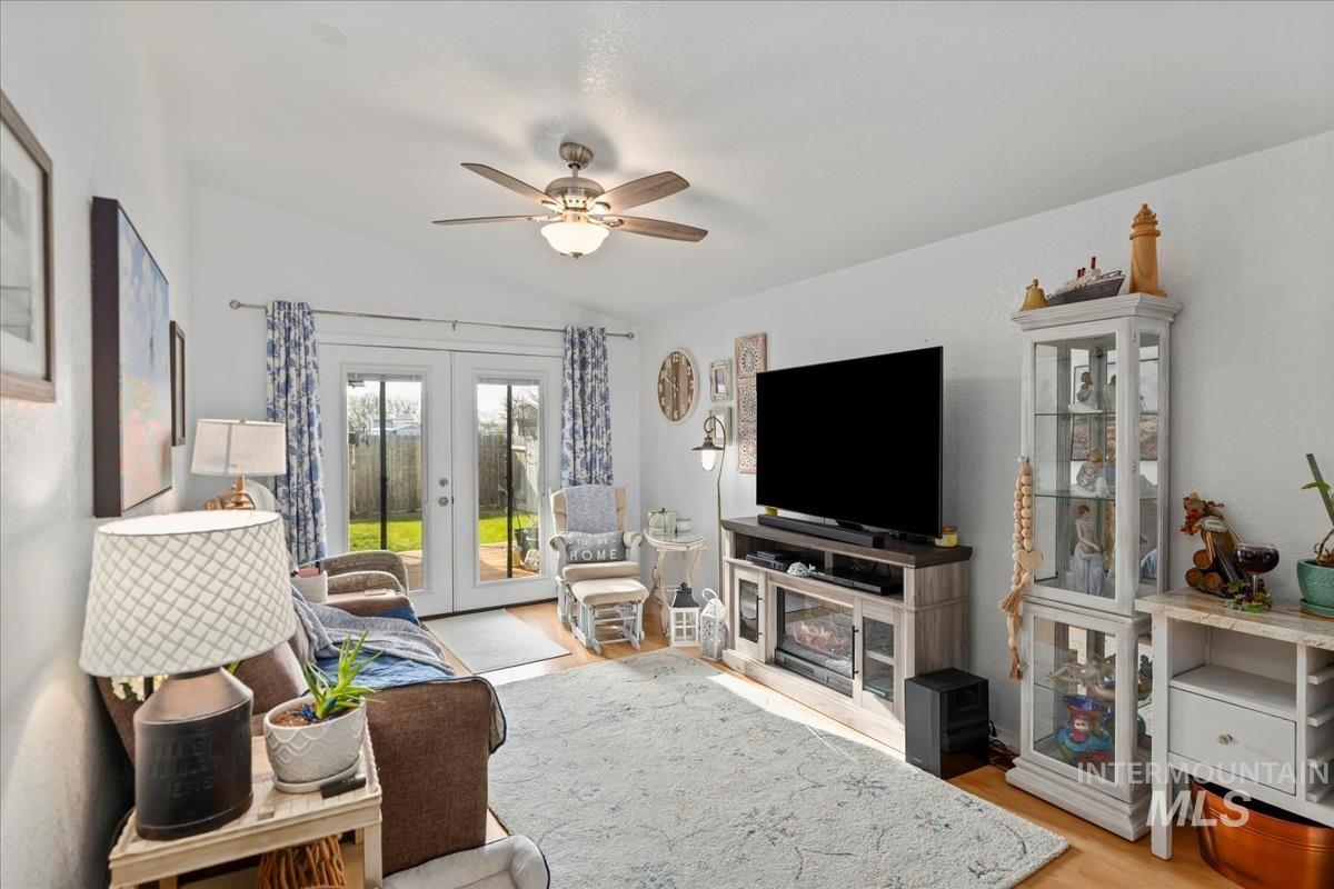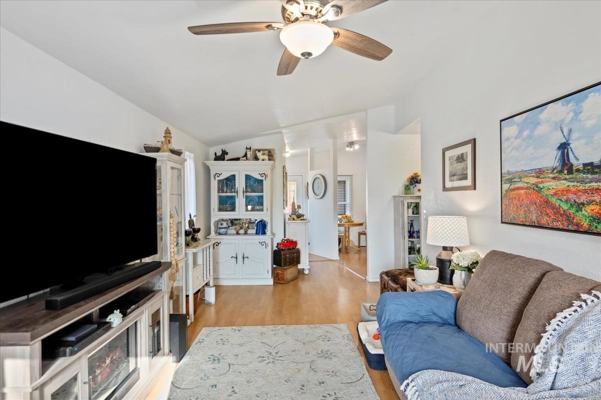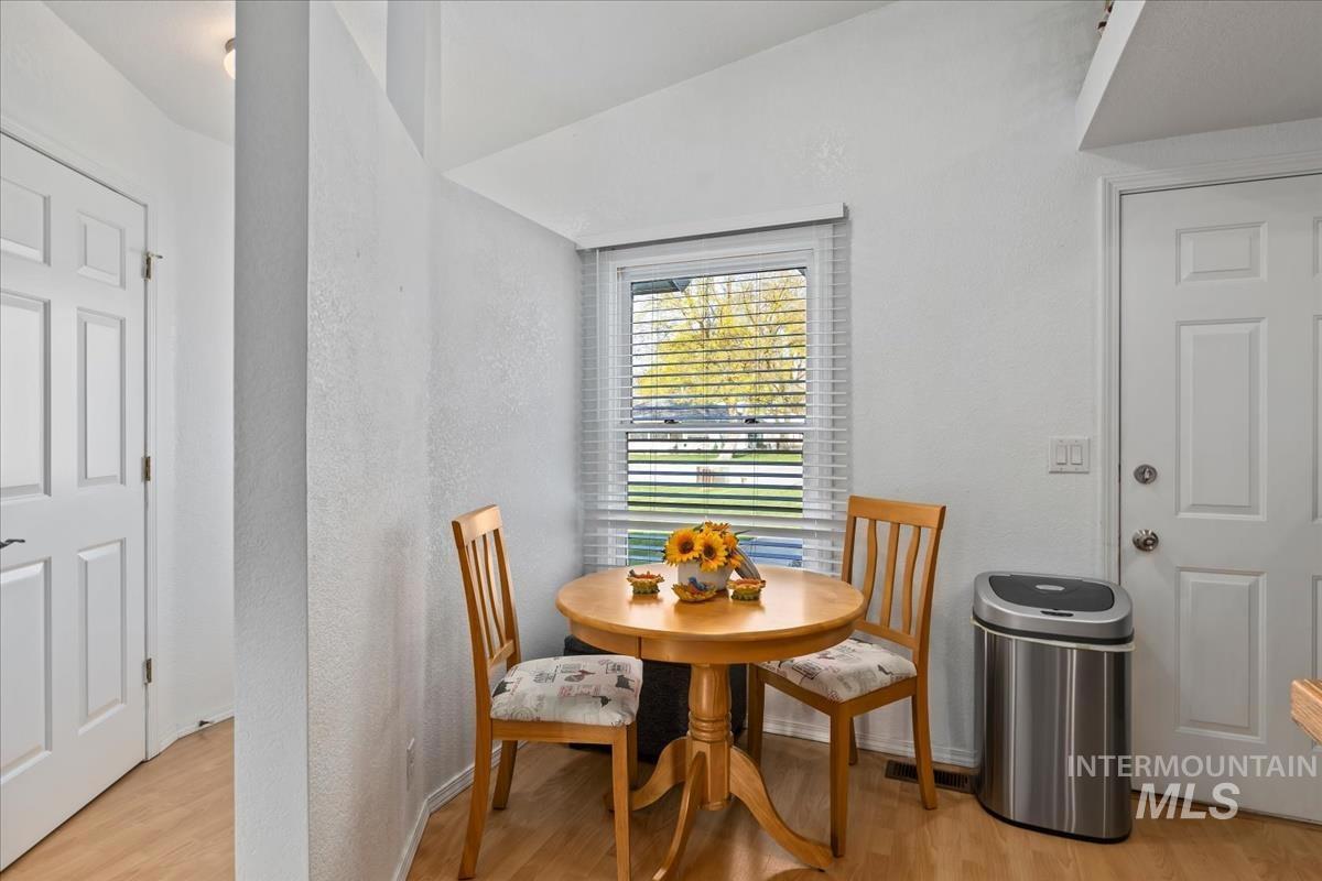Charming and beautifully maintained 2-bedroom, 2-bath townhome with an oversized 1-car garage, located in a quiet, convenient neighborhood. This inviting home features a durable metal roof, a stained redwood deck, and a fully fenced backyard offering privacy and low-maintenance landscaping. Inside, enjoy vaulted ceilings, updated lighting, a spacious kitchen with tiled countertops, oak cabinetry, and stainless appliances including a smooth-top range, dishwasher, and microwave. The primary suite offers deck access, a large window for natural light, and an ensuite bath with a glass-door shower. Laminate floors flow throughout the main living areas, with a dedicated laundry space and added storage for convenience. Ideal for low-maintenance living or a lock-and-leave lifestyle, this charming home blends comfort and functionality. Nearby parks, shops, and dining add to the convenience, while the peaceful setting and thoughtful layout make it a true gem in the heart of Payette.
