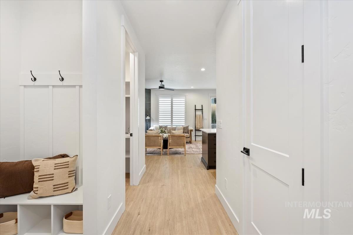 This beautifully designed 3 bed, 3 bath Sterling Homes residence in the heart of Eagle features an open and efficient floor plan with everyday living on the main level, including two bedrooms, two full baths, and an inviting great room that flows seamlessly into the kitchen with quartz countertops, stainless steel appliances, and soft-close cabinetry. Upstairs, a private suite with its own bath offers the perfect retreat for guests, in-laws, or a home office. Step outside to a covered patio and fenced yard ideal for relaxing or entertaining. Located in the highly rated West Ada School District, this home is close to Seven Oaks Elementary, Eagle Middle, and Eagle High. Enjoy nearby walking paths, the Boise River Greenbelt, Eagle Island State Park, and the renowned Eagle Hills Golf Course, where you can play a round, dine with friends, or take in stunning views. With modern comfort and access to top schools, trails, golf, and dining, this home delivers the best of Eagle living.