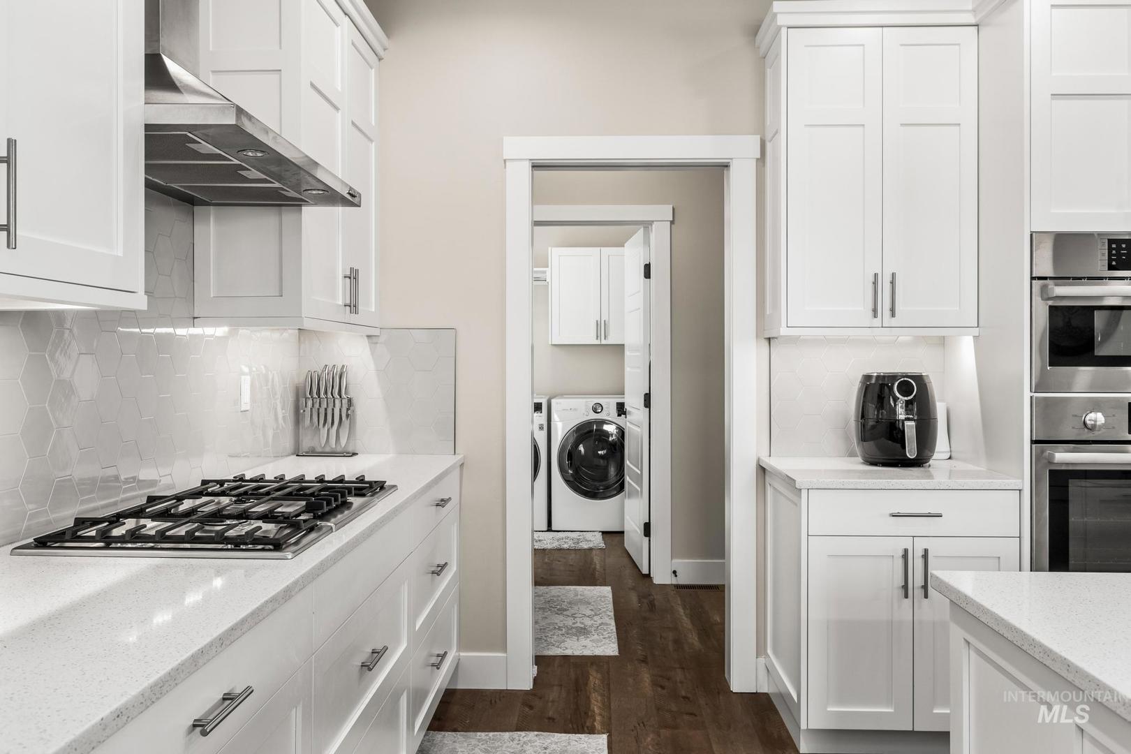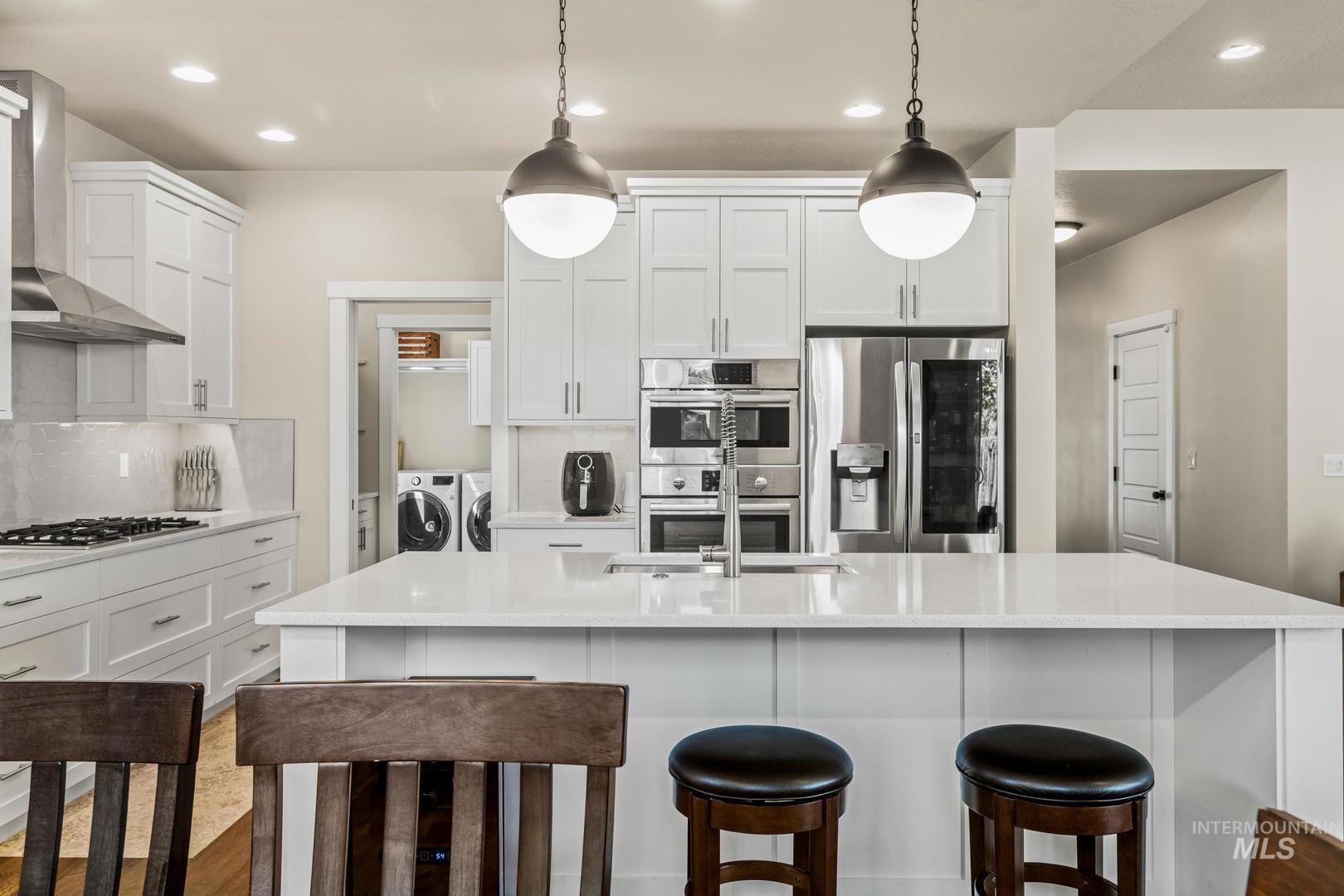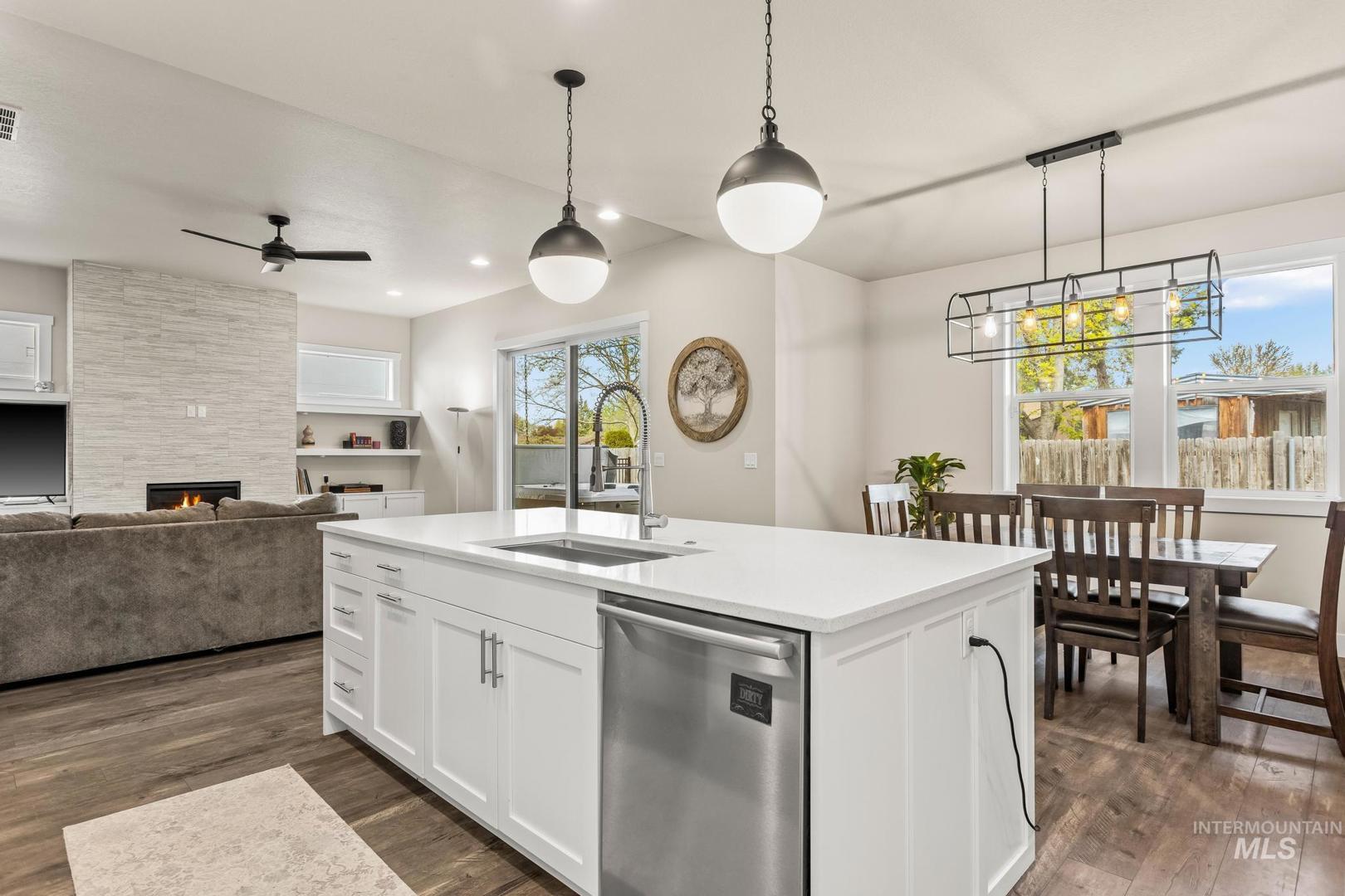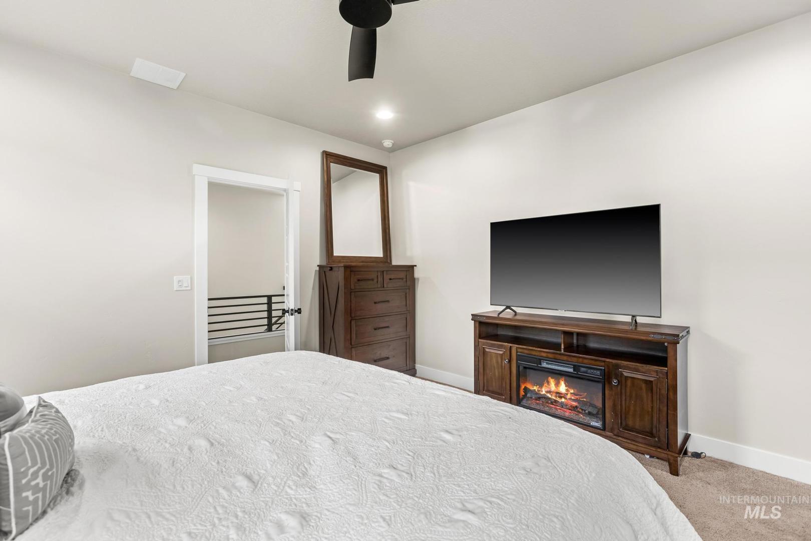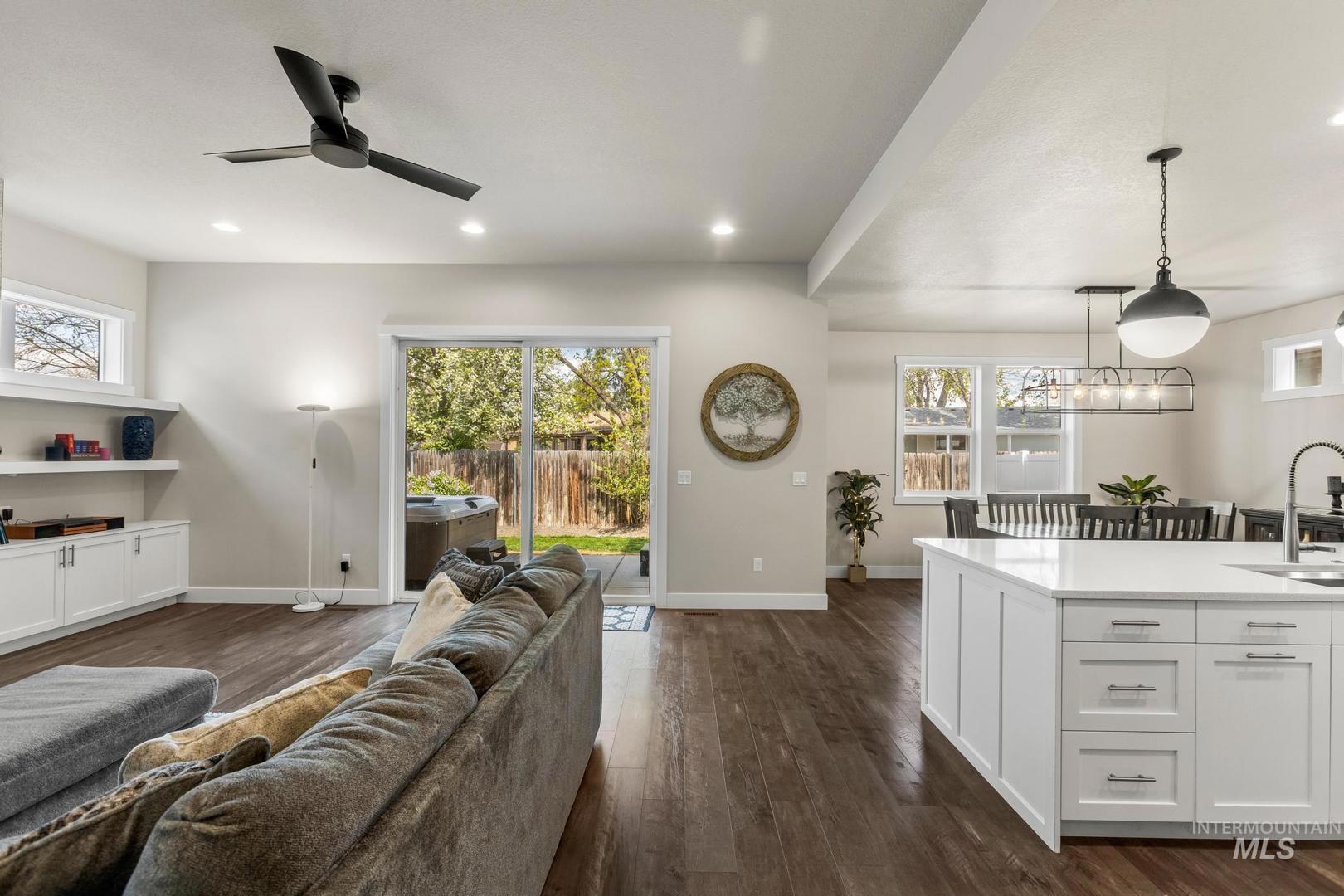 Set back from the street along a long private driveway, this stunning West Boise home offers enhanced peace and quiet, while delivering a stylish, functional layout designed for modern living. The open-concept main level features soaring ceilings, a beautifully appointed kitchen with a quartz island, stainless steel appliances, and a butler’s pantry—perfect for extra prep space and hidden storage. The living area is both warm and sophisticated, with a striking floor-to-ceiling fireplace and custom built-in cabinets. An 8ft sliding glass door brings in abundant natural light and opens to a private backyard with a covered patio and hot tub—ideal for relaxing or entertaining year-round. Upstairs, you’ll find three spacious bedrooms, two full baths, and a versatile loft space perfect for work or play. Additional upgrades include dual-zone HVAC, an insulated garage, and 220V EV charging. With no HOA and a prime location, this home offers the perfect balance of comfort, style, and convenience.
