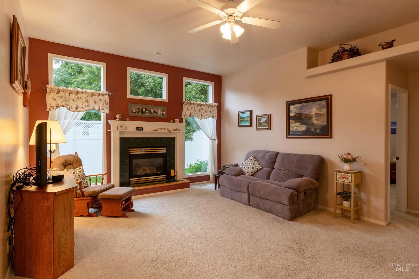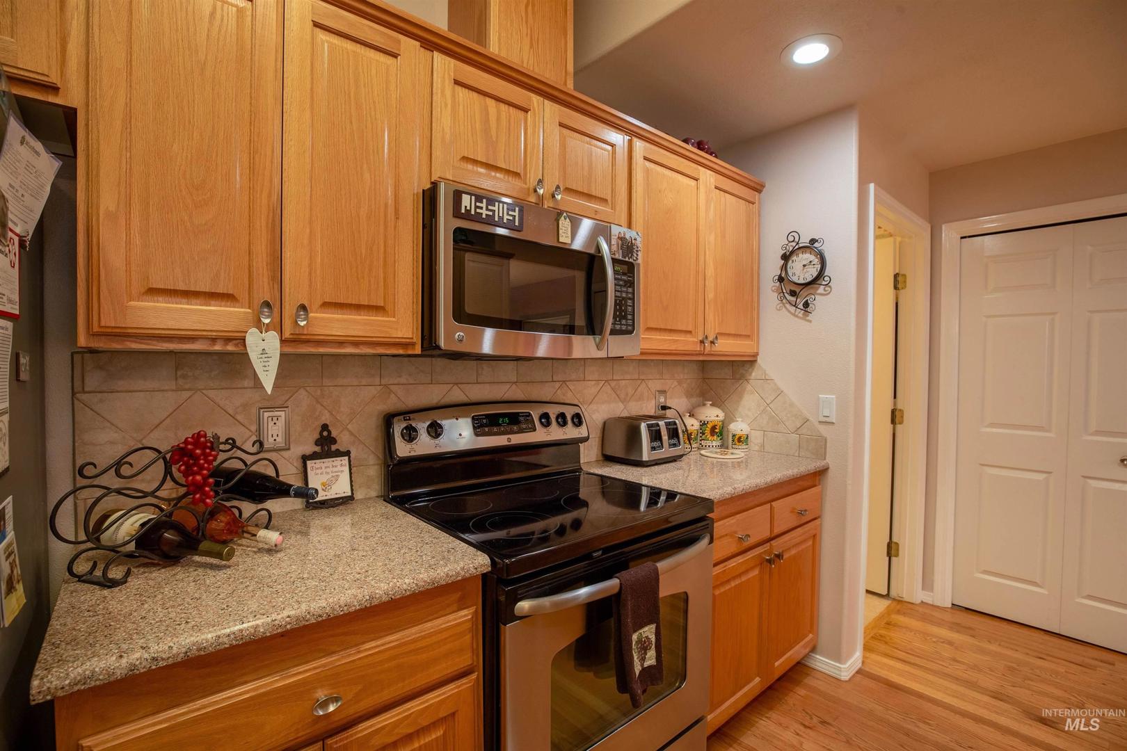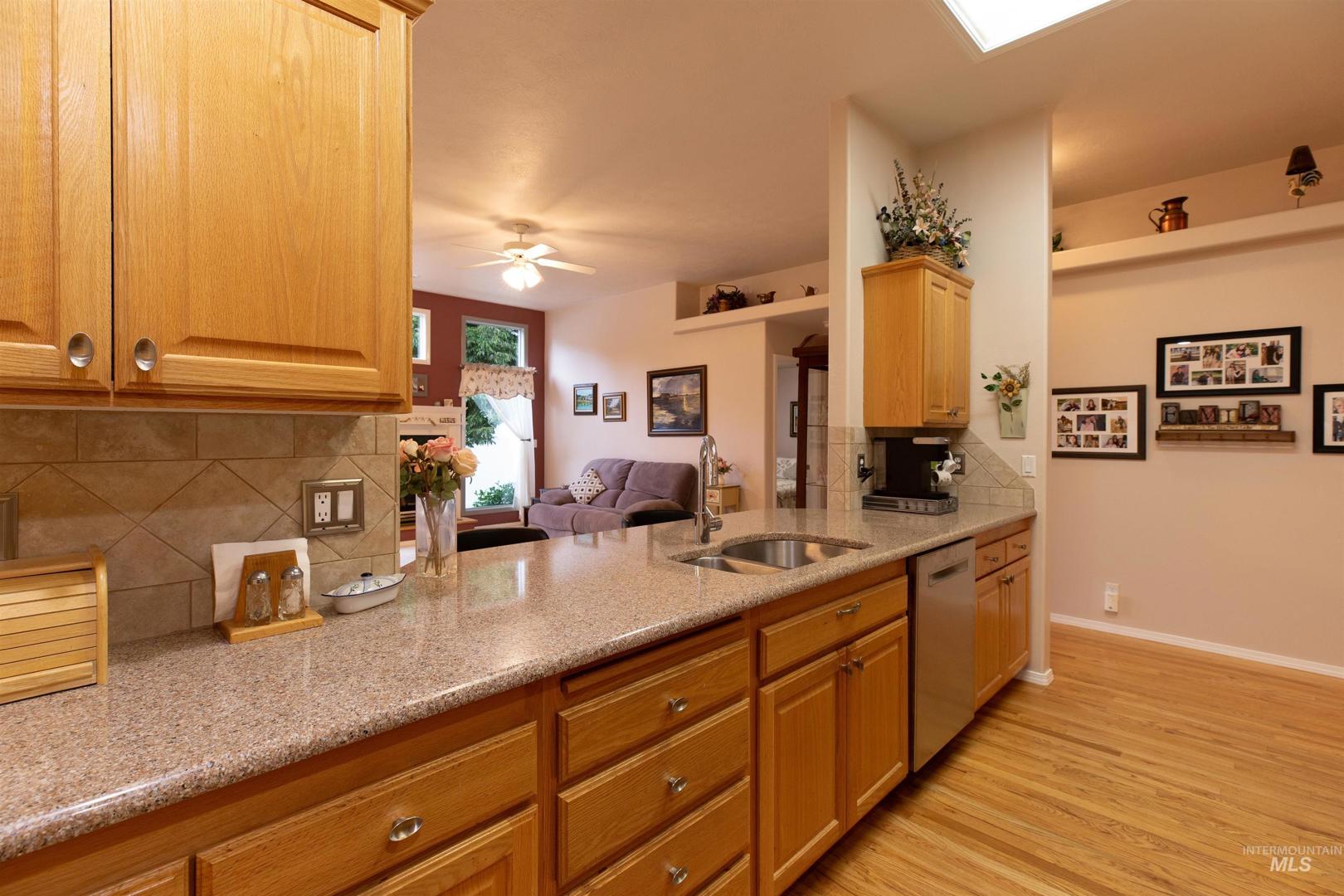 Oh so cute and well maintained townhome in popular 55 & Up community La Playa! Large kitchen with quartz countertops, stainless appliances including the refrigerator, pantry, full tile backsplash, tons of cabinetry, breakfast bar & barstools. Breakfast nook opens to patio. Oak hardwood throughout entry & kitchen. Living Rm with cozy gas fireplace and automatic blinds. Split bedroom plan with primary bedroom boasting window seat, ceiling fan, jetted tub & water closet with grab bars, dual vanities, step-in tiled shower and a walk-in closet. Bedroom 3 w/window seat. Laundry room with storage cabinetry, folding area/countertop. Washer/dryer included. Window blinds throughout too! Extra deep, finished garage with storage hooks. Nice light throughout with the covered back patio & North facing windows. Fully fenced backyard with clematis, peonies and included lawn care! La Playa offers monthly gatherings and clubhouse use for community owners use.