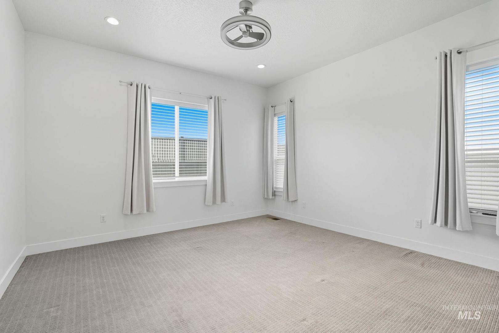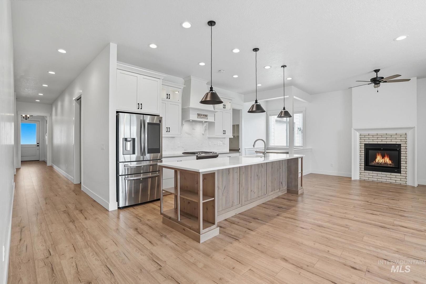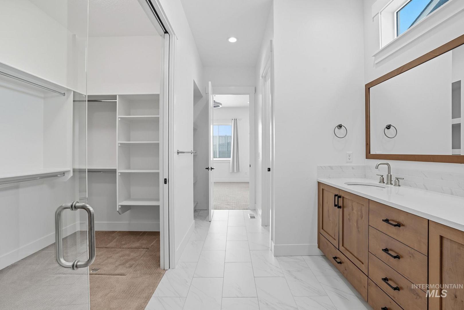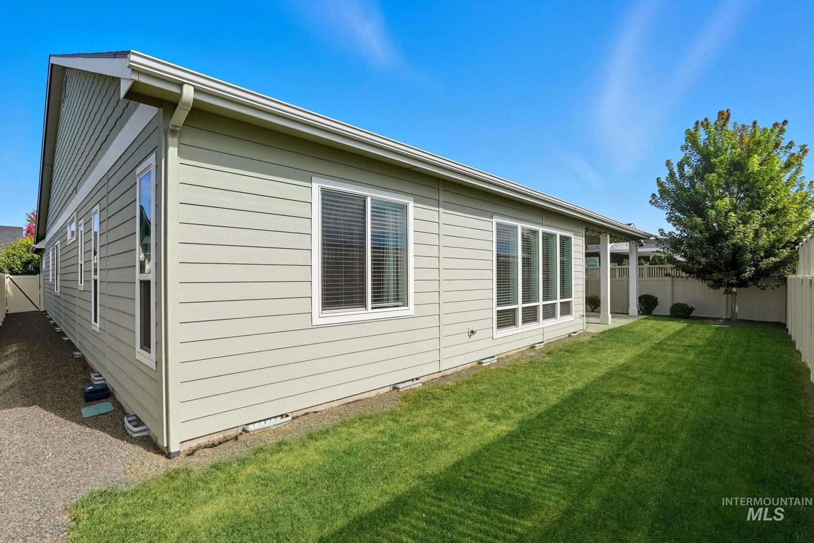 Must see custom built single level home w/finished 4 Car Garage w/37` RV/Boat Bay w/pull-thru door to extended 33` pad, Polyurea coated flooring (stronger than epoxy), 220v, LED lighting, overhead storage, fully insulated, H2O softener/filtration & wifi sprinklers & opener! Light & bright split floorplan w/10`ceilings, 8` doors, Jack & Jill bath + 1/2 guest bath, laundry w/sink, mudroom w/bench, entry bench, extensive trim & laminate, high window count, blinds & window treatments, high-end finishes throughout & guest suite (2nd Master) w/full bath & French doors to patio. Open kitchen features, spacious island w/side shelving, quartz counters, ss Bosch & GE appliances, gas oven, full tile backsplash, stunning cabinets w/glass inlays & LED lighting, drop pendant lighting, giant 71sq.ft. walk-in pantry, & raised eating area + formal dining area w/fireplace! Huge living area w/expansive windows. 220 sq.ft. Primary suite w/elegant bathroom which features tile flooring w/seamless entry into huge walk-in floor-ceiling tiled shower w/bench seat, beautiful vanity w/dual sinks & quartz counter, transom window, private commode, floating storage area & massive 15x6 walk-in closet w/dual pocket doors! Low maintenance landscaping, no rear-neighbors, vinyl fencing, full gutters, covered front & rear patios & gas bbq. line. Convenient location, close to shopping, schools, parks & more.