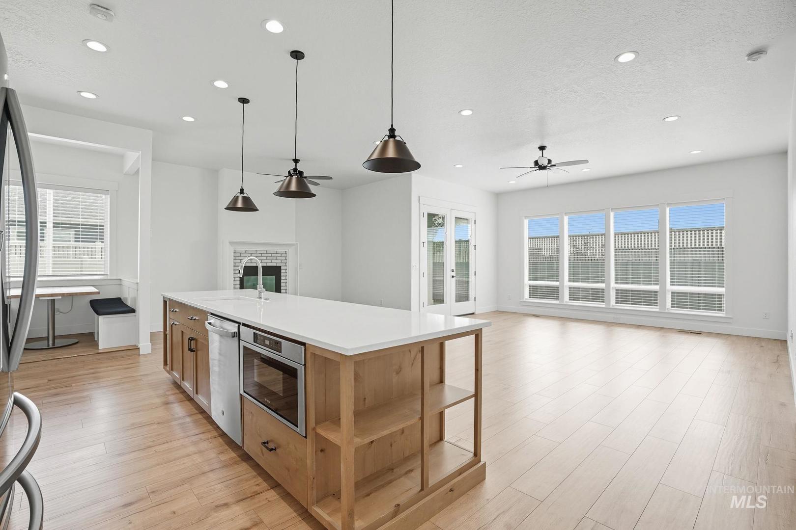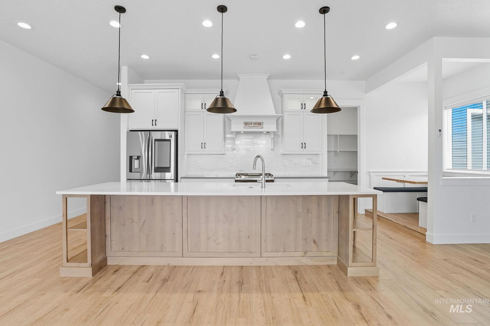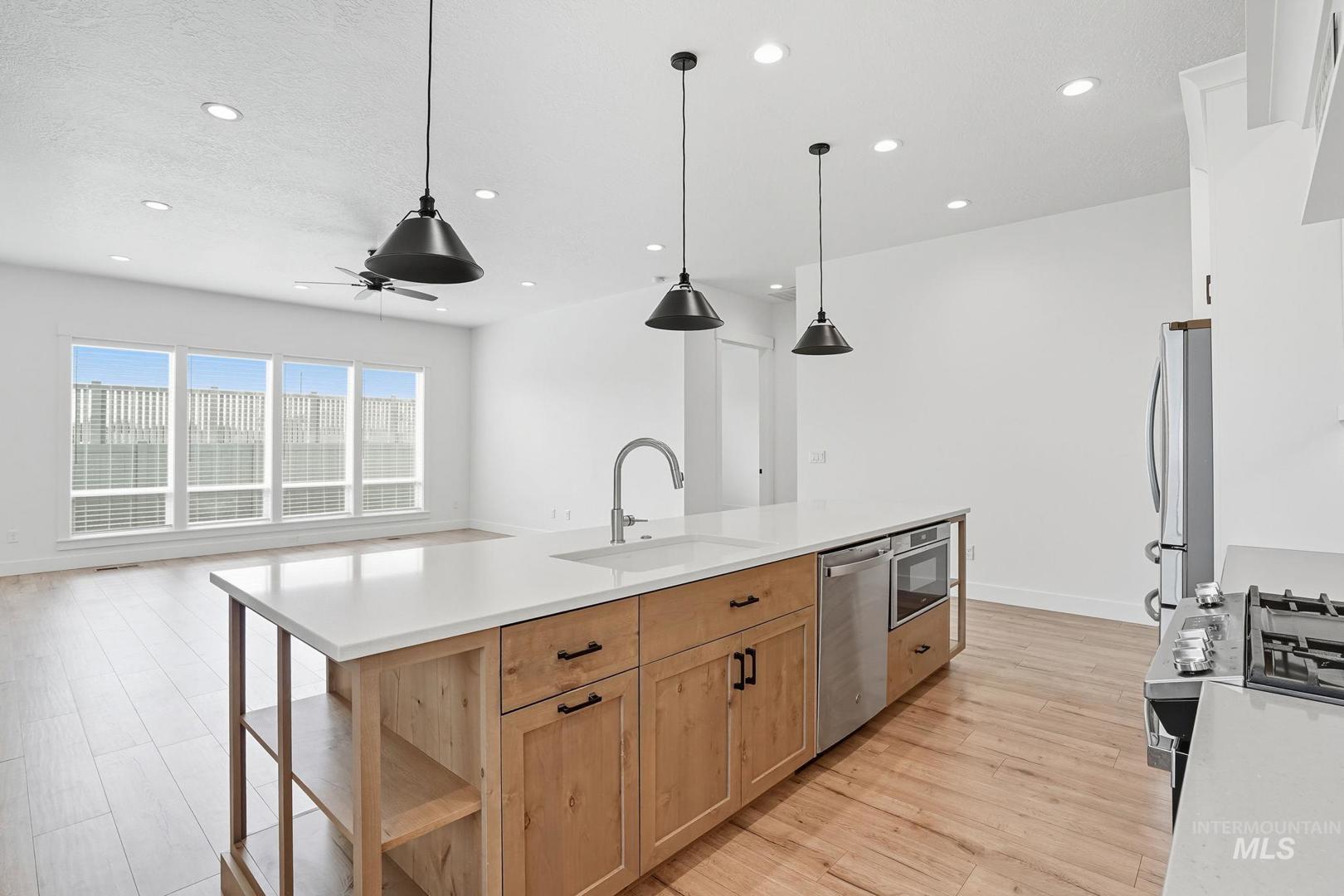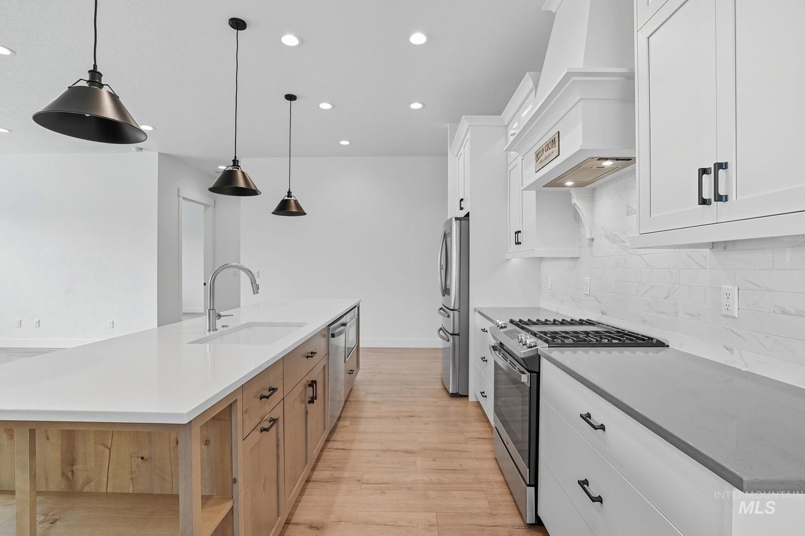 Must see custom built single level home w/finished 4 Car Garage w/37` RV/Boat Bay w/pull-thru door to extended 33` pad, Polyurea coated flooring (stronger than epoxy), 220v, LED lighting, overhead storage, fully insulated, H2O softener/filtration & wifi sprinklers & opener! Light & bright split floorplan w/10`ceilings, 8` doors, Jack & Jill bath + 1/2 guest bath, laundry w/sink, mudroom w/bench, entry bench, extensive trim & laminate, high window count, blinds & window treatments, high-end finishes throughout & guest suite (2nd Master) w/full bath & French doors to patio. Open kitchen features, spacious island w/side shelving, quartz counters, ss Bosch & GE appliances, gas oven, full tile backsplash, stunning cabinets w/glass inlays & LED lighting, drop pendant lighting, giant 71sq.ft. walk-in pantry, & raised eating area + formal dining area w/fireplace! Huge living area w/expansive windows. 220 sq.ft. Primary suite w/elegant bathroom which features tile flooring w/seamless entry into huge walk-in floor-ceiling tiled shower w/bench seat, beautiful vanity w/dual sinks & quartz counter, transom window, private commode, floating storage area & massive 15x6 walk-in closet w/dual pocket doors! Low maintenance landscaping, no rear-neighbors, vinyl fencing, full gutters, covered front & rear patios & gas bbq. line. Convenient location, close to shopping, schools, parks & more.