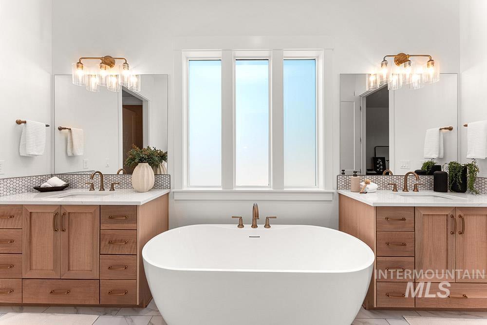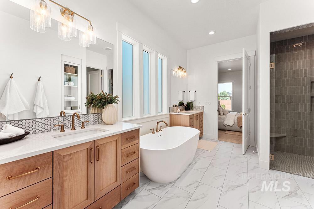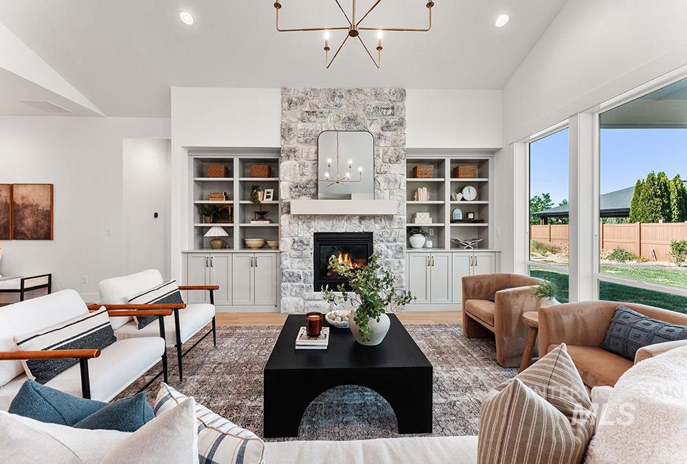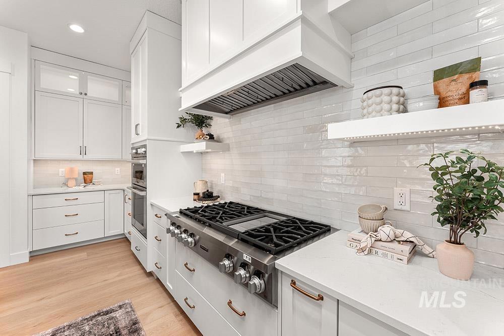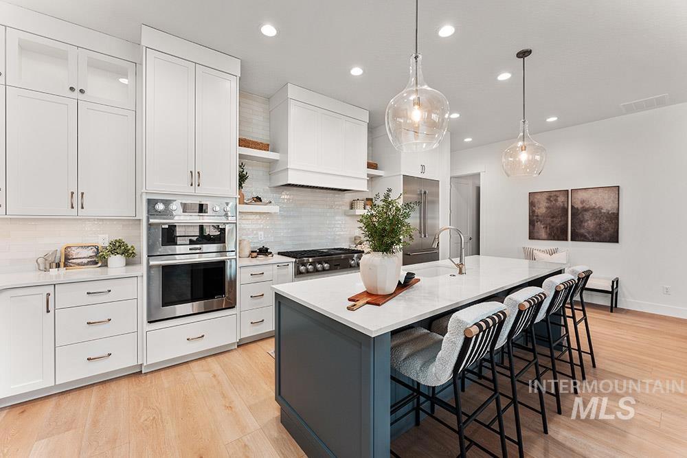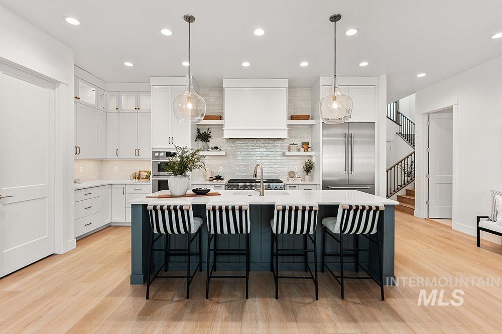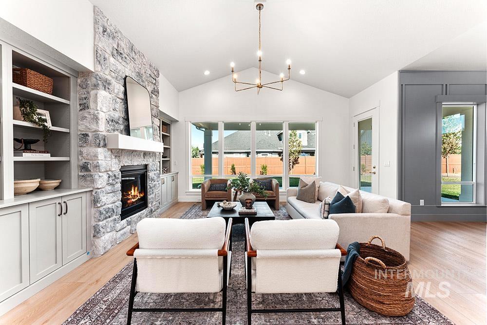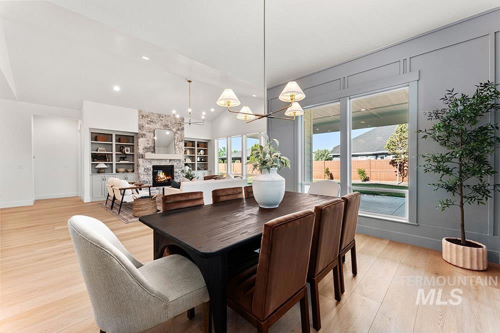 Experience designer luxury in the stunning Banquette by award-winning Asbury Homes. This stunning home showcases warm wood plank flooring, a curated designer color palette, & custom lighting throughout. The vaulted great room features a striking stacked stone fireplace & opens to a charming dining space & chef’s kitchen, complete with full-height cabinetry, quartz countertops, Zellige backsplash, professional-grade gas cooktop, dual ovens (incl steam), & a large island for entertaining. The owner’s suite enjoys its own private wing with a spa-inspired bath, dual vanities, freestanding soaker tub, & large walk-in closet w/ direct laundry access. A main-level guest suite adds convenience, while the upper level includes a generous bonus room and two bedrooms with Jack&Jill bath. Enjoy the oversized covered patio, expansive lawn, and the 2-car garage with an additional 32` x 13`6" RV bay. Located in the vibrant Centerra community with a pool, walking paths, and close proximity to Eagle High & downtown Eagle!