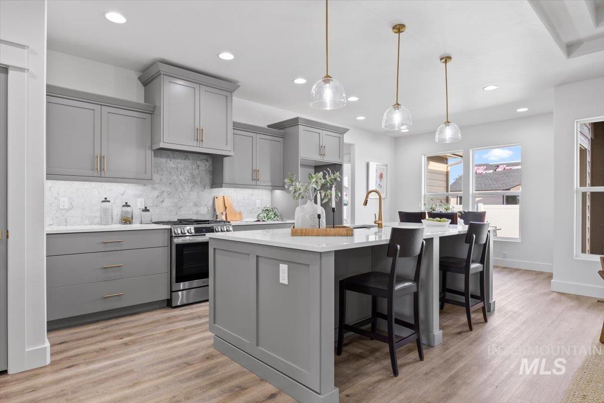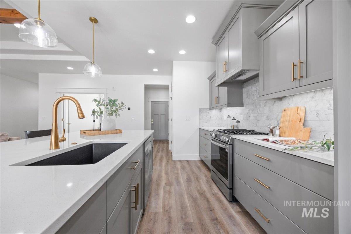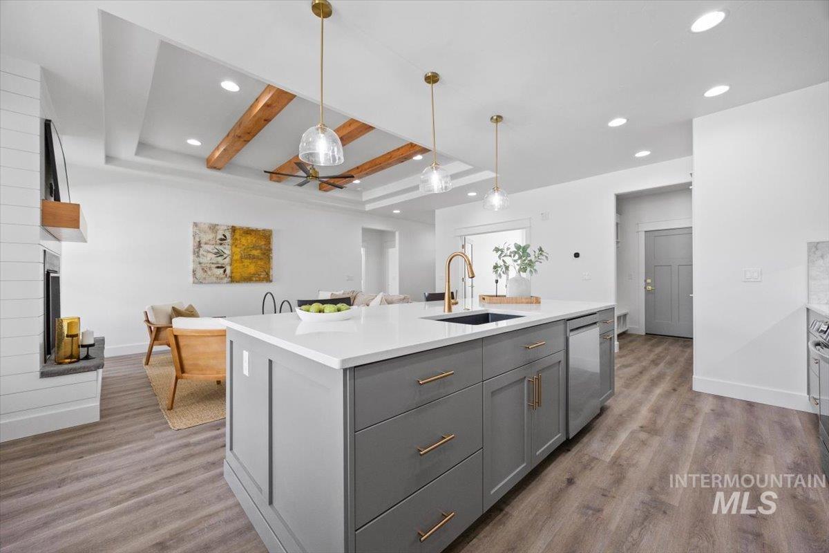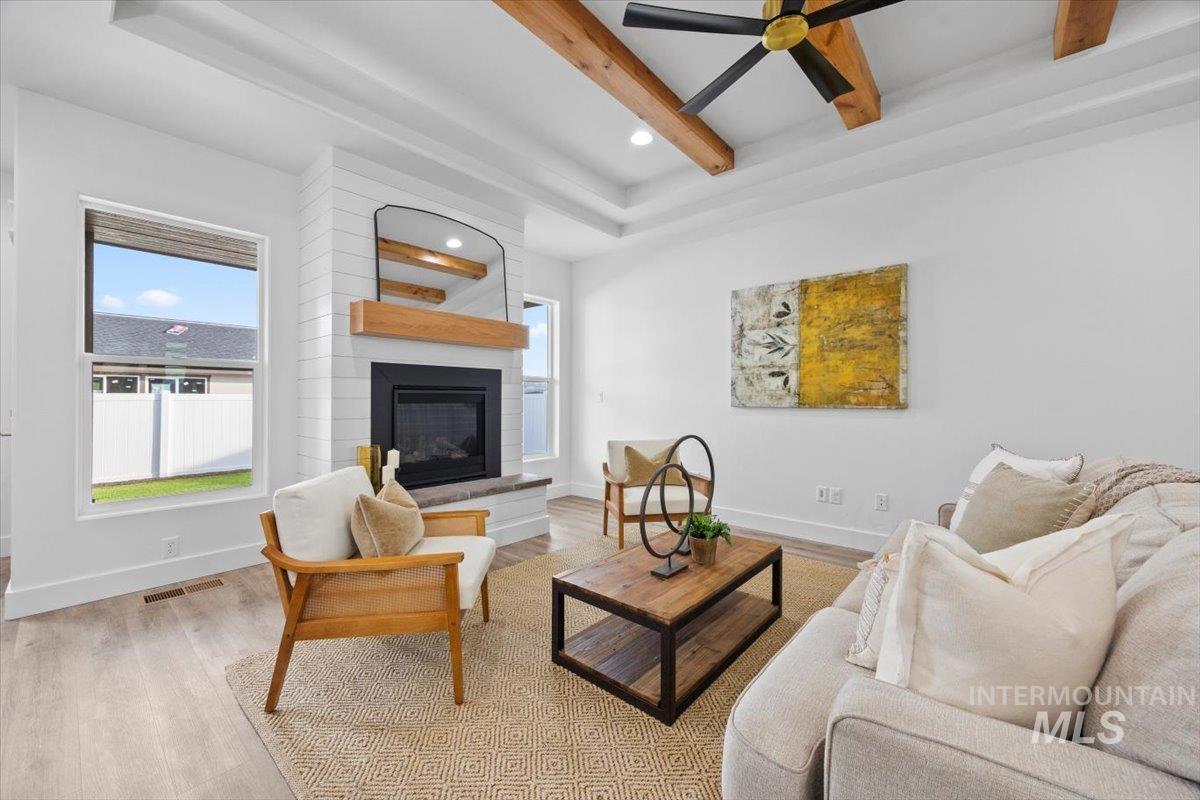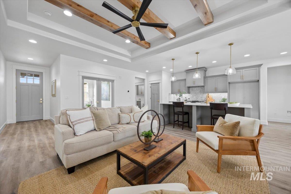 Ask about our current Fall promo! Introducing The Denali by Sunrise Home! This thoughtfully designed single-level residence offers an open-concept layout, ideal for entertaining. The great room stands out with its impressive 10-foot coffered ceilings accented with beams and large windows, allowing natural light to flood the main living areas. Designed with functionality in mind, the split-bedroom floor plan includes three spacious bedrooms and a generous office space. The kitchen is a chef’s dream, featuring custom cabinetry with plenty of storage, quartz countertops, a full-tile backsplash, stainless steel appliances, and a sizable walk-in pantry. The primary suite is a true retreat, complete with dual vanities and a beautifully tiled walk-in shower. The home also has an oversized 42-foot deep RV bay, providing ample space for all your storage needs, nearly 1,000 sq. ft. of garage space! Step outside to enjoy fully landscaped front and back yards with an automated sprinkler system. Nestled in Emmett’s Dagger Falls Subdivision.