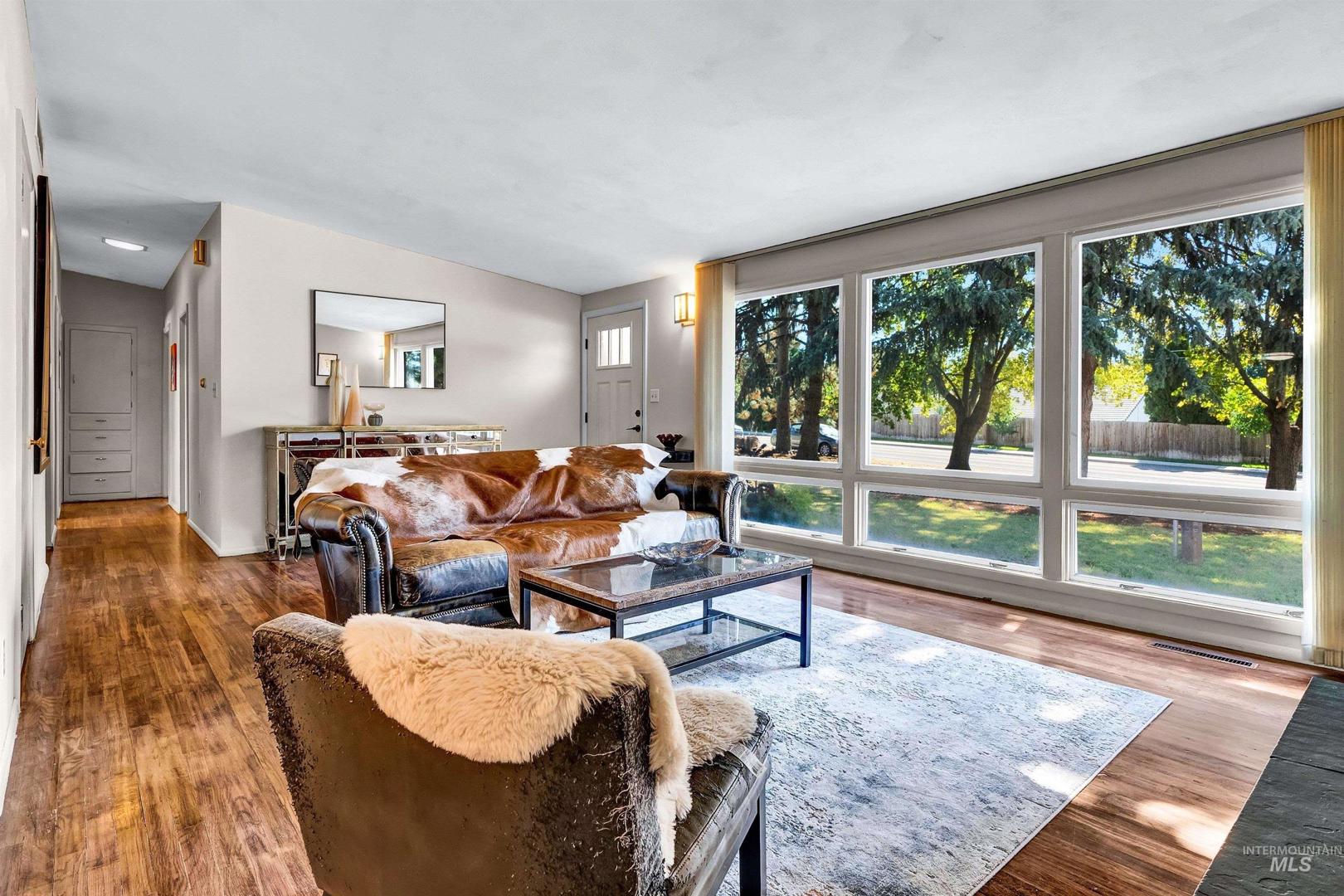 Mid-Century Modern Charmer on an expansive, tree-filled lot. This 3 bedroom, 2 bathroom home blends timeless style with modern updates including fully remodeled bathrooms and a new roof. Thoughtfully updated, bathrooms showcase classic subway tile, updated cabinetry, stylish flooring and updated lighting. Hardwood floors run throughout the living room and bedrooms, while the cozy fireplace and expansive picture windows bring warmth and natural light into the heart of the home. A versatile bonus room offers the perfect space for a home office, art studio, gym or a recreation area - tailored to suit your lifestyle. Step outside to the expansive backyard which provides a canvas for creativity: a gardeners paradise, a space for entertaining, a detached accessory dwelling unit, play and pets. With nearly half an acre to enjoy, this property blends function and style.