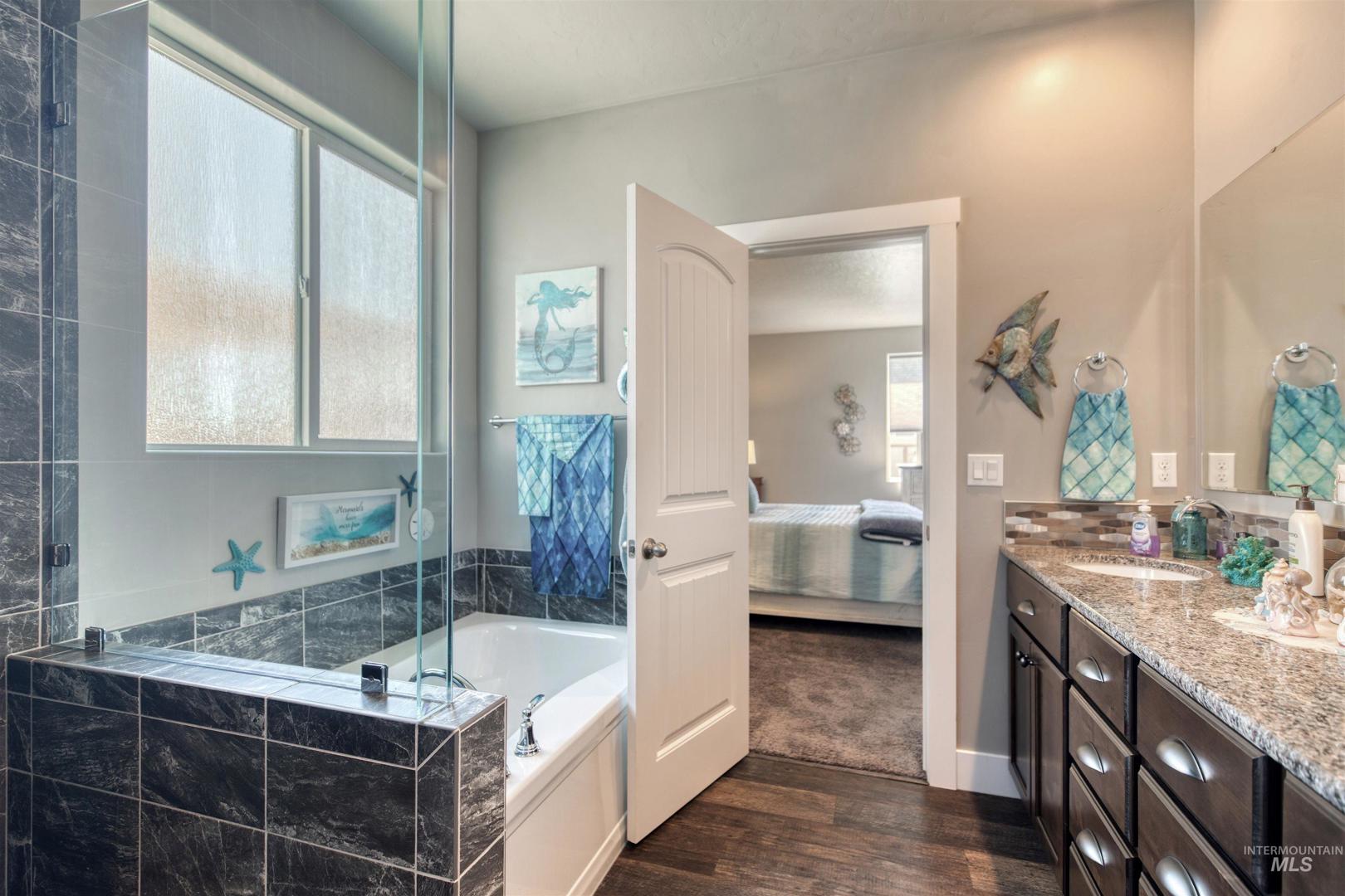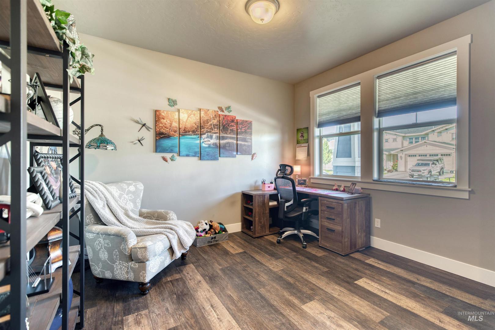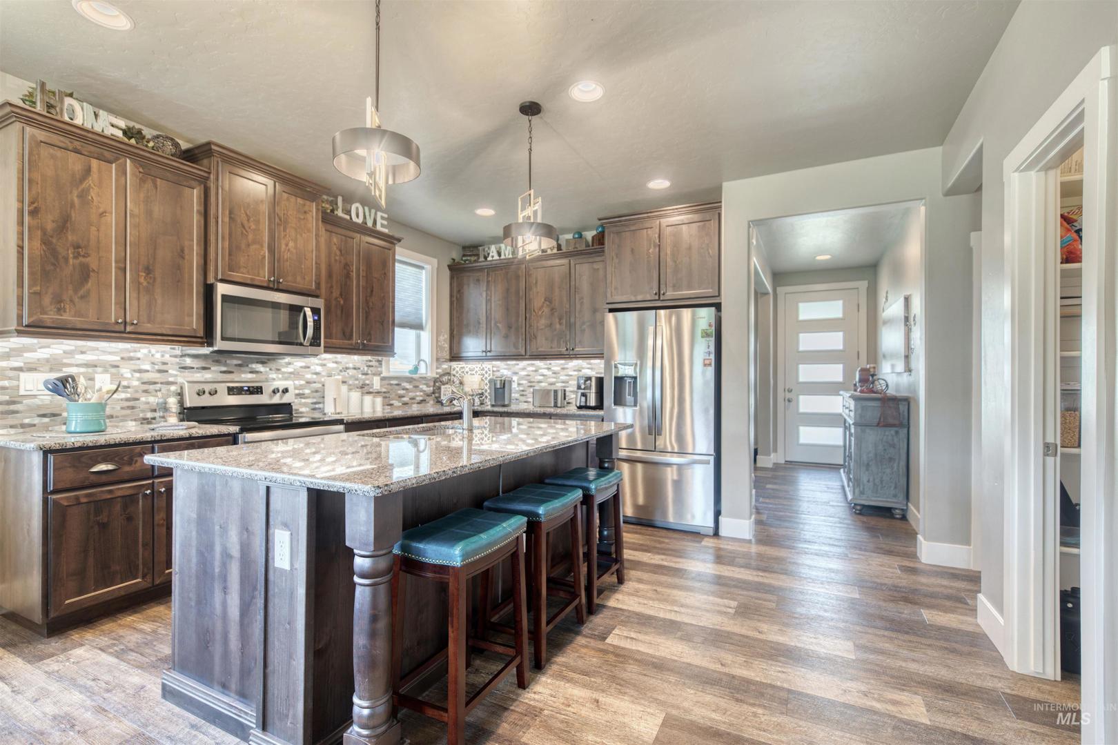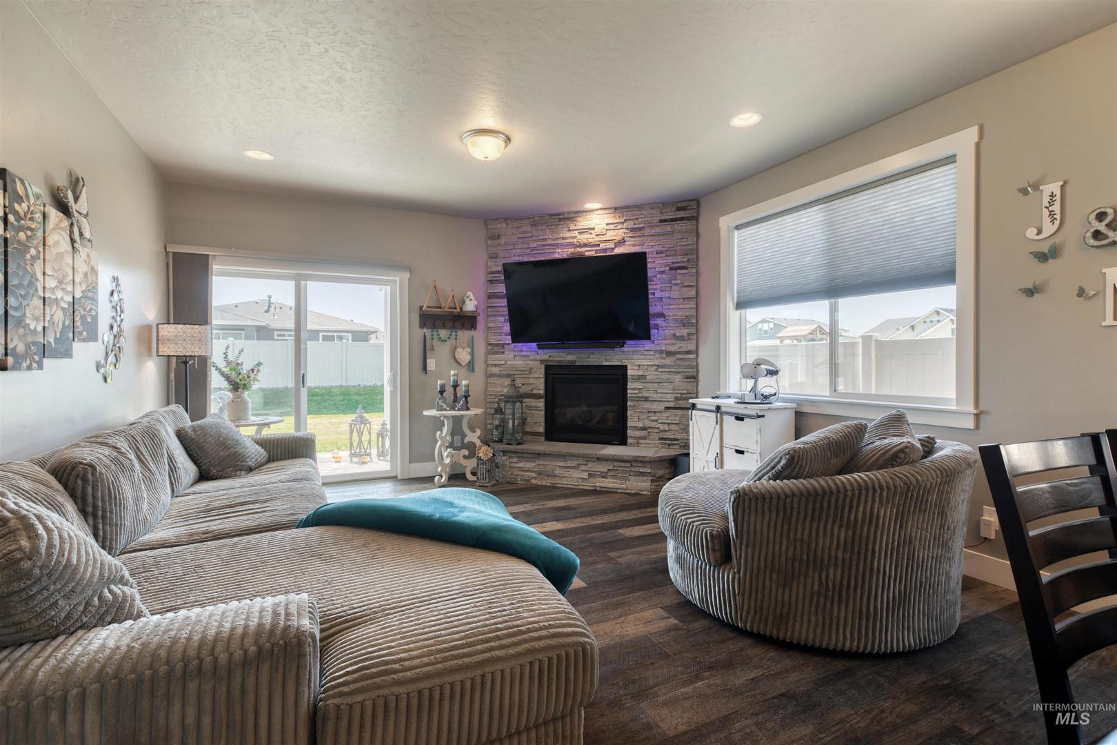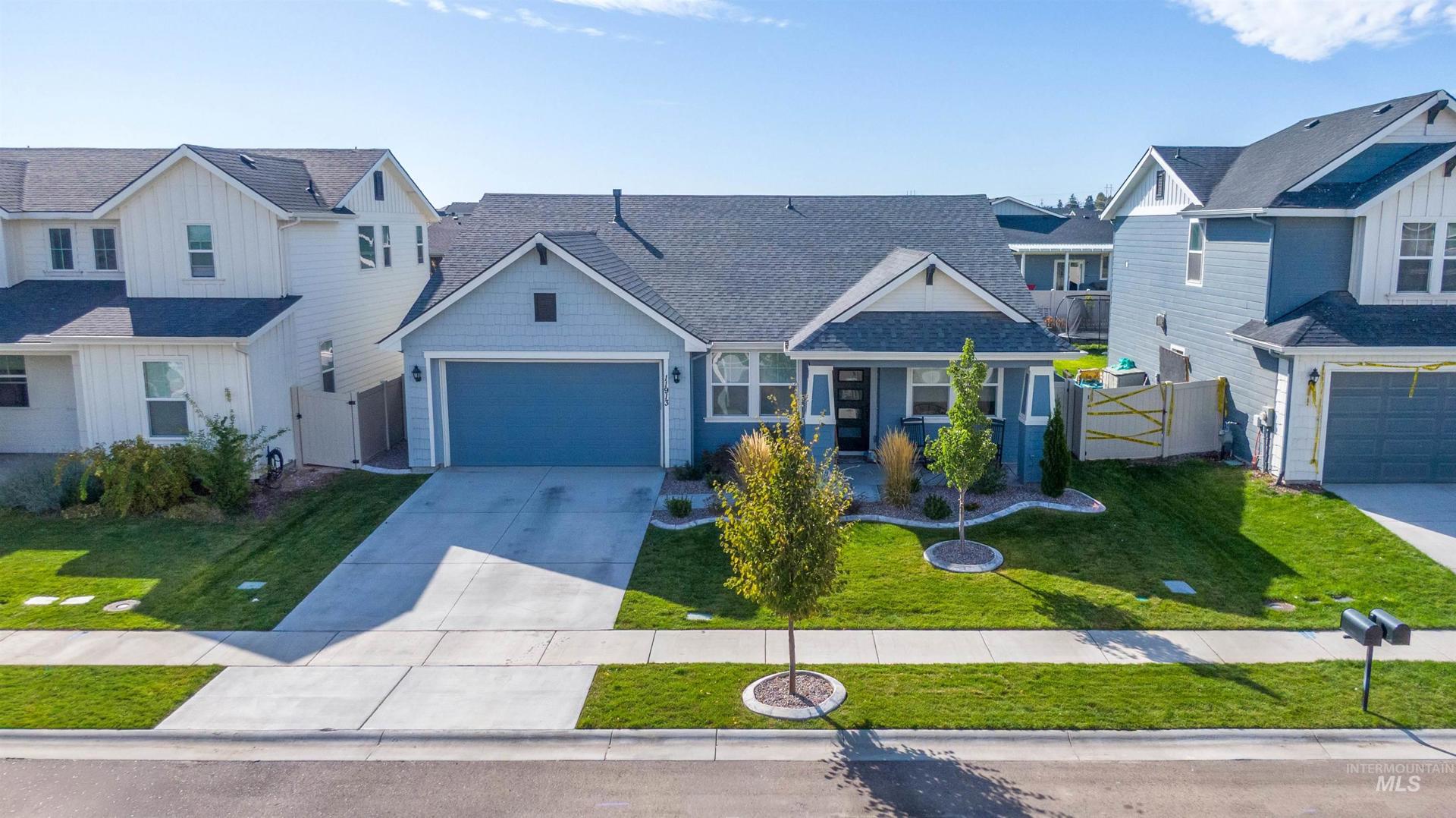Welcome to this stunning single-level 3 bedroom, 2 bathroom home built just 4 years ago, offering style, comfort, and modern upgrades throughout. From the moment you arrive, the charming curb appeal, manicured lawn, and inviting front porch seating area set the tone for what’s inside. Step into the heart of the home, where you’ll find beautiful LVP flooring and an open-concept layout that’s perfect for everyday living and entertaining. The gourmet kitchen features a large center island with seating, custom knotty alder cabinets, granite countertops, stainless steel appliances, outlets in the pantry, and a sleek tile backsplash. The kitchen flows seamlessly into the living room, where a floor-to-ceiling stone fireplace with raised hearth, pre-wired for a flat panel TV, creates a warm and inviting centerpiece. The front office room could easily be used as a family den, craft room or formal living rm. The private master retreat offers an oversized bedroom, spa-like bath with a frameless glass walk-in tile shower, and a large walk-in closet. Additional highlights include custom blinds throughout and a fully finished design that feels like new. Enjoy Idaho’s four seasons in your backyard oasis, complete with a custom patio cover that opens and closes manually and a beautifully landscaped, fully fenced yard, all just minutes away from Lake Lowell! Opportunities like this don`t last long!