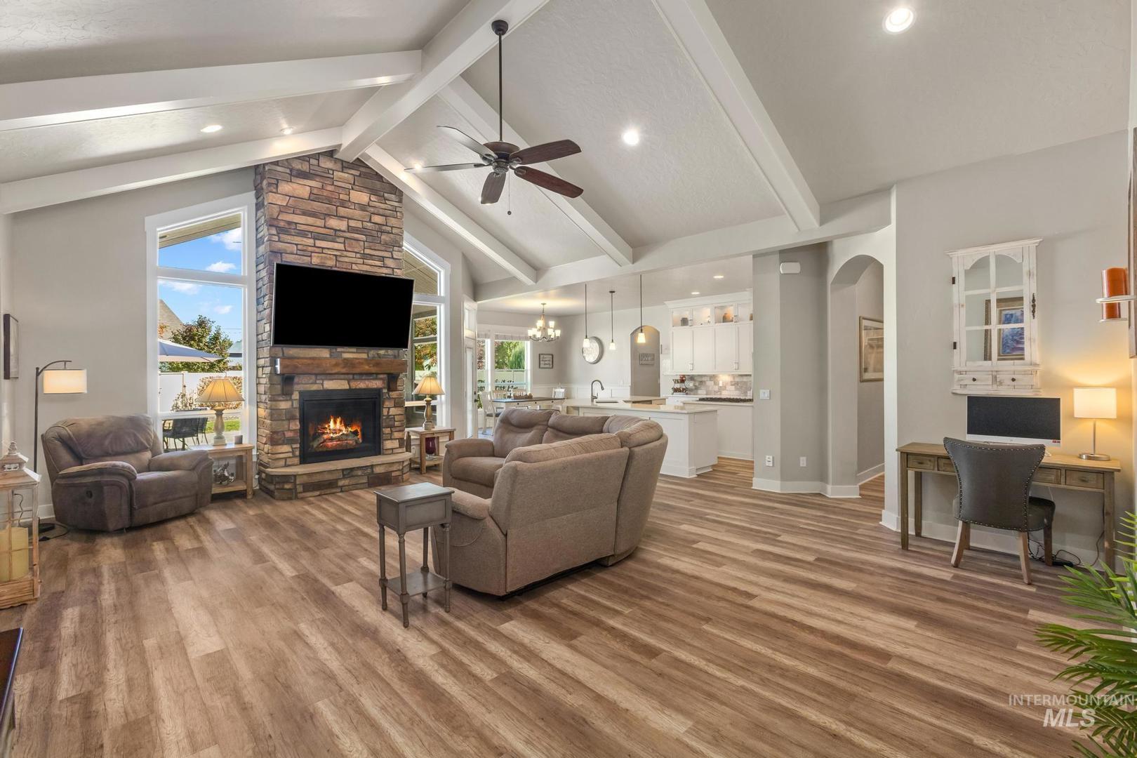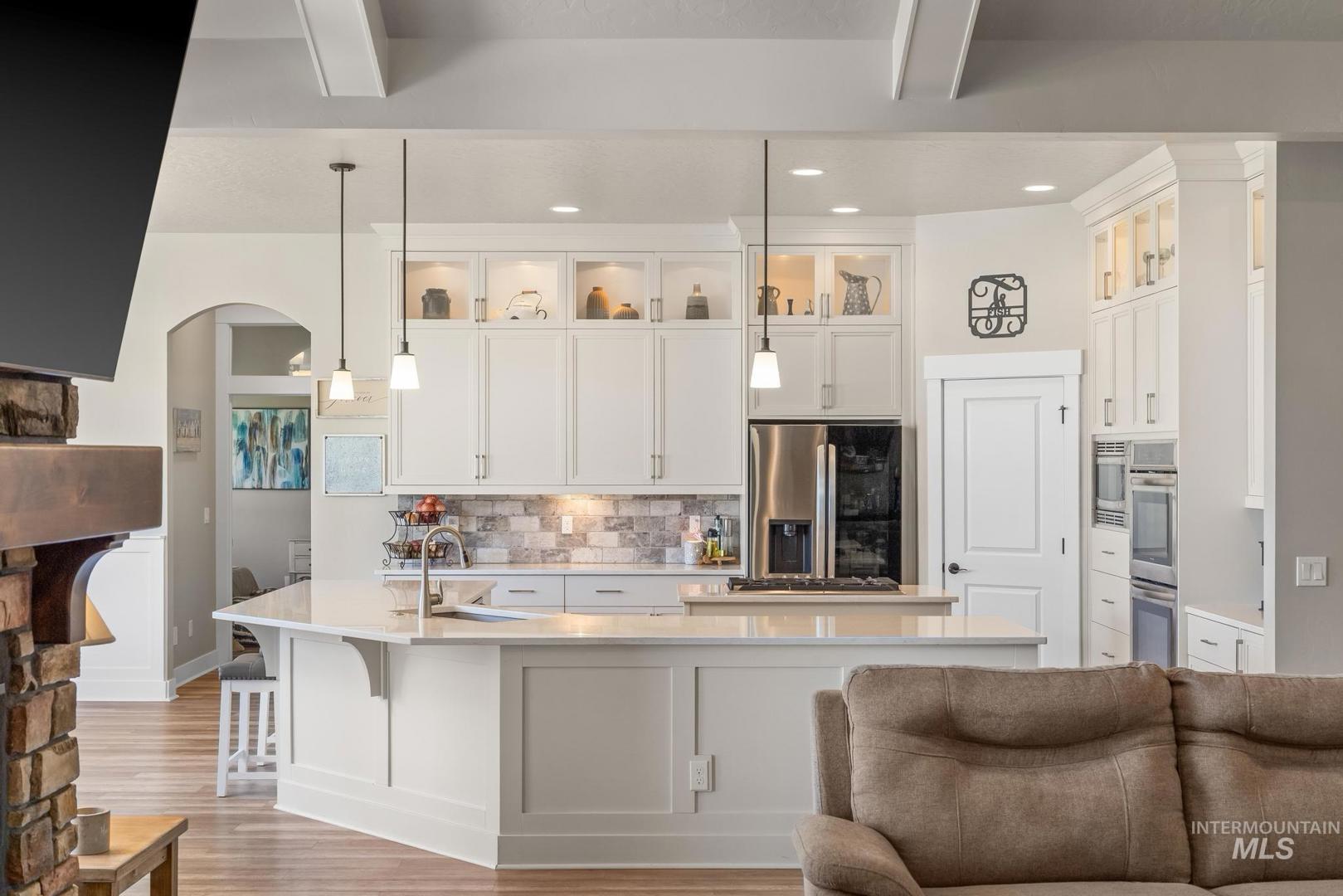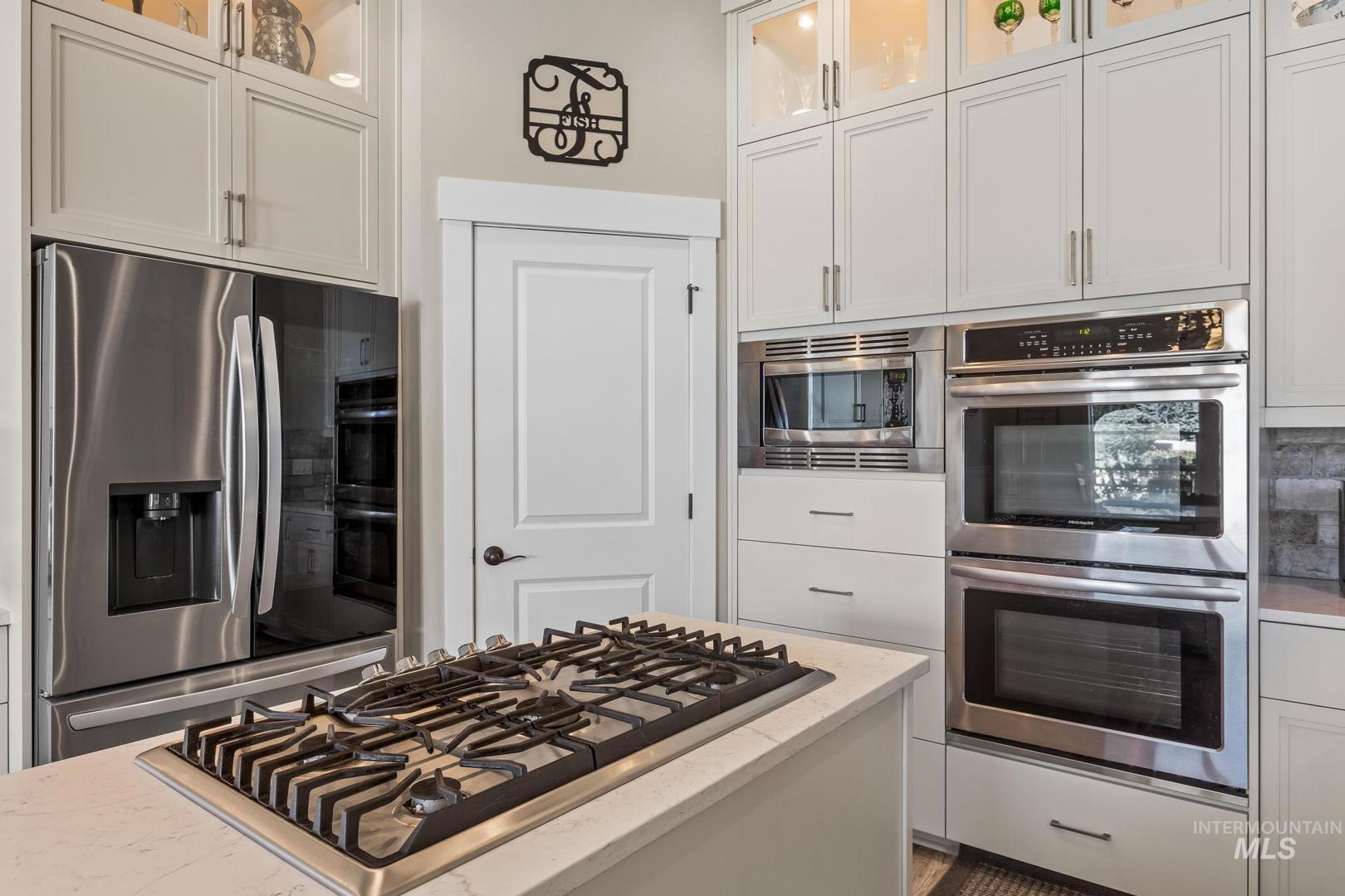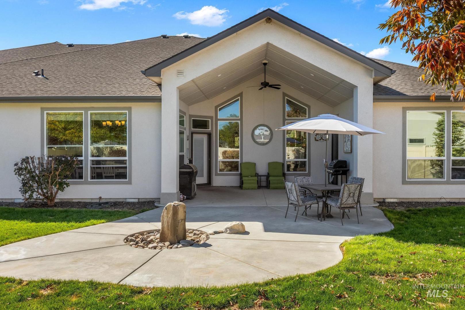 Located in one of Star`s most sought after subdivisions; The Lakes at Pristine Springs. This beauty blends comfort, & cozy with grace and elegance. Front entry opens to a gorgeous great room with soaring ceilings, fabulous stone fireplace, a beautiful built -in & loads of windows providing the perfect amount of natural light. Great room seamlessly flows into a chef’s dream kitchen and dining area. Kitchen features white cabinetry, quartz countertops, double ovens, gas range, built-in microwave, spacious island, and a walk-in pantry! The primary suite is light, bright and very spacious. Includes private access to patio. Spa-like ensuite features dual vanities, a soaking tub, walk-in shower as well as a walk-in closet. Second bedroom is a junior suite. Perfect for family members and/or guests. Third bedroom as well as office/den are also generously sized and offer flexibility to suit all needs. Covered patio opens to a beautiful water feature, ample room for patio furniture and your favorite BBQ or smoker. Generous lot size features well manicured landscaping and is fully fenced with vinyl fencing. Garage and RV bay are the ultimate wow factor! Includes a 240 hookup as well as spicket for hose bib. Perfect for vehicles, RV and any additional toys! Home is plumbed for central vac.