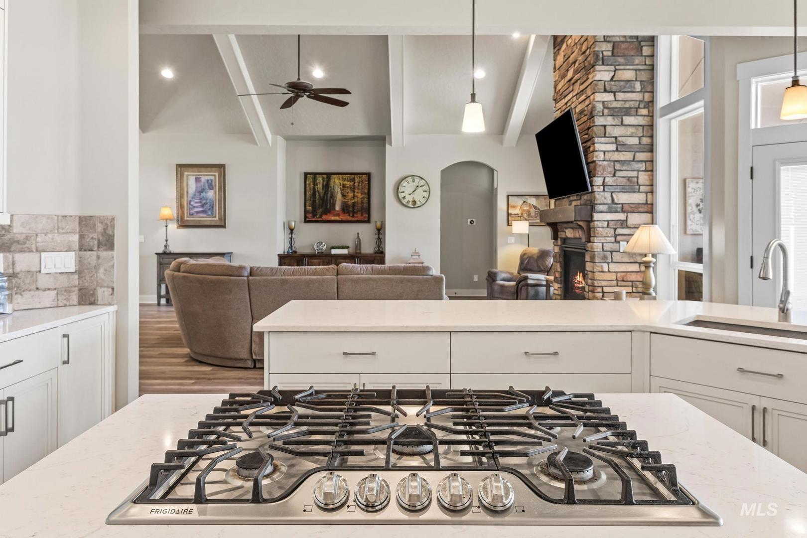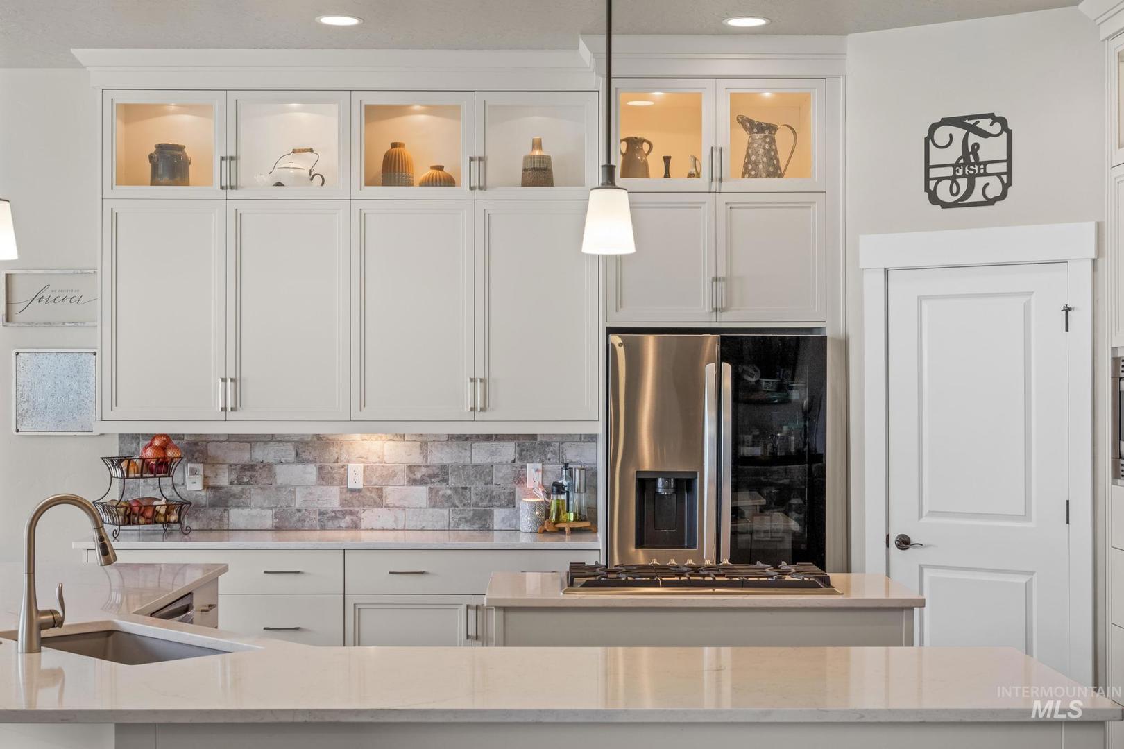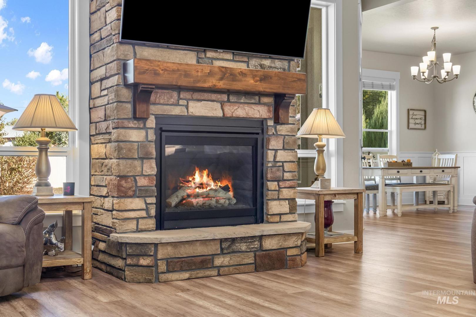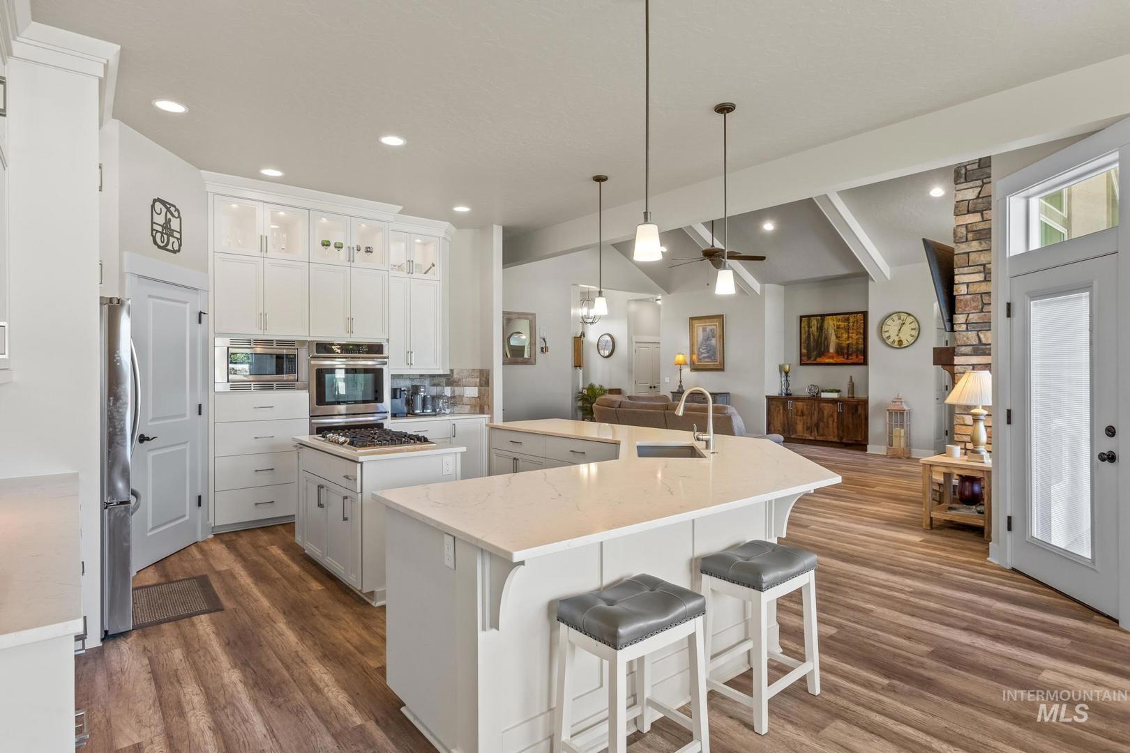 Located in one of Star`s most sought after subdivisions; The Lakes at Pristine Springs. This beauty blends comfort, & cozy with grace and elegance. Front entry opens to a gorgeous great room with soaring ceilings, fabulous stone fireplace, a beautiful built -in & loads of windows providing the perfect amount of natural light. Great room seamlessly flows into a chef’s dream kitchen and dining area. Kitchen features white cabinetry, quartz countertops, double ovens, gas range, built-in microwave, spacious island, and a walk-in pantry! The primary suite is light, bright and very spacious. Includes private access to patio. Spa-like ensuite features dual vanities, a soaking tub, walk-in shower as well as a walk-in closet. Second bedroom is a junior suite. Perfect for family members and/or guests. Third bedroom as well as office/den are also generously sized and offer flexibility to suit all needs. Covered patio opens to a beautiful water feature, ample room for patio furniture and your favorite BBQ or smoker. Generous lot size features well manicured landscaping and is fully fenced with vinyl fencing. Garage and RV bay are the ultimate wow factor! Includes a 240 hookup as well as spicket for hose bib. Perfect for vehicles, RV and any additional toys! Home is plumbed for central vac.