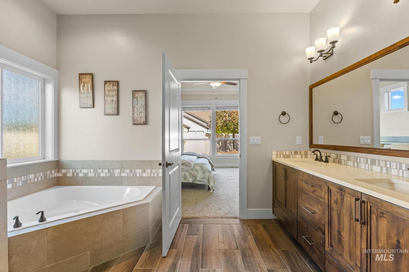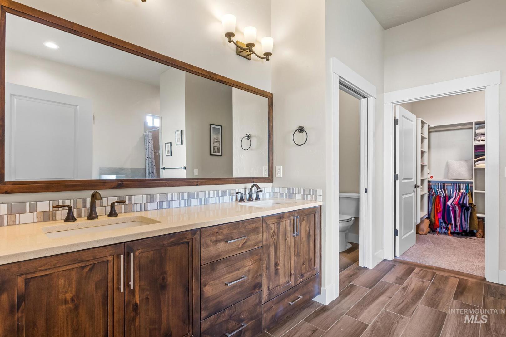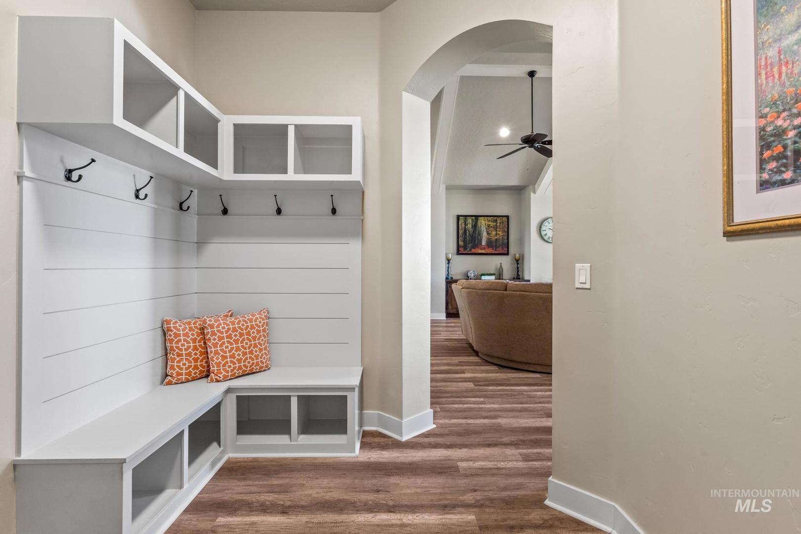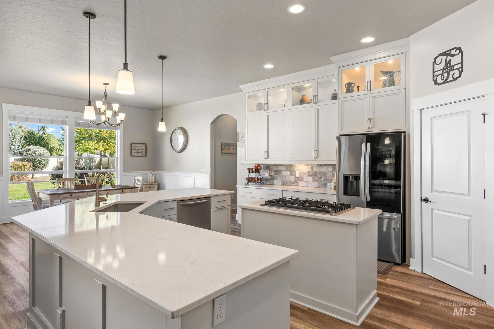 Located in one of Star`s most sought after subdivisions; The Lakes at Pristine Springs. This beauty blends comfort, & cozy with grace and elegance. Front entry opens to a gorgeous great room with soaring ceilings, fabulous stone fireplace, a beautiful built -in & loads of windows providing the perfect amount of natural light. Great room seamlessly flows into a chef’s dream kitchen and dining area. Kitchen features white cabinetry, quartz countertops, double ovens, gas range, built-in microwave, spacious island, and a walk-in pantry! The primary suite is light, bright and very spacious. Includes private access to patio. Spa-like ensuite features dual vanities, a soaking tub, walk-in shower as well as a walk-in closet. Second bedroom is a junior suite. Perfect for family members and/or guests. Third bedroom as well as office/den are also generously sized and offer flexibility to suit all needs. Covered patio opens to a beautiful water feature, ample room for patio furniture and your favorite BBQ or smoker. Generous lot size features well manicured landscaping and is fully fenced with vinyl fencing. Garage and RV bay are the ultimate wow factor! Includes a 240 hookup as well as spicket for hose bib. Perfect for vehicles, RV and any additional toys! Home is plumbed for central vac.