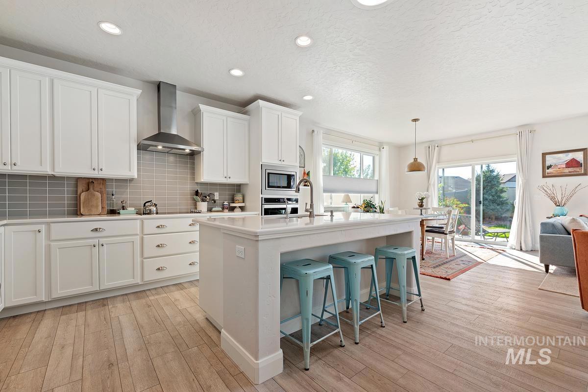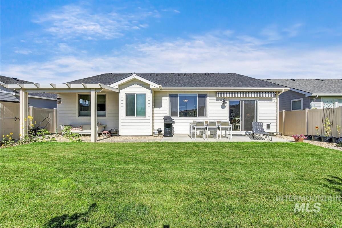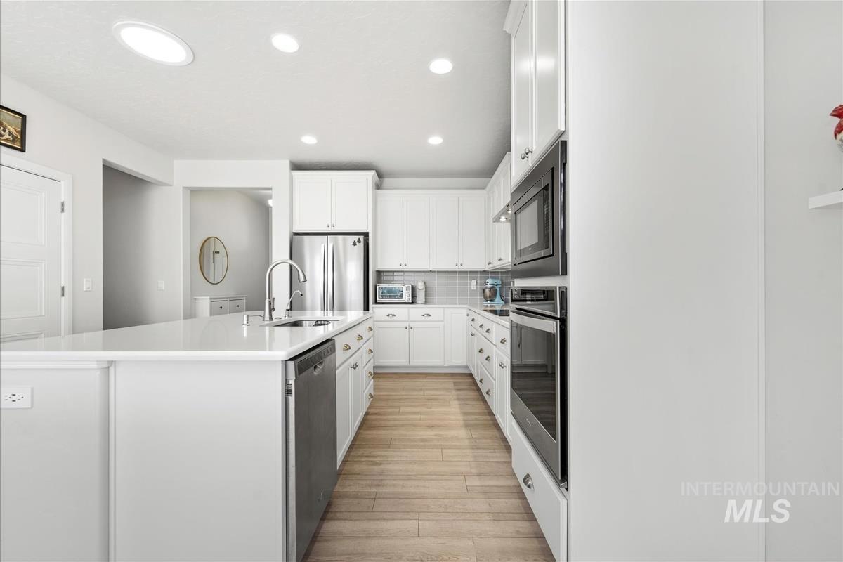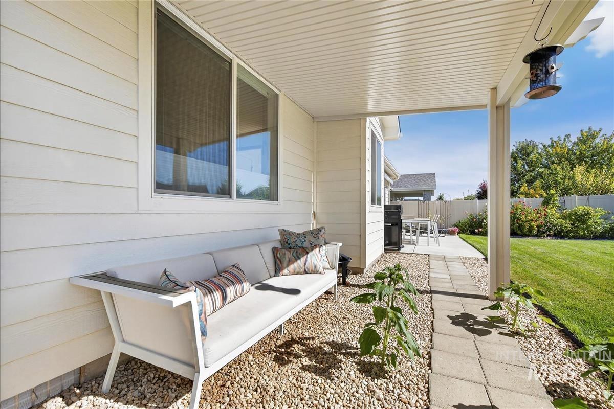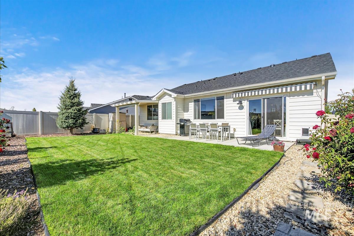 Gorgeous single level 4 bedroom home with no direct neighbors to the west or south! Beautiful curb appeal welcomes you into a bright and sunny home filled with natural light! The inviting open floor plan with stunning kitchen offers a spacious island with breakfast bar, quartz countertops, reverse osmosis system, built in range/oven/microwave & stainless appliances. You`ll appreciate upgrades such as beautiful engineered hardwood flooring in every room other than the carpeted primary bedroom, quartz countertops throughout, a solatube, custom up/down window coverings & extended garage w/overhead storage & H20 softener. The spacious primary bedroom includes an en suite bathroom w/soaker tub, separate water closet, dual vanities, WI closet & sliding barn door. Enjoy your south facing backyard w/covered patio, retractable awning, grapes, beautiful landscaping & fabulous privacy! Head to the community pool (including lap pool!), parks, playgrounds & walking paths. All just moments to schools & all Kuna has to offer with new restaurants, shopping & conveniences!