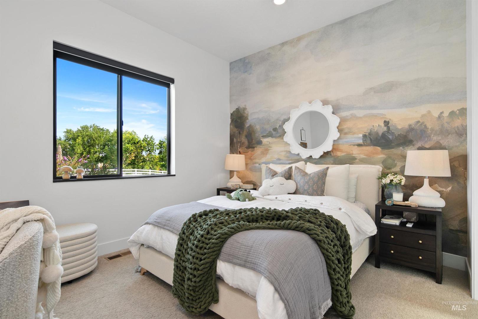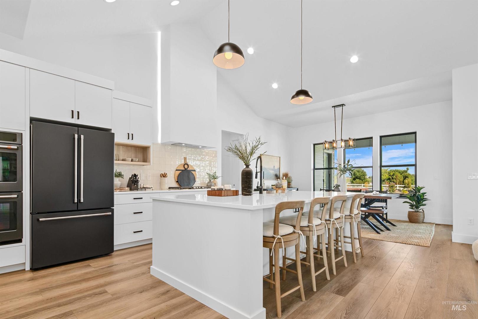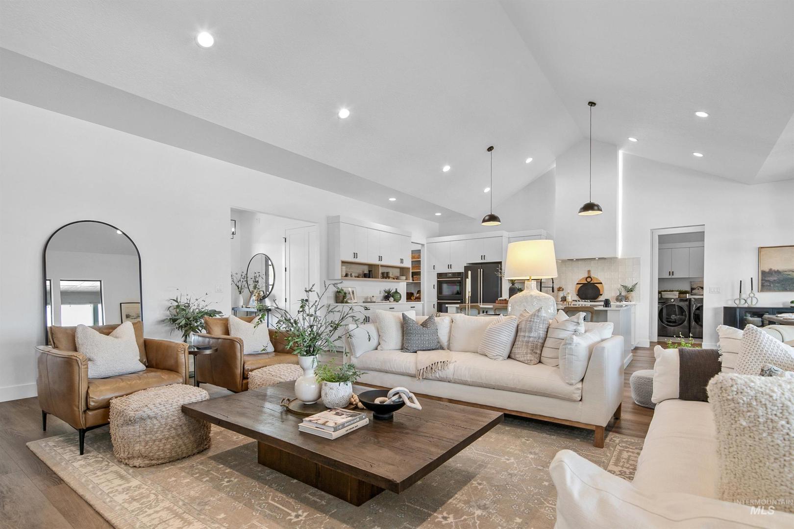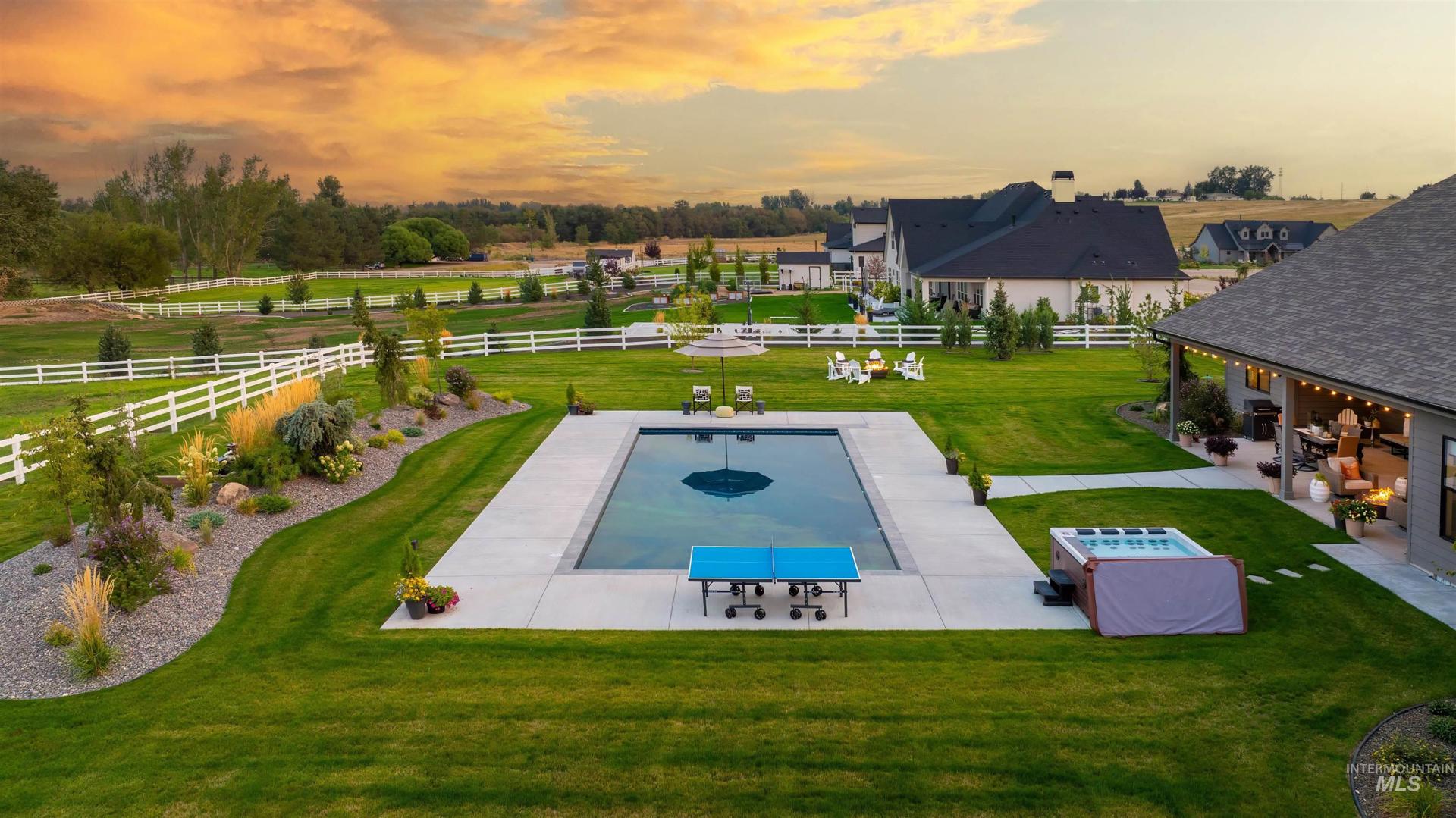 A rare 2-acre modern farmhouse ranch retreat near Middleton, where refined design meets Idaho’s natural beauty. Interiors are graced with soaring vaulted ceilings, remote-controlled shades, wide-plank white-oak LVP flooring, custom paint, curated wallpaper, wainscoting, and board-and-batten accents. At the heart, a showpiece farmhouse kitchen with an enormous island and country pantry inspires both daily living and elegant entertaining. The spa-inspired master suite offers heated floors, large dual vanities, soaking tub, and private hot-tub access. Outdoors, indulge in resort-style living with a new 22`x44` sport pool, party-size hot tub, stone water feature, fire pit, and light-strung patio. New horse fencing, auto-waterers, sand arena, and pasture complete the estate. A 50’ RV bay w/ pass-through, epoxy-finished garage w/ EV wiring, pressurized irrigation, and high-speed connectivity add modern ease. With 4 bedrooms, junior suite, 3.5 baths, den, & rec room, this is luxury Idaho living at its finest!