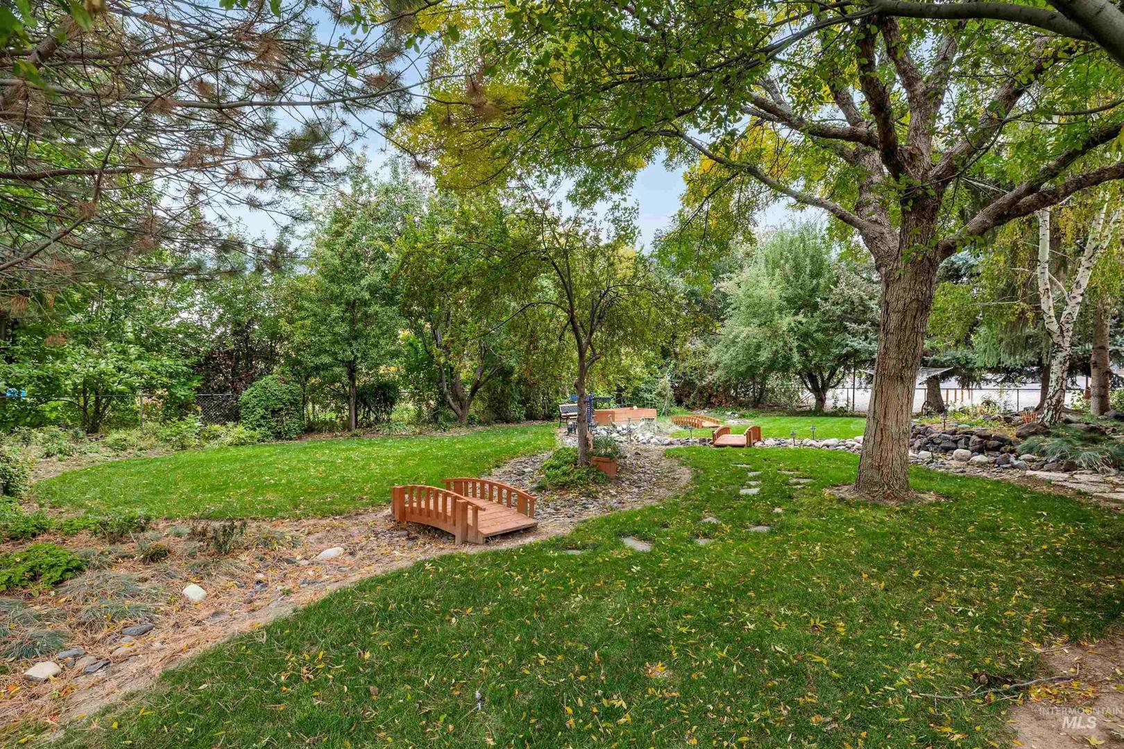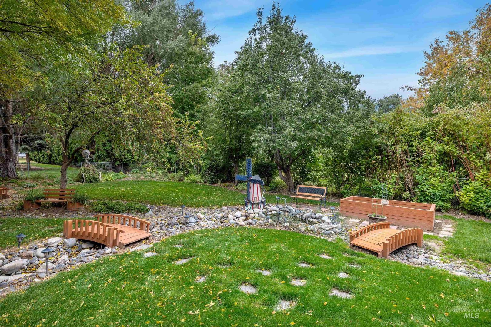 Discover your own private retreat at this single-level Jerome home, perfectly situated on a spacious .33-acre lot. The heart of this property is the incredible park-like backyard, a fully-fenced setting with a tranquil water feature, charming decorative bridges, and mature pear and apple trees. Enjoy peaceful mornings on the covered front porch and relaxing evenings on the back patio overlooking the beautiful grounds. Inside, an ideal split-bedroom floor plan provides privacy and comfort. The inviting living area, complete with a gas fireplace and updated LVP flooring, flows into a spacious kitchen with tile countertops, a breakfast nook, and a separate dining room. The primary suite serves as a personal escape, offering a large jetted tub and a separate standing shower. With generous RV parking, this home offers a rare combination of space, function, and serenity.