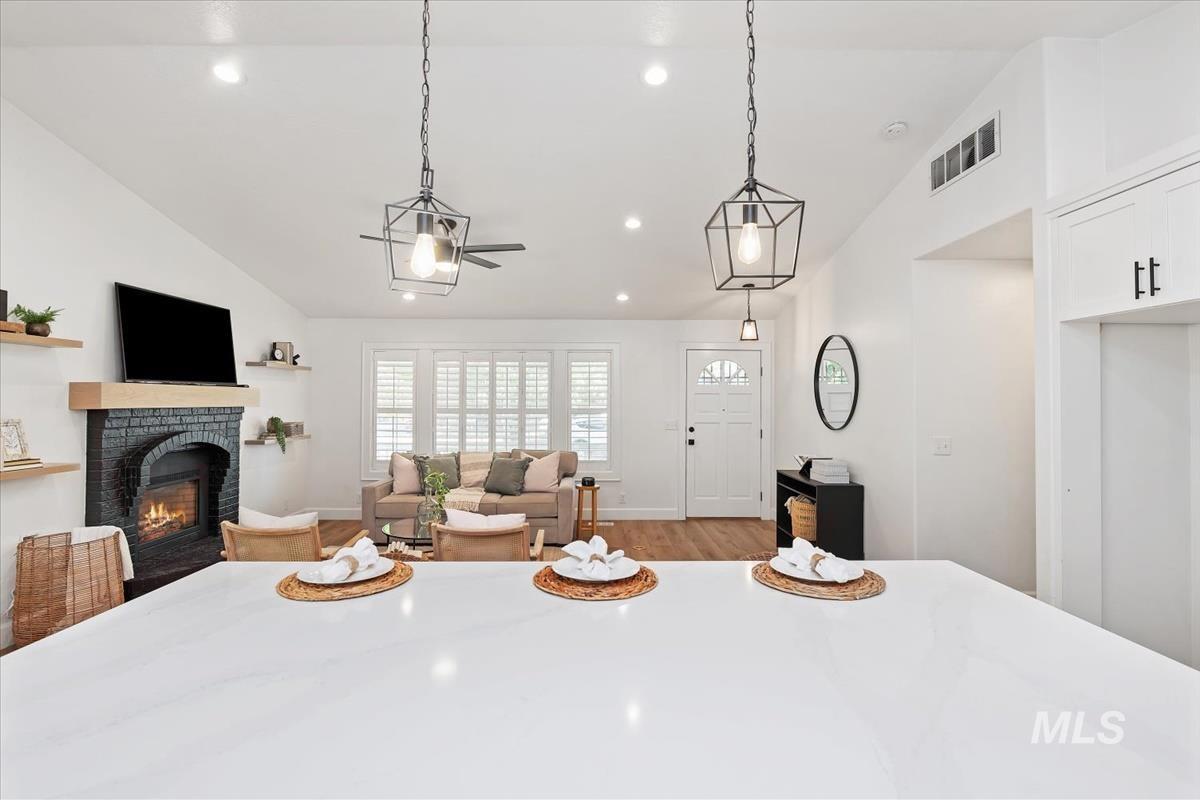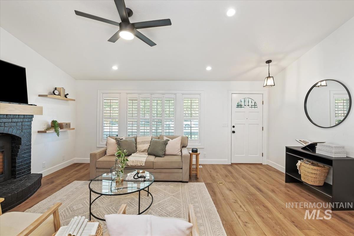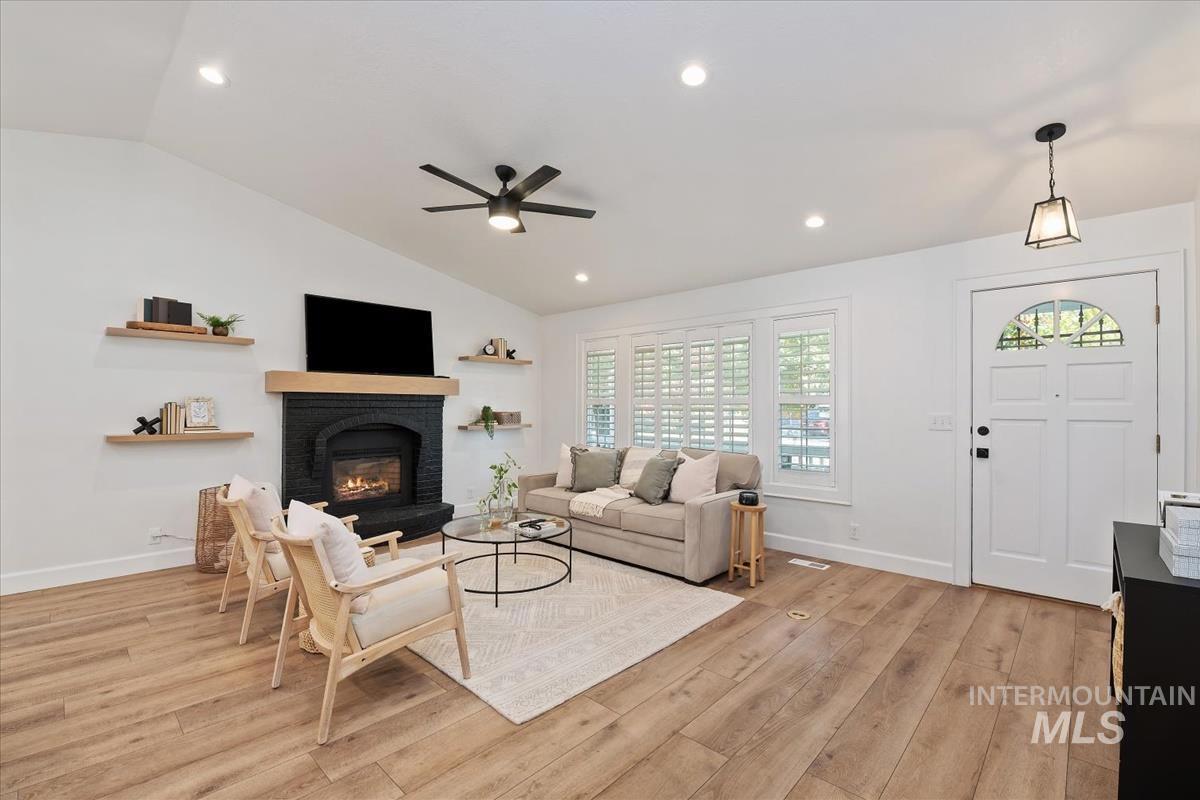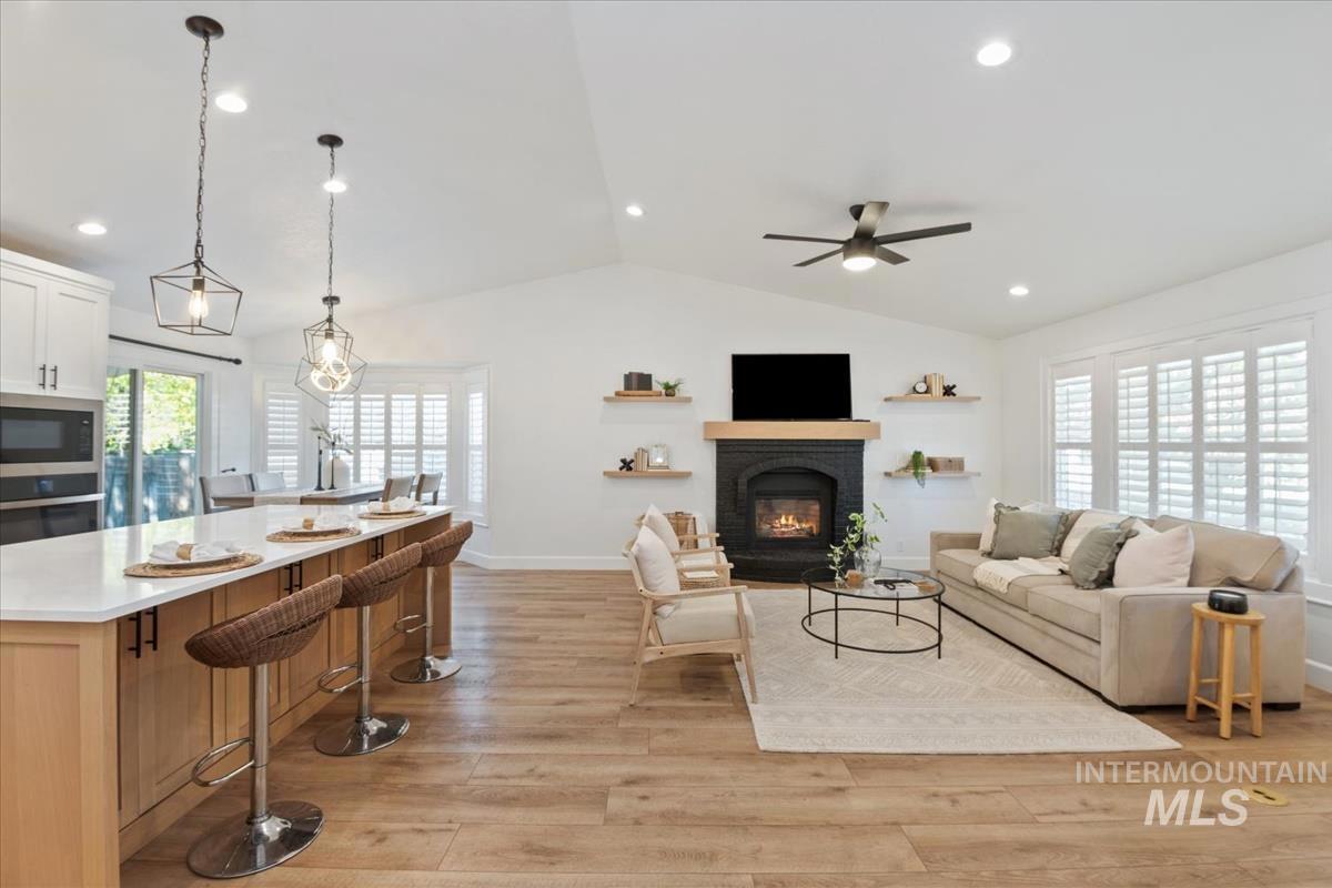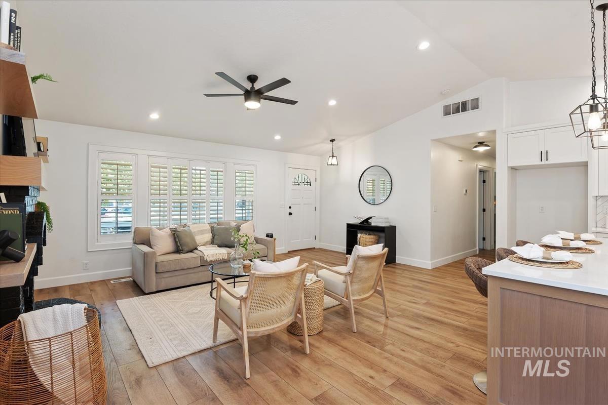 Welcome to this beautifully renovated single-level home in a highly desirable central Boise location. Step inside to an inviting great room with vaulted ceilings and a cozy fireplace, perfect for relaxing or entertaining. A spacious dining area, while the updated kitchen features a large island, new quartz counters, stainless steel appliances, new cabinetry, ample workspace, and a breakfast bar. Throughout the home, you’ll find plantation shutters, new LVP flooring, fresh paint, updated fixtures, and beautifully remodeled bathrooms with quartz countertops. The primary suite includes room for a sitting area, a large walk-in closet, and a private ensuite bath. Enjoy outdoor living in the lush backyard with mature landscaping, electric patio shades, and an insulated shed with drywall, paint, and power. Major updates include new HVAC, furnace, roof, and sprinkler system (2021). A stunning home — and nothing like it in th