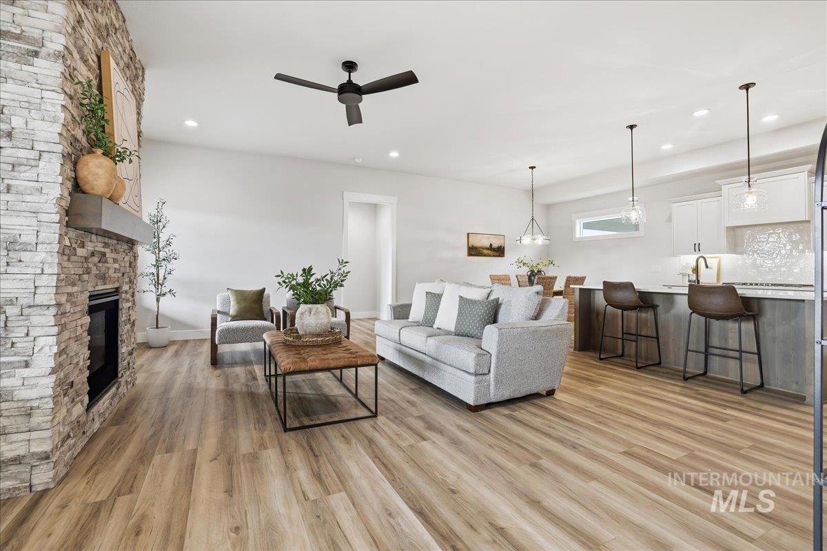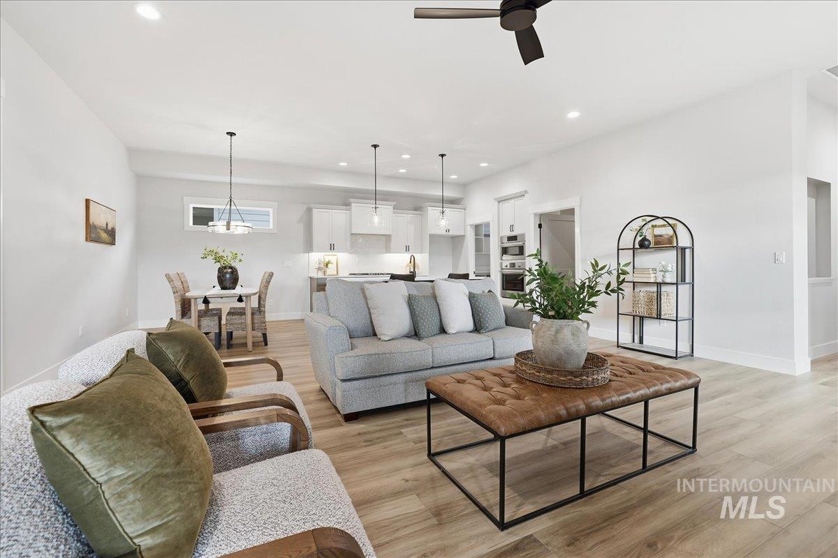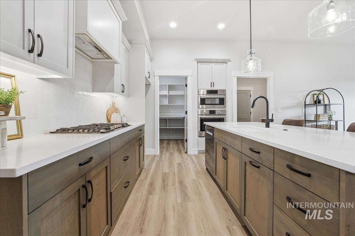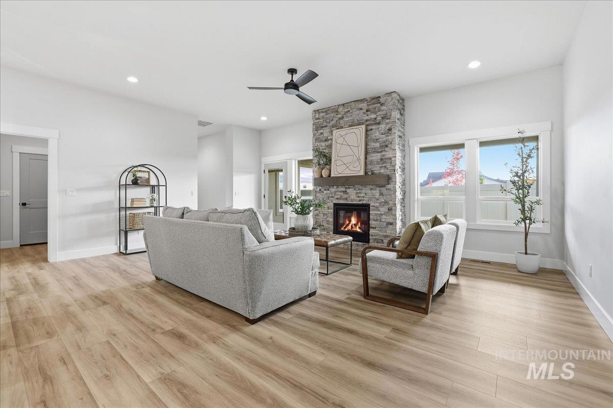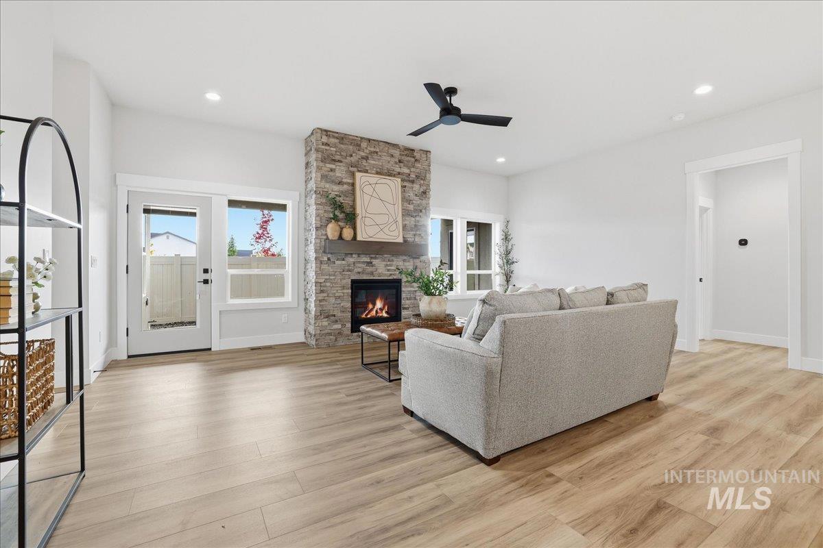 Welcome home to this beautiful single-level home by renowned builder Ted Mason Signature Homes. This thoughtfully crafted floor plan features 3 spacious bedrooms, 2 beautifully appointed bathrooms, and a spacious 32` deep garage. The heart of the home is the gourmet kitchen, showcasing premium Bosch appliances, a gas cooktop, built-in oven and microwave, oversized walk-in pantry, and a large center island that opens seamlessly to the dining area and great room. A cozy fireplace anchors the living space, creating a warm, inviting atmosphere. The primary suite offers abundant natural light, a luxurious zero-threshold walk-in shower, dual vanities, and a generous walk-in closet. Additional highlights include built-in cabinetry, fully tiled guest bath, and quality finishes throughout. Residents of Patagonia enjoy a community pool, scenic parks, and spacious green common areas, adding to the appeal of this sought-after neighborhood. Come home to relax!