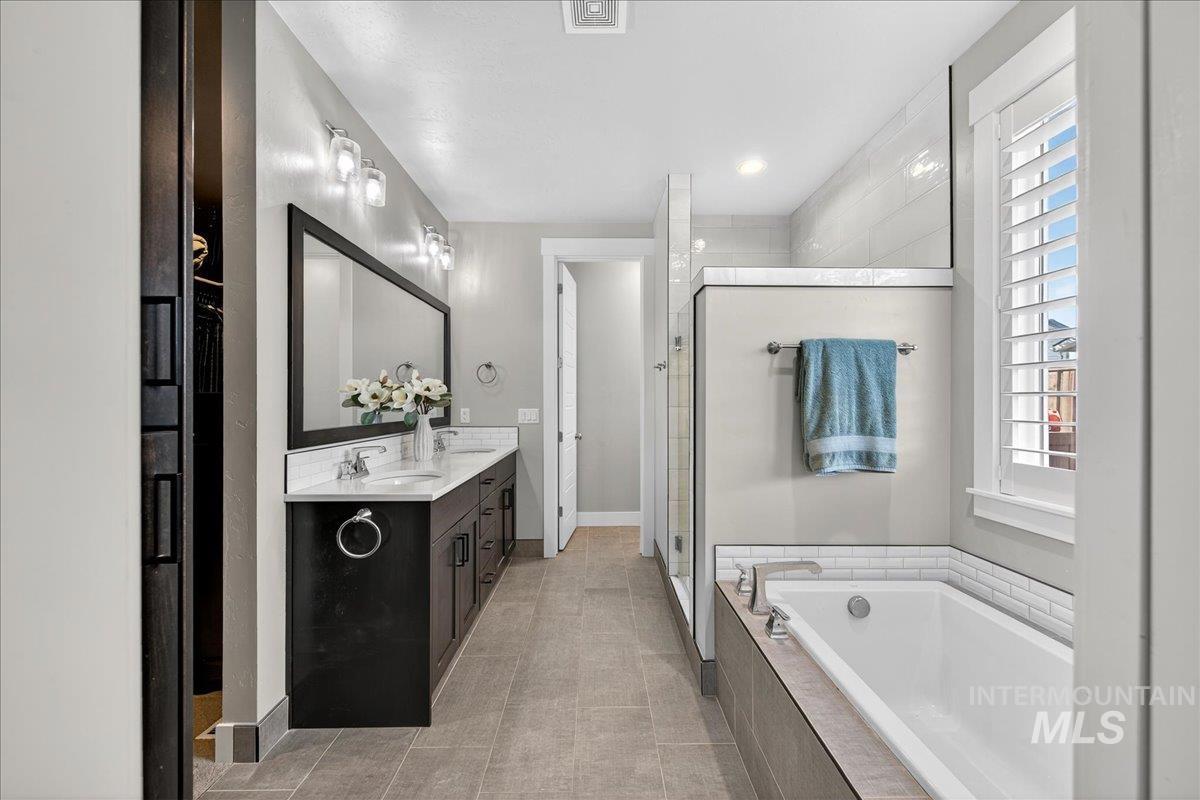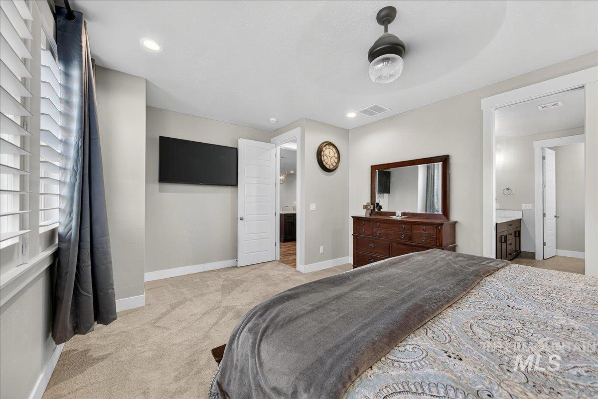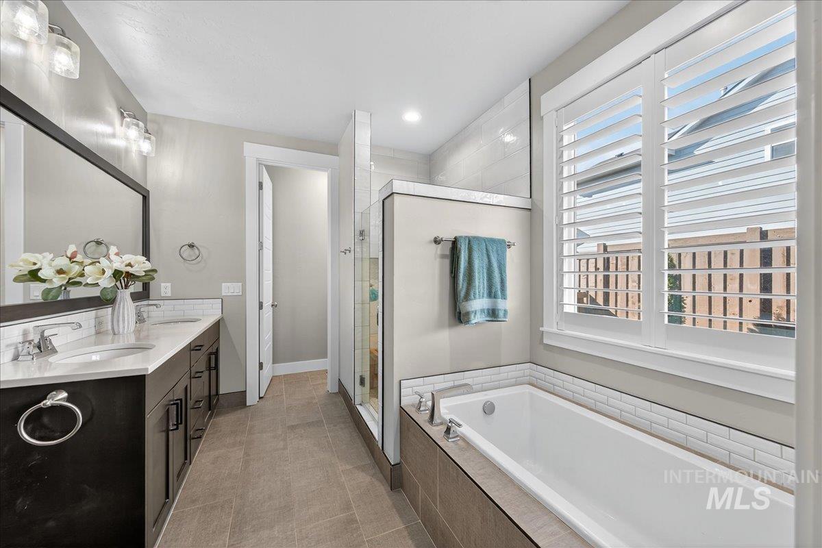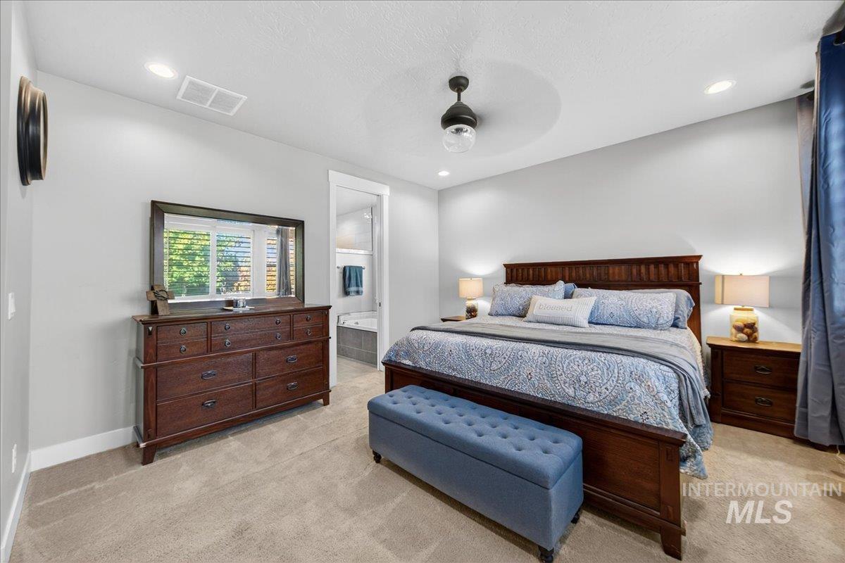 Step inside and feel it, the calm, the confidence, the kind of home that instantly wraps you in warmth and quiet sophistication. Nestled on a private, oversized corner lot in Meridian’s coveted Bainbridge community, this highly upgraded Alturas home was designed for those who crave open spaces, natural light, and intentional detail. The seamless single-level layout flows through expansive gathering spaces anchored by a stunning chef’s kitchen, complete with quartz countertops, soft-close cabinetry, stainless appliances, walk-in pantry, and an oversized island that becomes the heart of every conversation. The primary suite feels like a retreat, with a spa-inspired bath, walk-in shower, and generous dual vanities. Upstairs, a bonus room invites movie nights, workouts, or creative escapes. Outside, unwind under your covered patio, surrounded by raised garden beds and a private backyard powered by your PAID solar system. Even the 2.5-car garage was designed with thought, custom dog run access included. Bainbridge offers pools, parks, and paths that connect community and lifestyle. Every detail here whispers refinement, every corner feels like home.