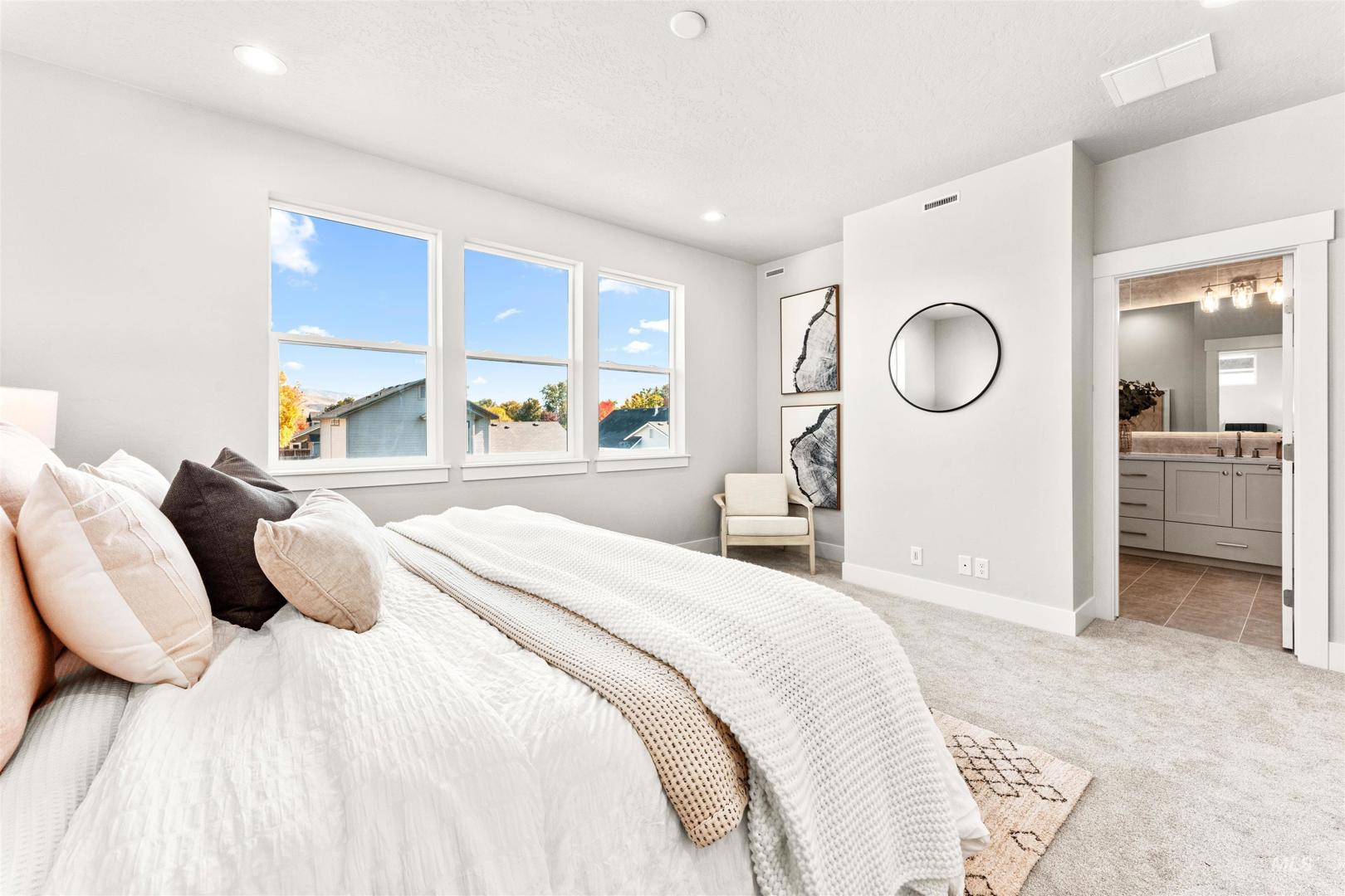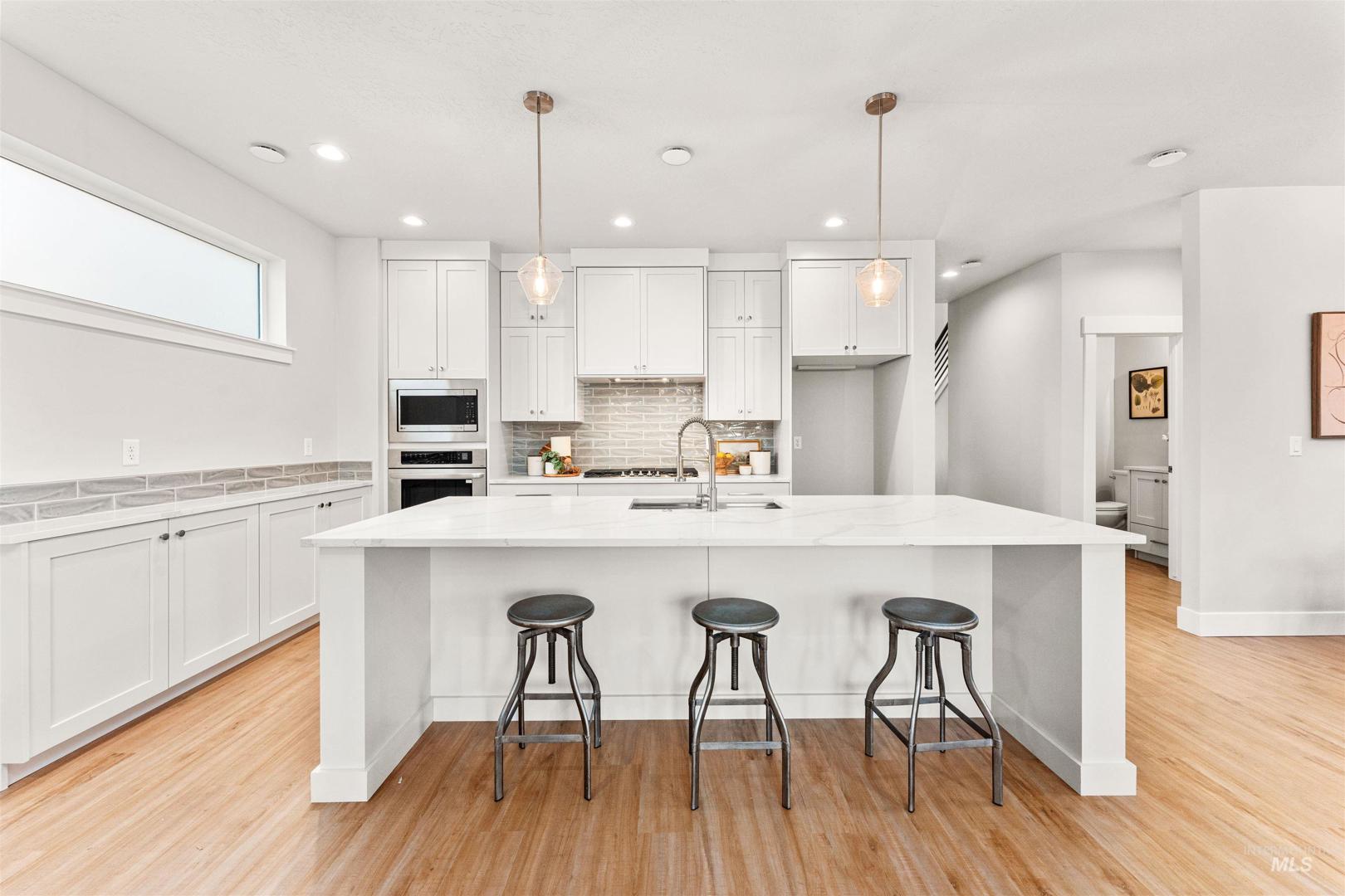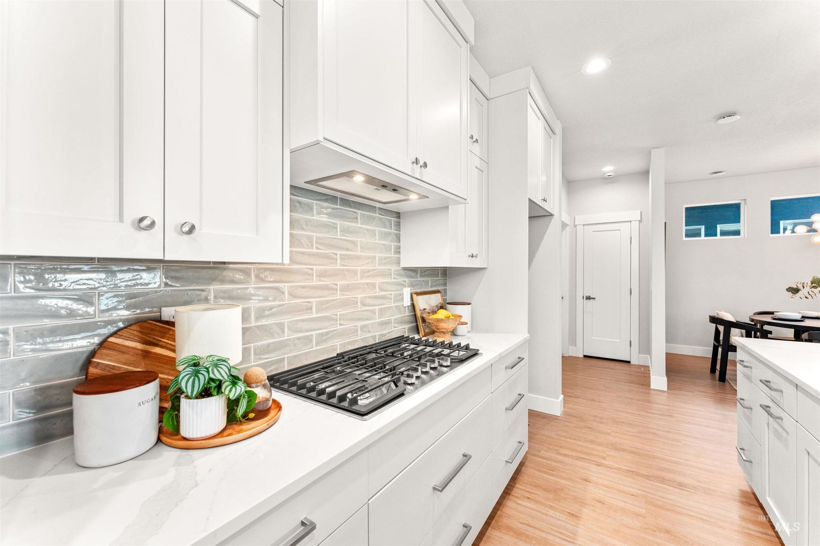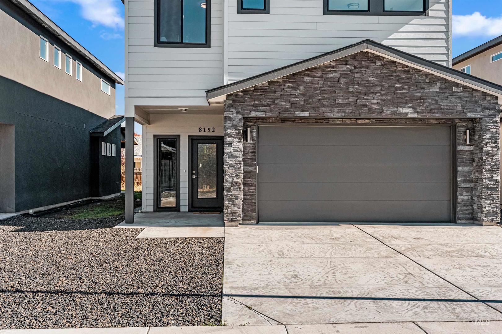 Elegant contemporary new construction in the highly sought-after NW Boise area! Perfectly situated near shopping, HWY 55, downtown Eagle, downtown Boise, the Greenbelt, and endless foothill trails. Step inside to discover an inviting open-concept floor plan designed for effortless living and entertaining. The sleek kitchen features a built-in stove with range cooktop, chic finishes, and an expansive pantry with room for a tech desk—ideal for organization or meal prep. Stylish countertops, modern hardware, and designer lighting flow throughout, creating a cohesive and elevated feel. The primary suite offers a serene retreat with an oversized, beautifully tiled walk-in shower and dual vanity space. Secondary bedrooms are generously sized with abundant closet space, providing comfort and versatility for guests, family, or a home office. A perfect blend of function, elegance, and location—your NW Boise dream home awaits!
