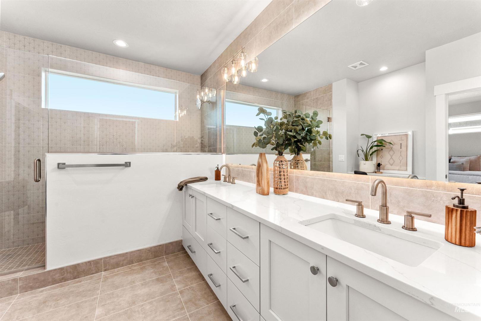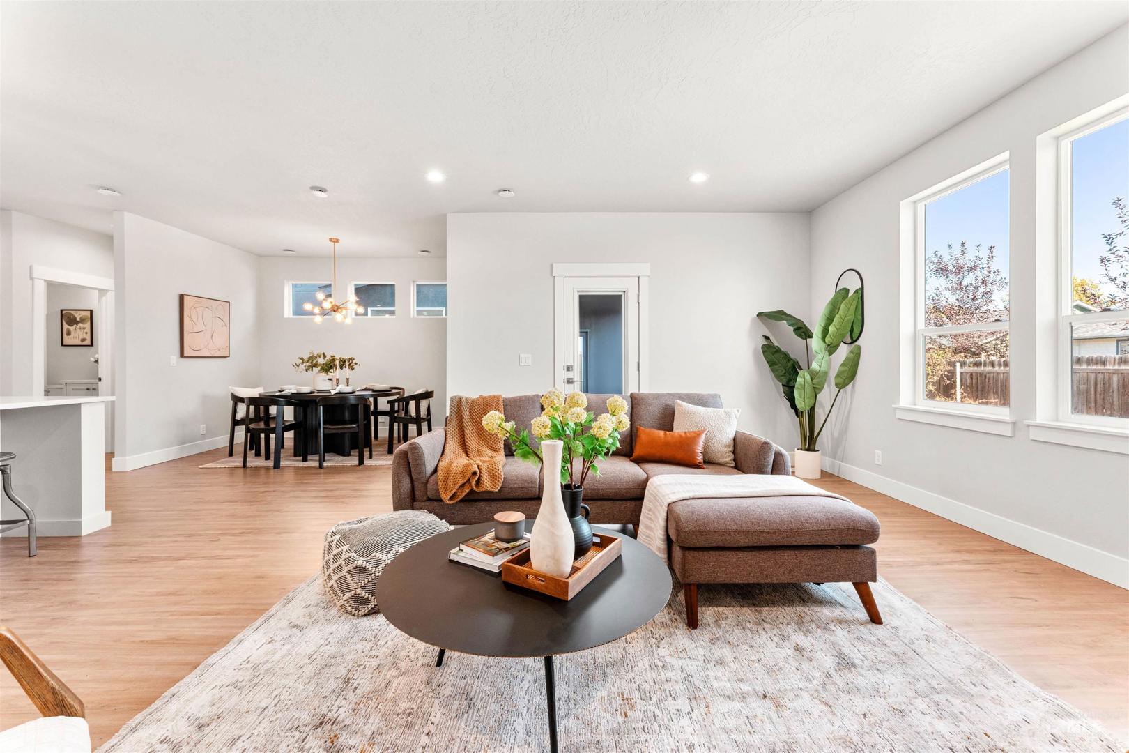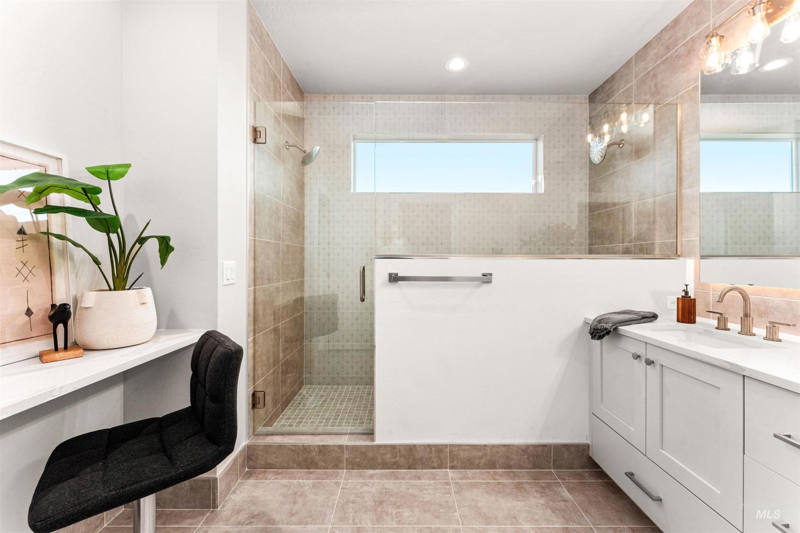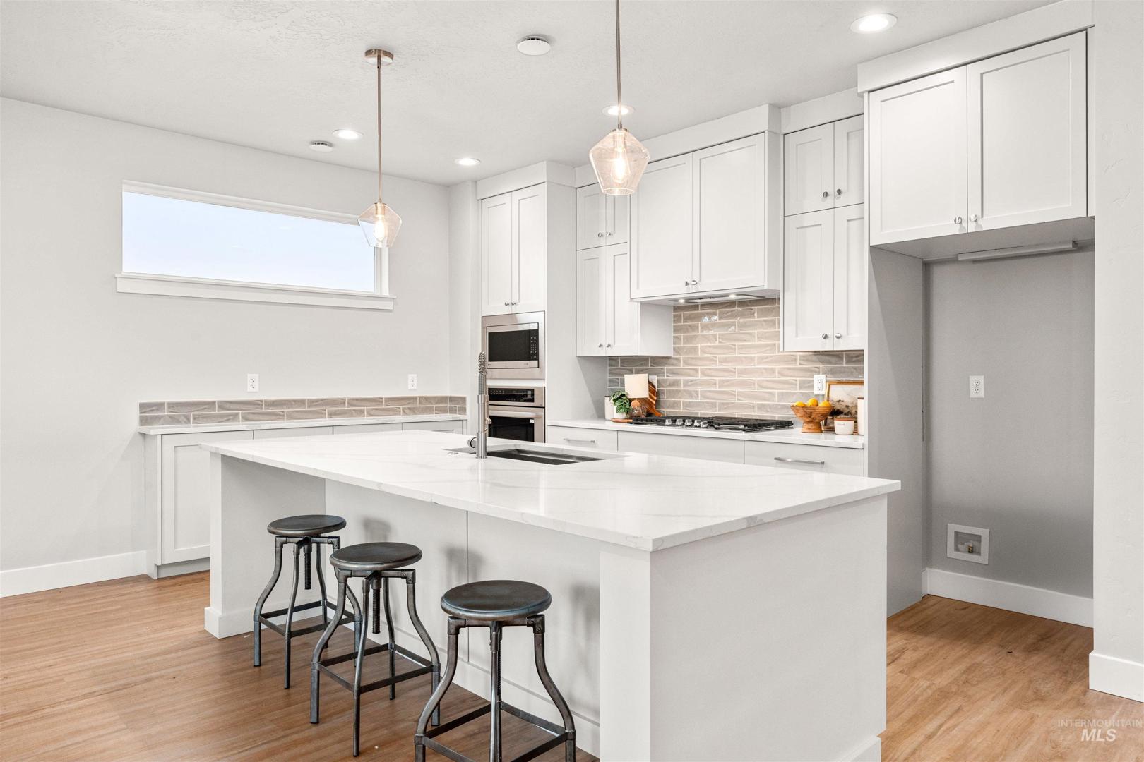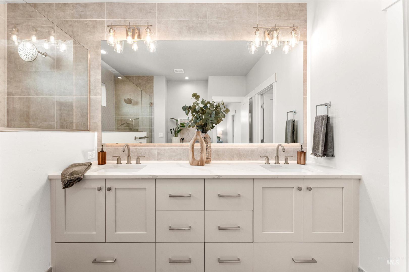 Elegant contemporary new construction in the highly sought-after NW Boise area! Perfectly situated near shopping, HWY 55, downtown Eagle, downtown Boise, the Greenbelt, and endless foothill trails. Step inside to discover an inviting open-concept floor plan designed for effortless living and entertaining. The sleek kitchen features a built-in stove with range cooktop, chic finishes, and an expansive pantry with room for a tech desk—ideal for organization or meal prep. Stylish countertops, modern hardware, and designer lighting flow throughout, creating a cohesive and elevated feel. The primary suite offers a serene retreat with an oversized, beautifully tiled walk-in shower and dual vanity space. Secondary bedrooms are generously sized with abundant closet space, providing comfort and versatility for guests, family, or a home office. A perfect blend of function, elegance, and location—your NW Boise dream home awaits!