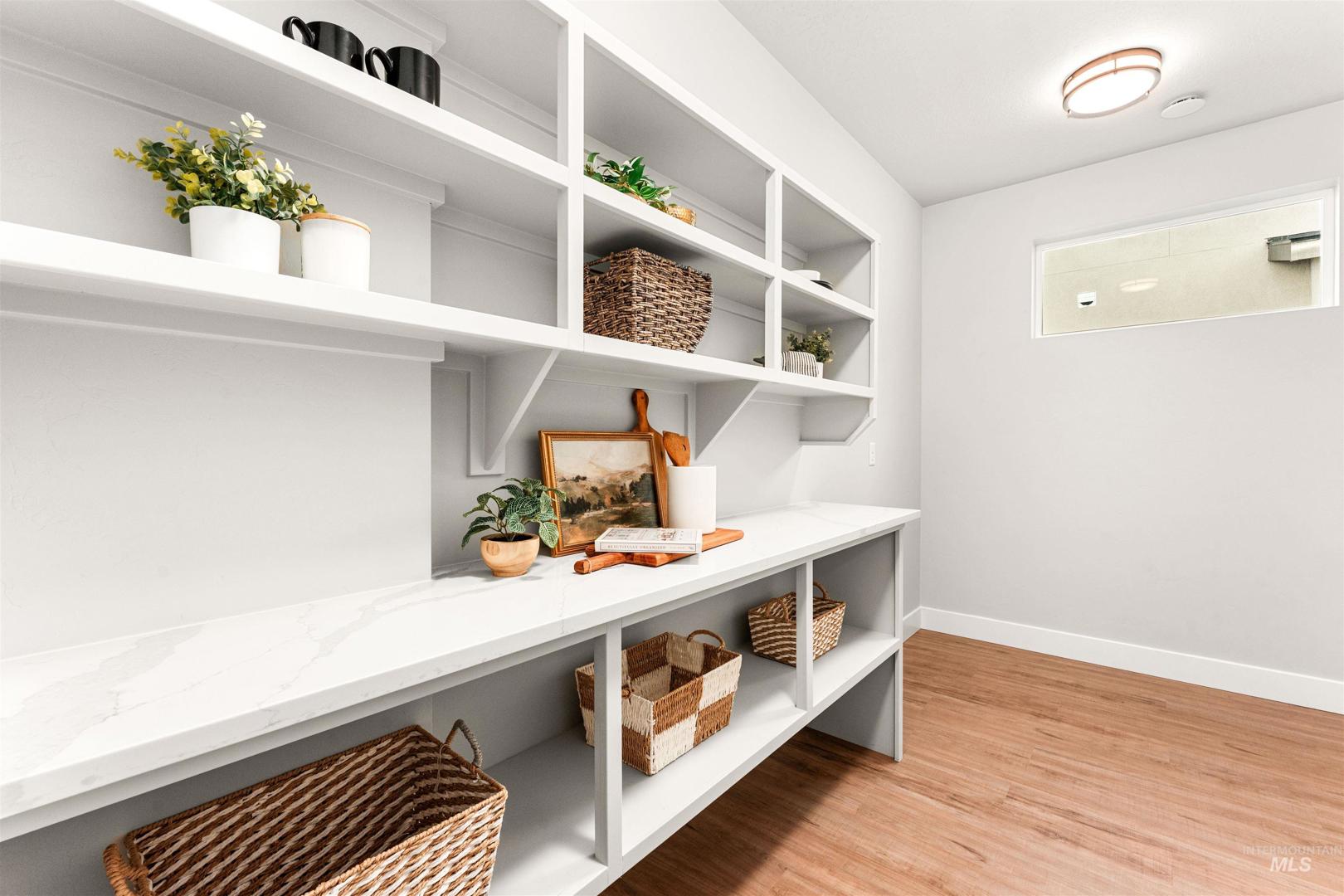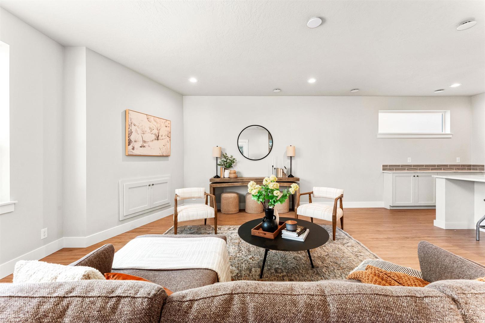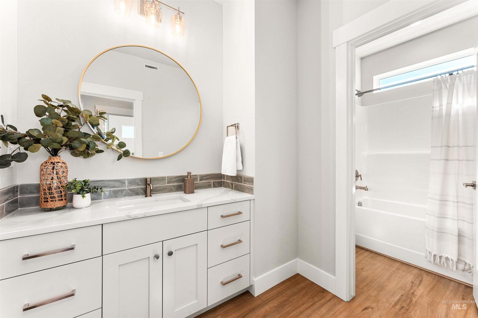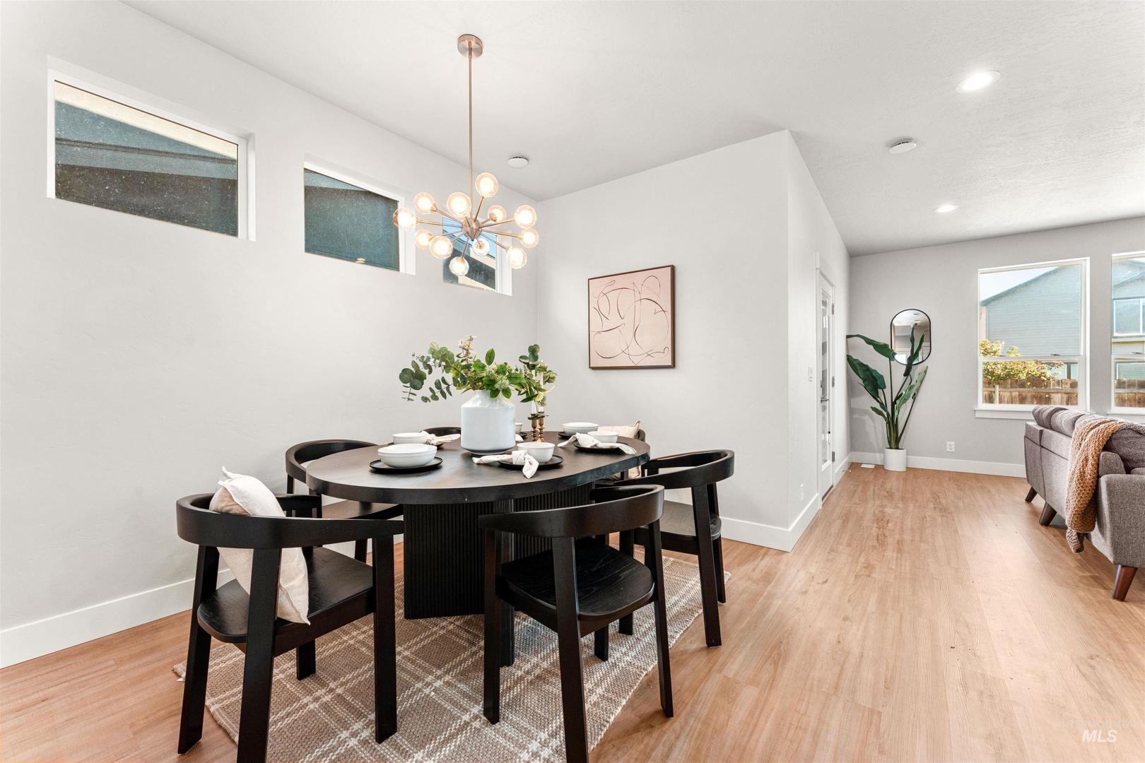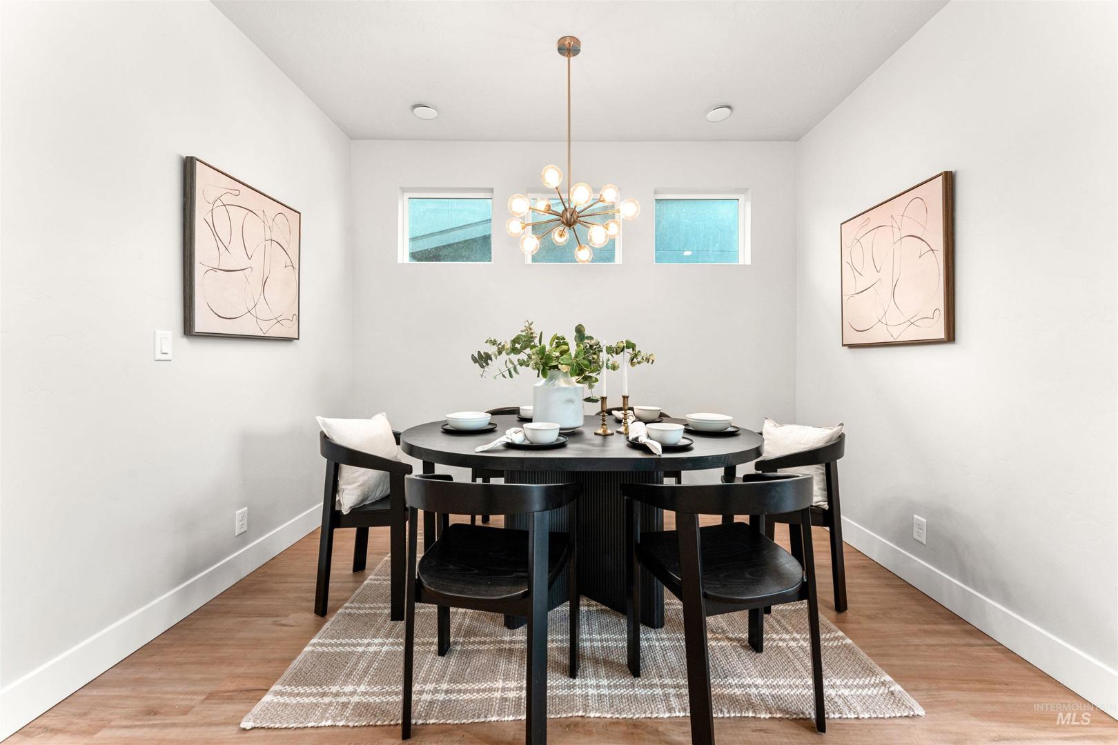 Elegant contemporary new construction in the highly sought-after NW Boise area! Perfectly situated near shopping, HWY 55, downtown Eagle, downtown Boise, the Greenbelt, and endless foothill trails. Step inside to discover an inviting open-concept floor plan designed for effortless living and entertaining. The sleek kitchen features a built-in stove with range cooktop, chic finishes, and an expansive pantry with room for a tech desk—ideal for organization or meal prep. Stylish countertops, modern hardware, and designer lighting flow throughout, creating a cohesive and elevated feel. The primary suite offers a serene retreat with an oversized, beautifully tiled walk-in shower and dual vanity space. Secondary bedrooms are generously sized with abundant closet space, providing comfort and versatility for guests, family, or a home office. A perfect blend of function, elegance, and location—your NW Boise dream home awaits!