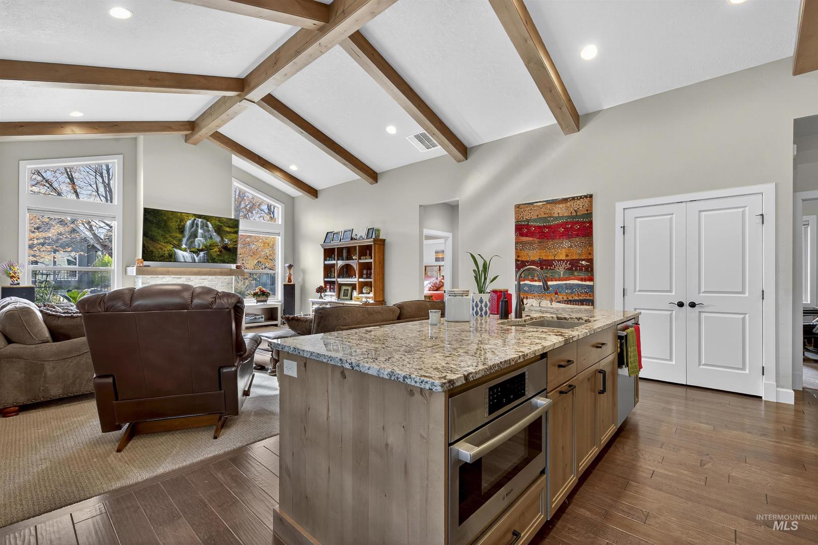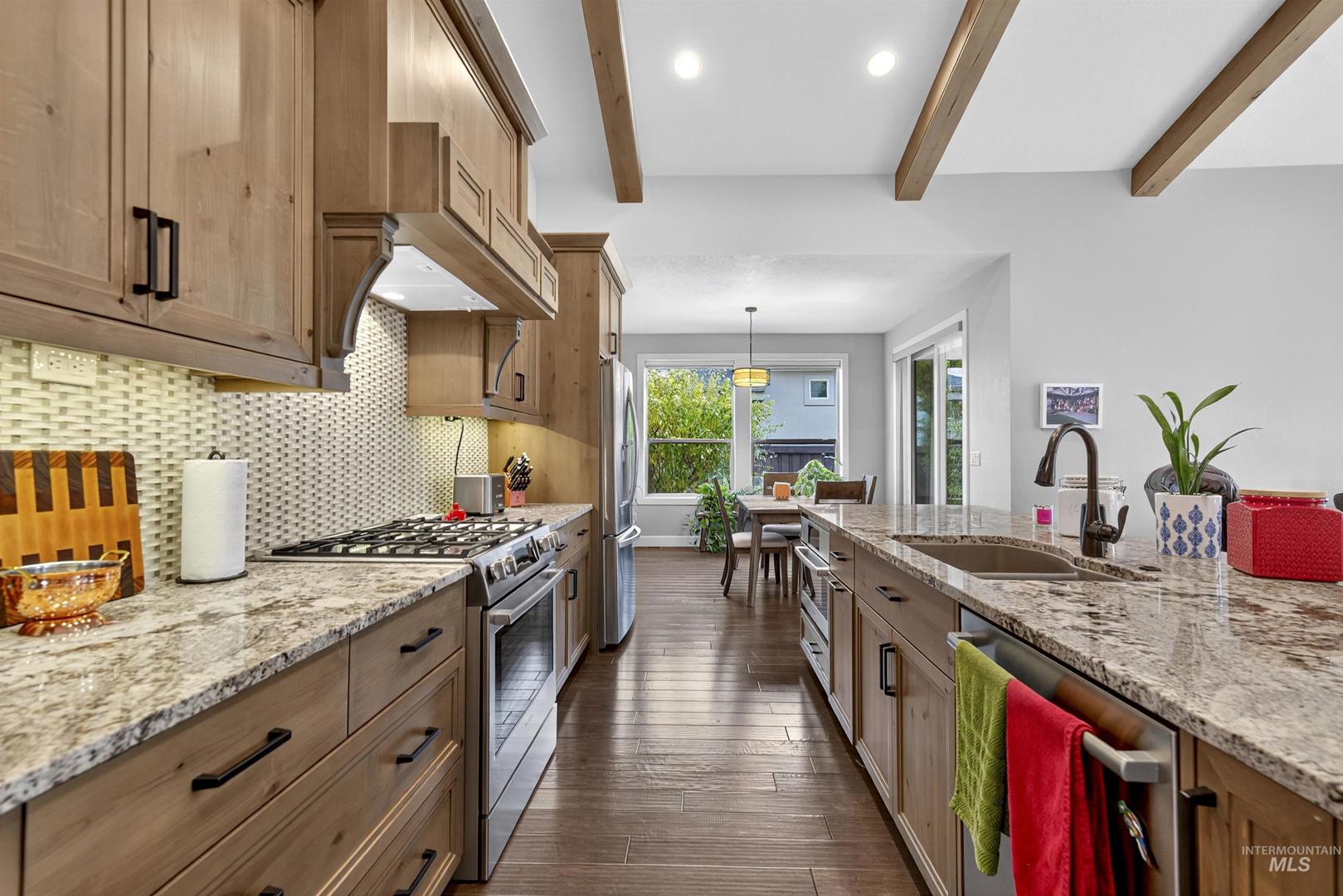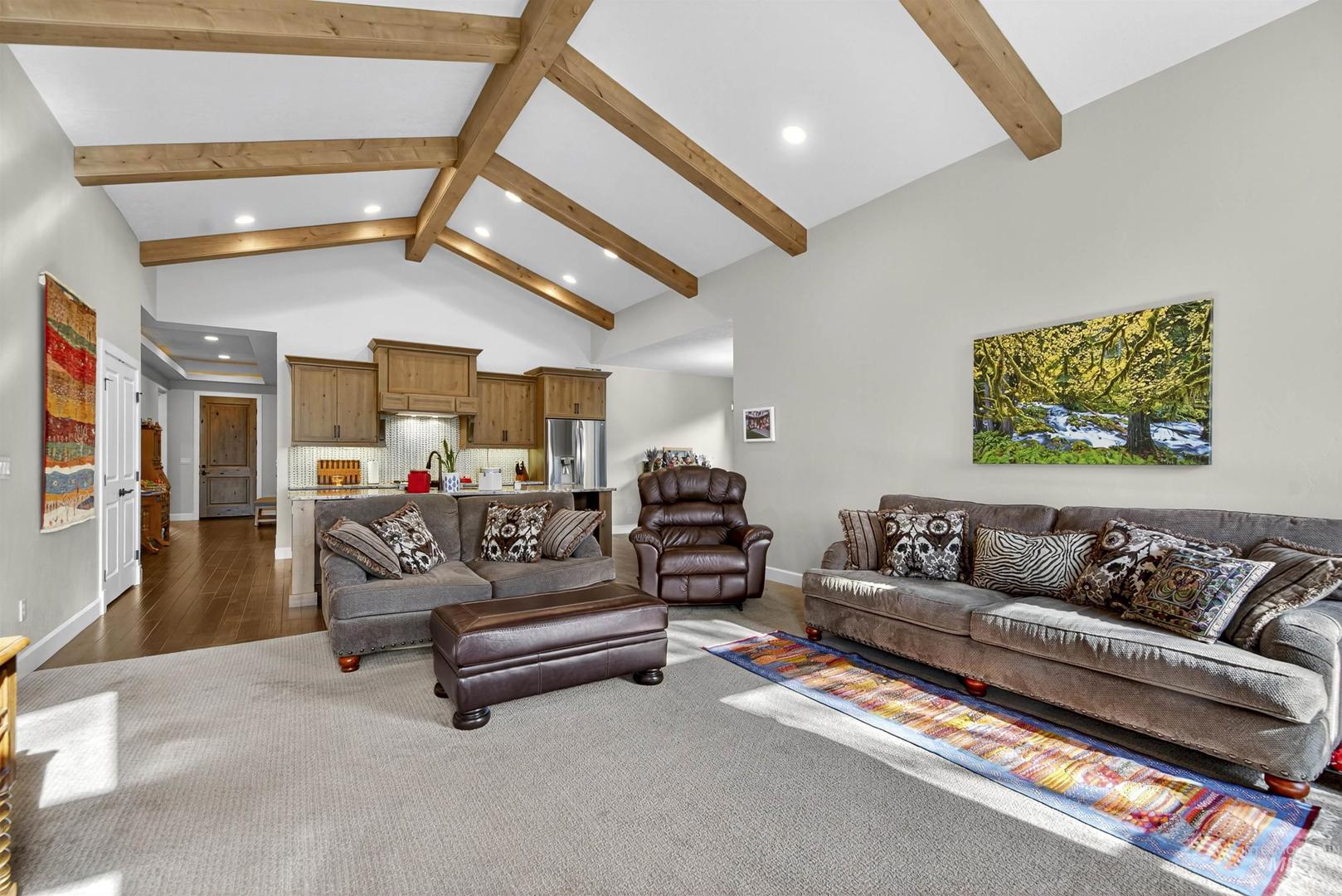 Welcome to an exceptional living experience in the coveted SpurWing community, where this stunning single-level home by renowned builder Blackstead Building Co awaits. The Pinewood floor plan was meticulously designed for superior comfort and style. Relax in nature and enjoy on your covered patio, with a backdrop of the tranquil, professionally landscaped common area. Entertain in elegance. The family room features vaulted ceilings with beautiful wood beams, creating a spacious and inviting atmosphere. Sunlight pours in, highlighting the exquisite, award-winning finishes. Cook like a chef and indulge your culinary passions in the state-of-the-art kitchen. It showcases high-end appliances, lustrous granite countertops, and custom-stained alder cabinets, a true testament to fine craftsmanship. Discover a lifestyle built for you. Your new home awaits!