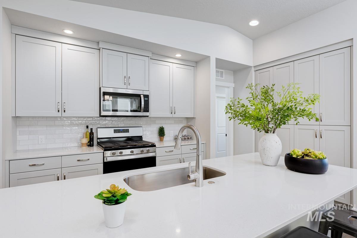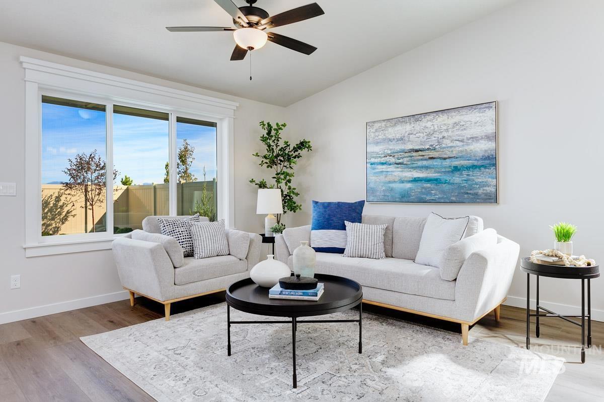 The PEORIA MODEL| Blackrock Homes. Introducing the Urban Collection at Skybreak- Enjoy COMMUNITY POOL, pickle ball court, playground + community dog parks! All quartz countertops (No cheap laminate), hardwood (lvp), upgraded trim detail, SS appliances including 5 burner gas range. Vaulted ceilings, spacious great room. Light & airy floor plan w/lots of natural light. South facing backyard. INCLUDES FULL VINYL FENCING & FRONT & REAR YARD SPRINKLERS & LANDSCAPING. Easy access to the interstate, Downtown Meridian, shopping, dining, & entertainment. *Photos similar but not of actual home. Selections similar but could vary. Buyer to verify. Gray Pebble package.