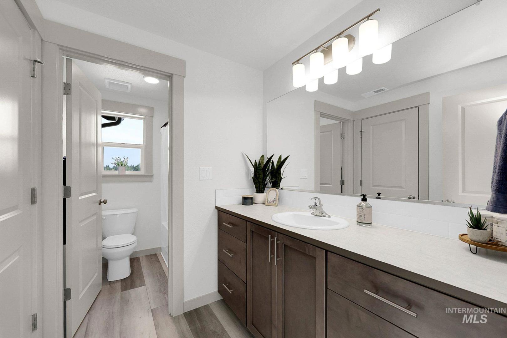 The 1743 square foot Middleton combines luxury and space in a two-story home plan. The first floor features an expansive living room and adjoining dining room, both overlooked by an open kitchen that offers ample counter space and cupboard storage with the added convenience of a built-in desk or beverage center. Upstairs, the extravagant main suite boasts a luxurious dual vanity bathroom with a private water closet and shower, as well as an enormous closet. The two other sizable bedrooms, each with generous closet space, share a large private bathroom and complete this well-rounded home. Photos Similar.