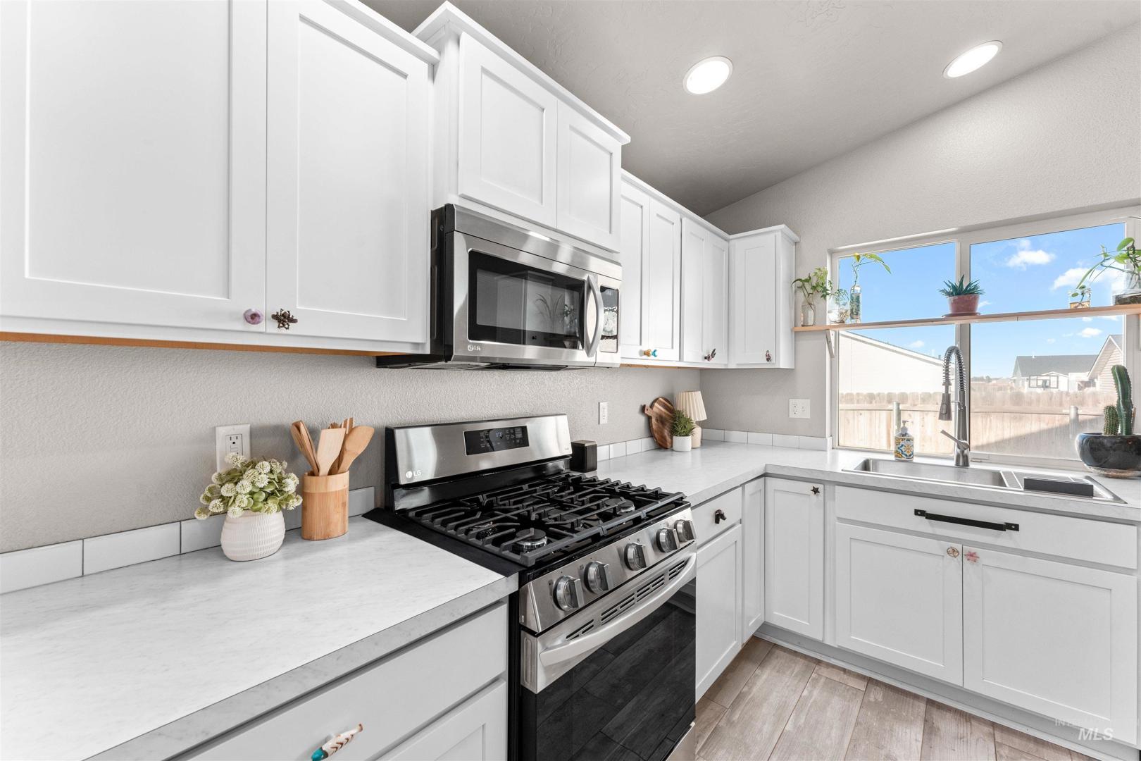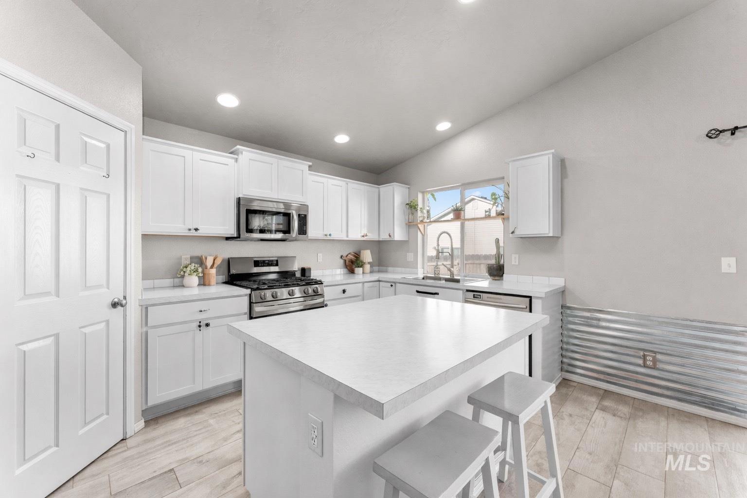 Welcome to this beautifully maintained single-level home offering 1,844 square feet of thoughtfully designed living space in a desirable and well-established area. Featuring 4 bedrooms, 2 bathrooms, and a functional split-bedroom layout, this home delivers both privacy and everyday convenience. Beautiful tile flooring flows throughout the main living areas, paired with vaulted ceilings that create an open, light, and welcoming atmosphere. The kitchen is the heart of the home and showcases an island, pantry, and built-in breakfast bar that is perfect for casual meals, entertaining, or gathering with family and friends. The oversized primary suite provides a comfortable retreat, complete with a spacious walk-in closet, dual sinks, built-in shelving, and a well-appointed en-suite bathroom. Three additional bedrooms offer flexibility for guests, a home office, or growing needs. Enjoy the added benefit of paid-off solar panels, offering long-term energy efficiency and potential monthly savings. Step outside to a fully fenced backyard with a pergola, ideal for outdoor dining, relaxing evenings, or weekend get-togethers. A two-car garage adds convenience and additional storage. Located in a great area close to schools, shopping, dining, and everyday amenities, this home is an excellent opportunity for comfortable, low-maintenance living.