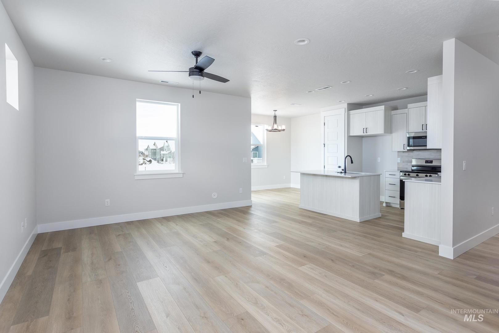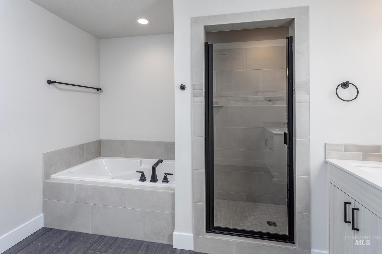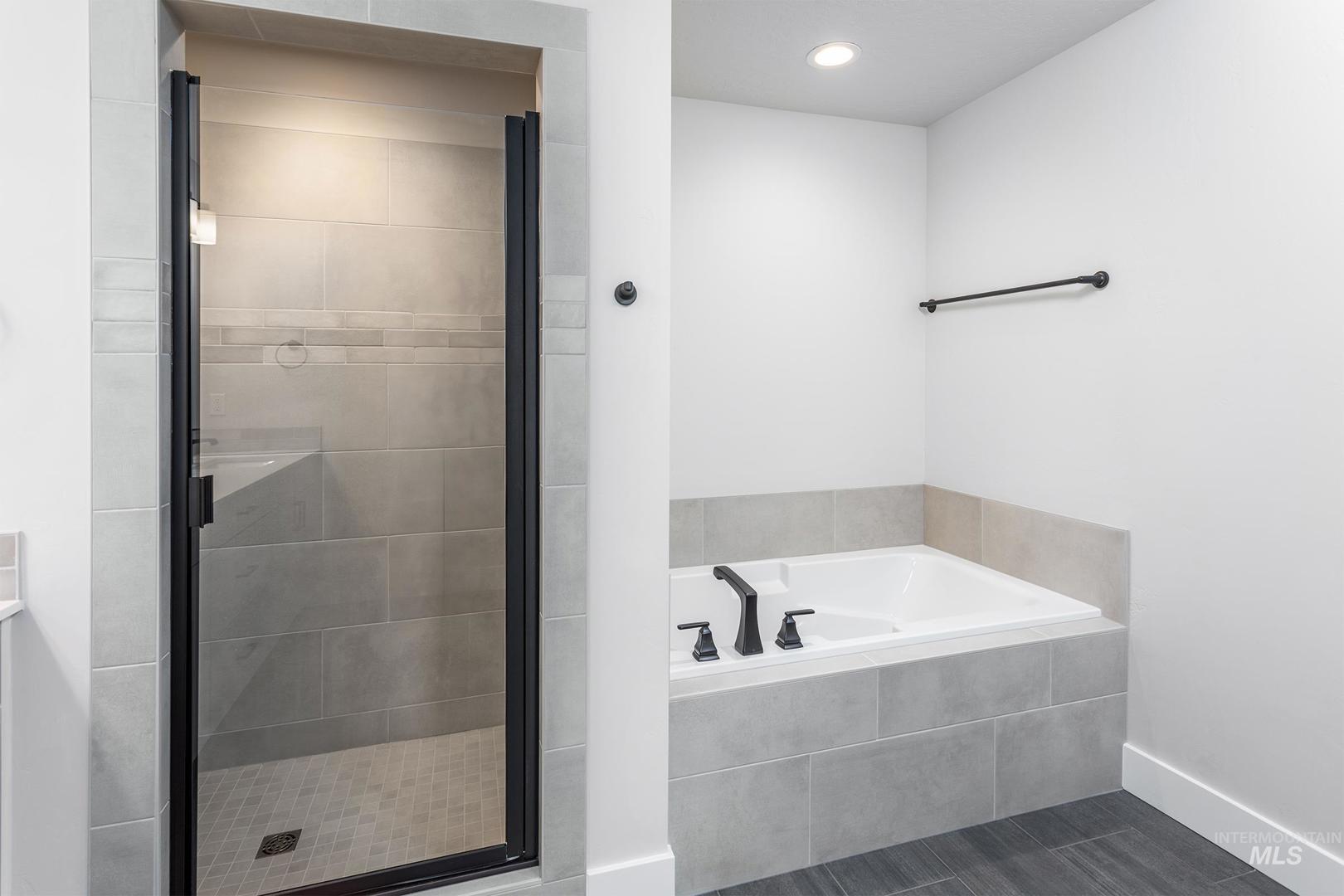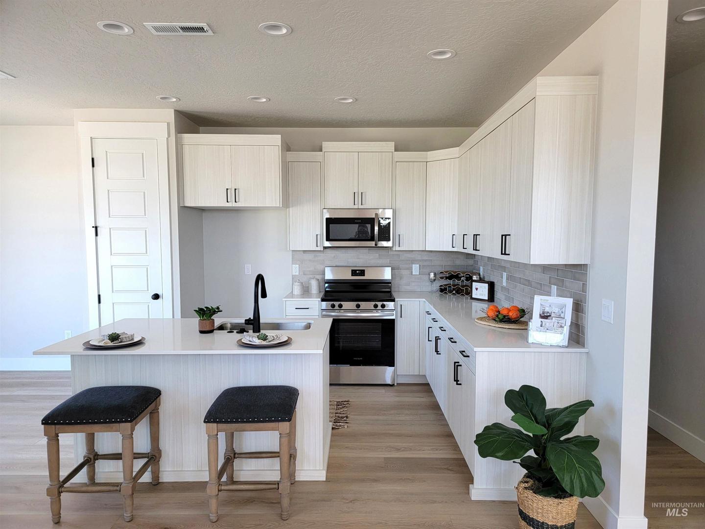 New construction townhome in Kuna, Idaho offering 1,687 sq ft with two large bedroom suites located on the second floor, each featuring its own spa-like bathroom, plus an additional half bath on the main level. The open-concept main floor showcases LVP flooring throughout, a modern kitchen with full tile backsplash, quartz counter tops and soft-close cabinets and drawers throughout the home. Both bedroom suites include a tile shower and separate soaker tub. Designed for low-maintenance living with quality finishes in a growing location near local amenities and outdoor recreation.