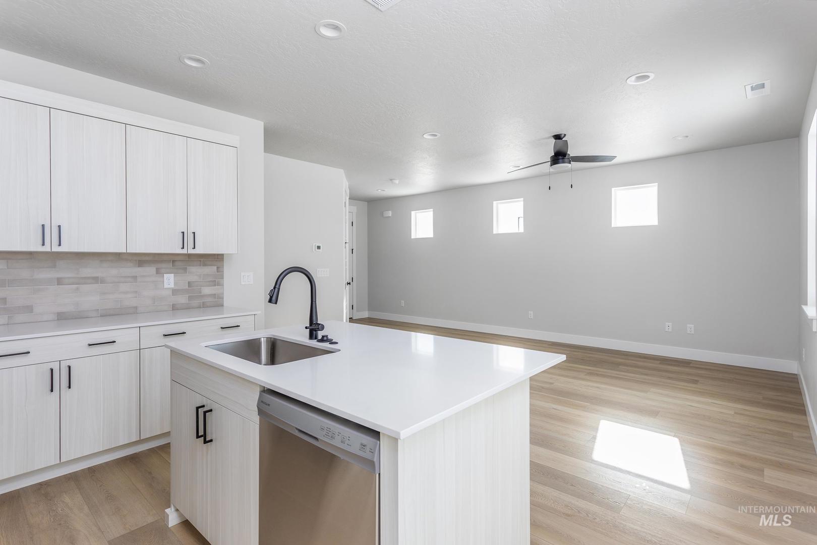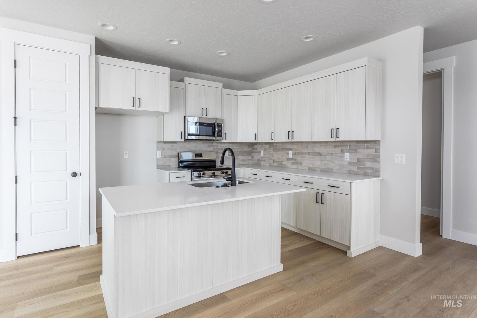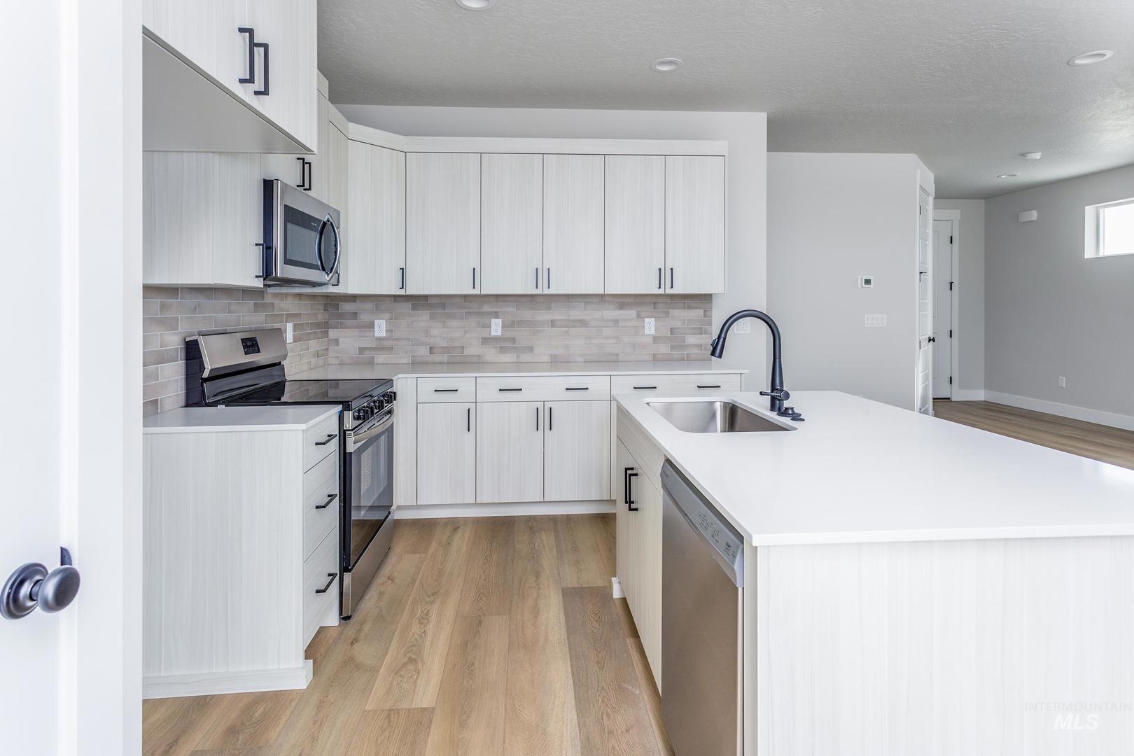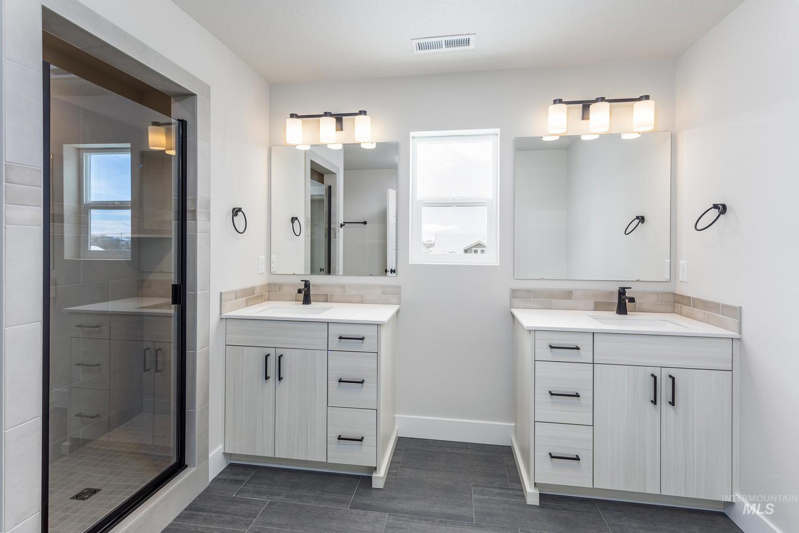 New construction townhome in Kuna, Idaho offering 1,687 sq ft with two large bedroom suites located on the second floor, each featuring its own spa-like bathroom, plus an additional half bath on the main level. The open-concept main floor showcases LVP flooring throughout, a modern kitchen with full tile backsplash, quartz counter tops and soft-close cabinets and drawers throughout the home. Both bedroom suites include a tile shower and separate soaker tub. Designed for low-maintenance living with quality finishes in a growing location near local amenities and outdoor recreation.