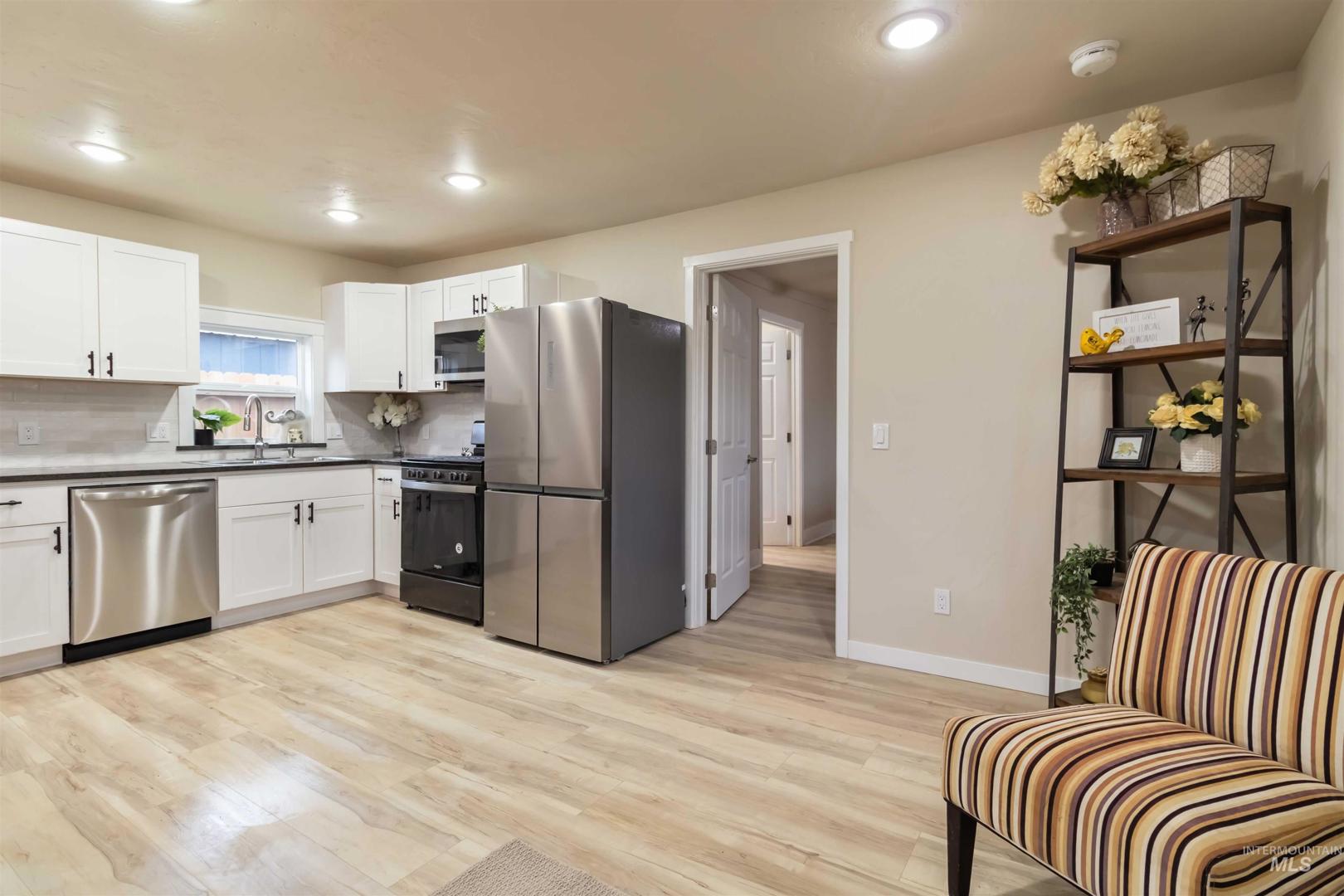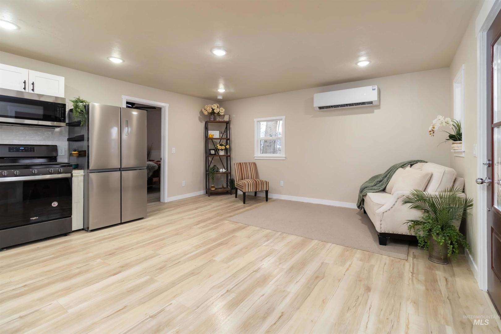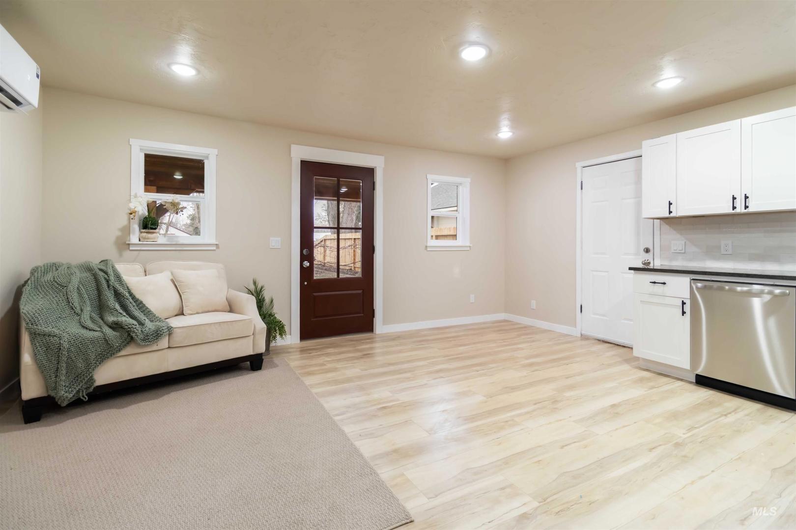 This beautifully updated 1 bedroom, 1 bathroom home offers modern comfort, privacy, and functionality on a spacious lot. Inside, the open-concept living area is filled with natural light and features durable laminate flooring throughout. The kitchen is thoughtfully designed with white cabinetry, stainless steel appliances, and ample counter and storage space, creating a bright and inviting atmosphere. The bedroom provides a comfortable retreat, while the bathroom showcases a walk-in tiled shower and contemporary finishes. Efficient mini-split heating and cooling ensure year-round comfort and energy efficiency. Step outside to a covered front porch—perfect for relaxing or enjoying your morning coffee—and a large, partially fenced yard offering plenty of space for outdoor living, gardening, or entertaining. Set among beautiful, mature trees, this property offers a quiet, established setting with room to breathe and the kind of charm only time can create. Alley access adds to the home’s convenience and tucked-away feel. Whether you’re searching for a low-maintenance primary residence, rental property, or investment opportunity, this move-in-ready home offers style, functionality, and flexibility in a peaceful setting while remaining close to local amenities.