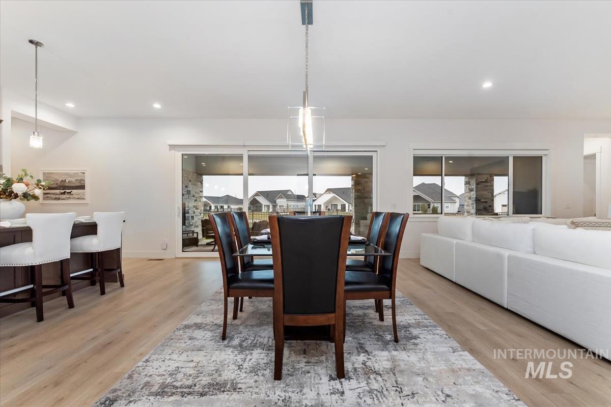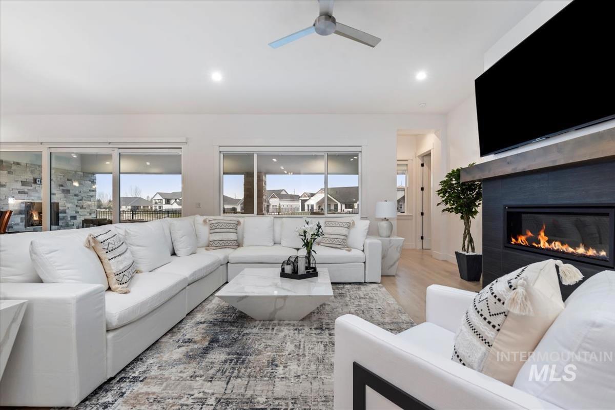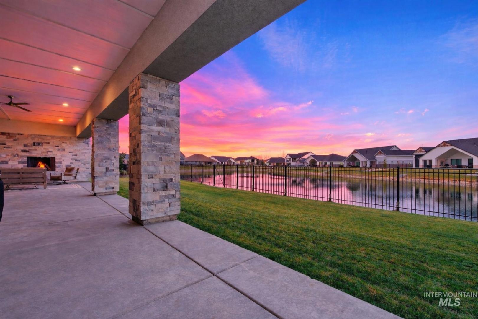 Best-priced waterfront per square foot in Eagle + 40’ RV garage. Nearly new single-level with 3,100+ sq ft, four ensuite bedrooms, and a true 40’ deep RV bay for boats, toys, or a home gym. The great room features a fireplace and a full wall of sliding glass doors framing the pond. The oversized covered patio is made for sunset watching as the sky reflects across the water. Paddleboard or fish from your backyard, or stroll to the Boise River and Greenbelt. Located in boutique Bald Eagle Point with pool, hot tub, pickleball, and walking paths—perfectly positioned between Eagle and Star with quick access to Hwy 16 and downtown Boise. Waterfront living. RV flexibility. Eagle address. Hard to beat at this price.