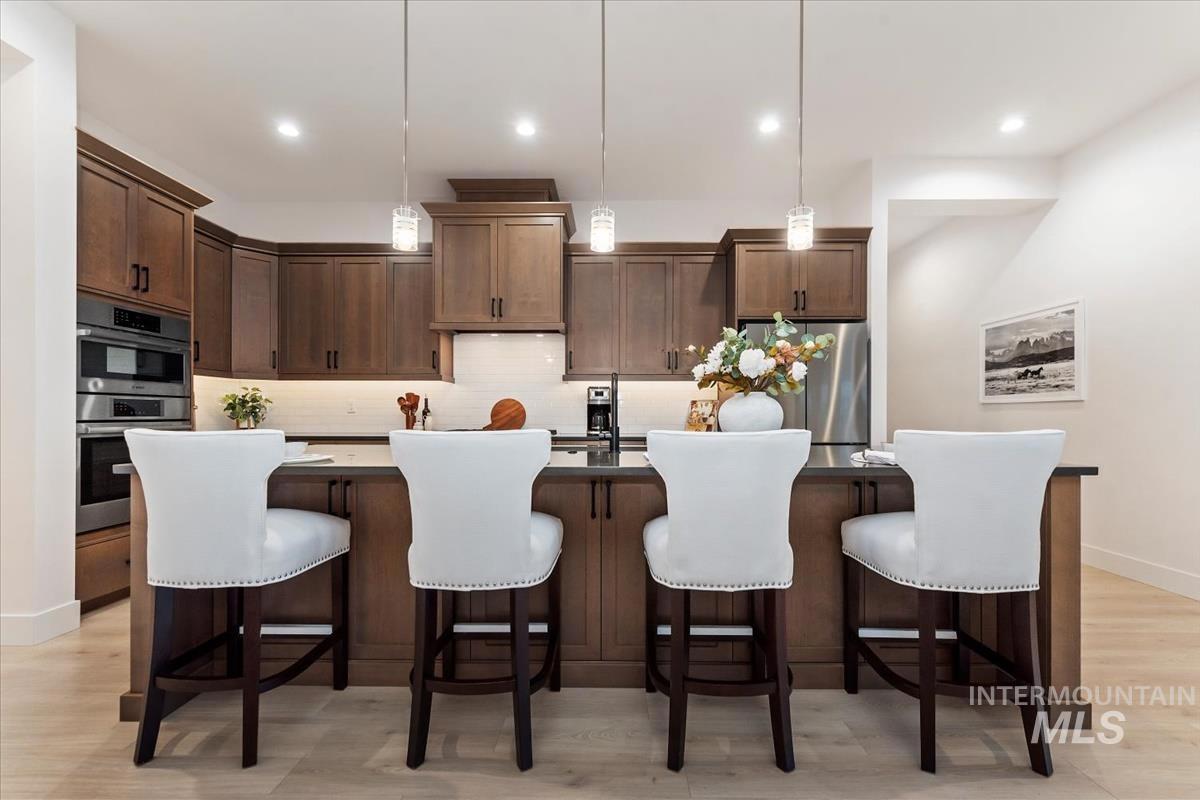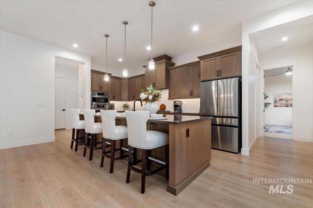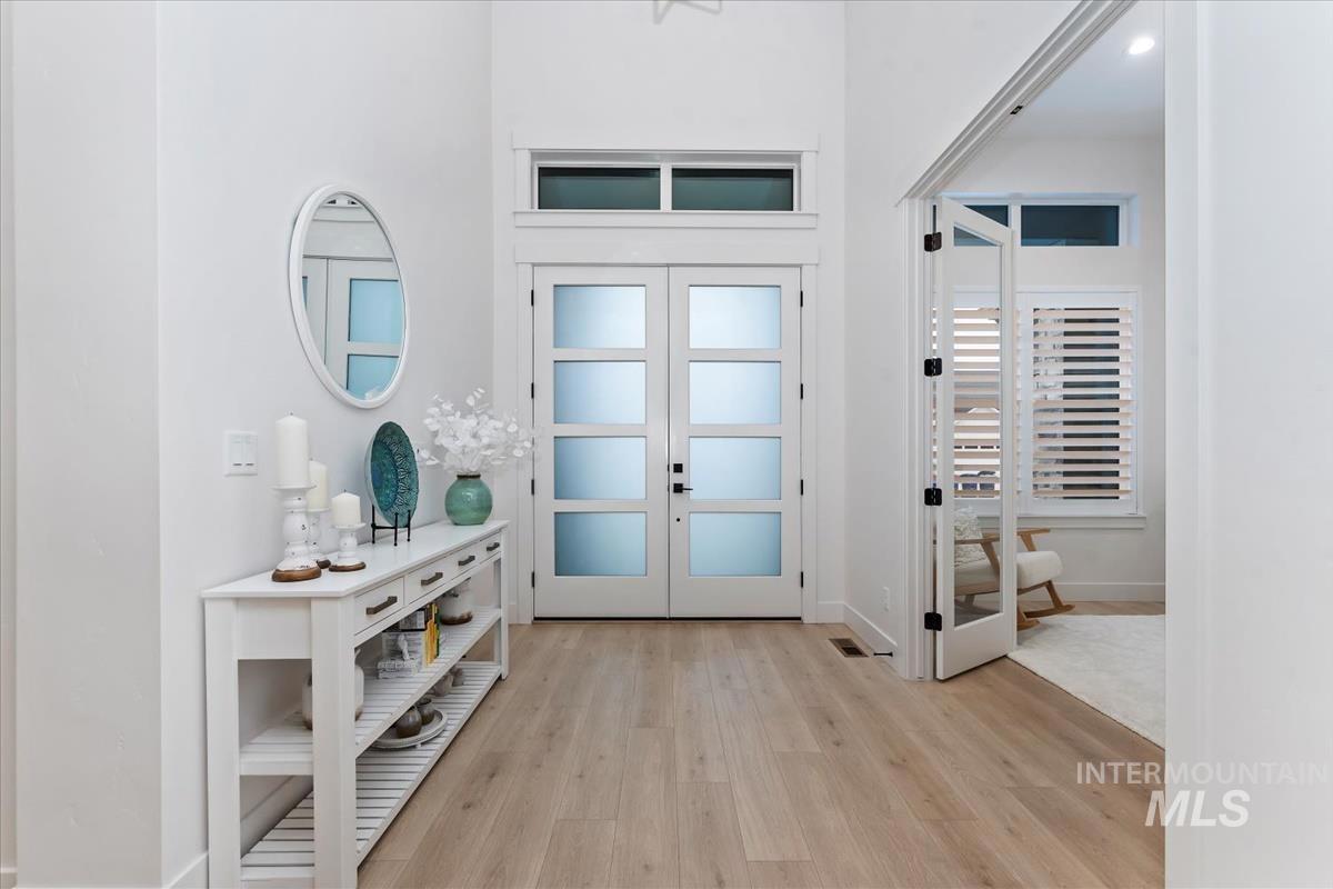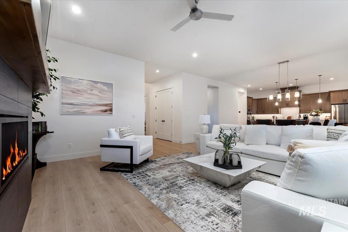 Best-priced waterfront per square foot in Eagle + 40’ RV garage. Nearly new single-level with 3,100+ sq ft, four ensuite bedrooms, and a true 40’ deep RV bay for boats, toys, or a home gym. The great room features a fireplace and a full wall of sliding glass doors framing the pond. The oversized covered patio is made for sunset watching as the sky reflects across the water. Paddleboard or fish from your backyard, or stroll to the Boise River and Greenbelt. Located in boutique Bald Eagle Point with pool, hot tub, pickleball, and walking paths—perfectly positioned between Eagle and Star with quick access to Hwy 16 and downtown Boise. Waterfront living. RV flexibility. Eagle address. Hard to beat at this price.
