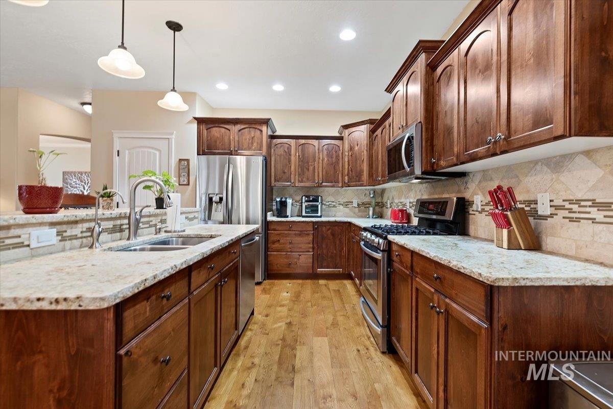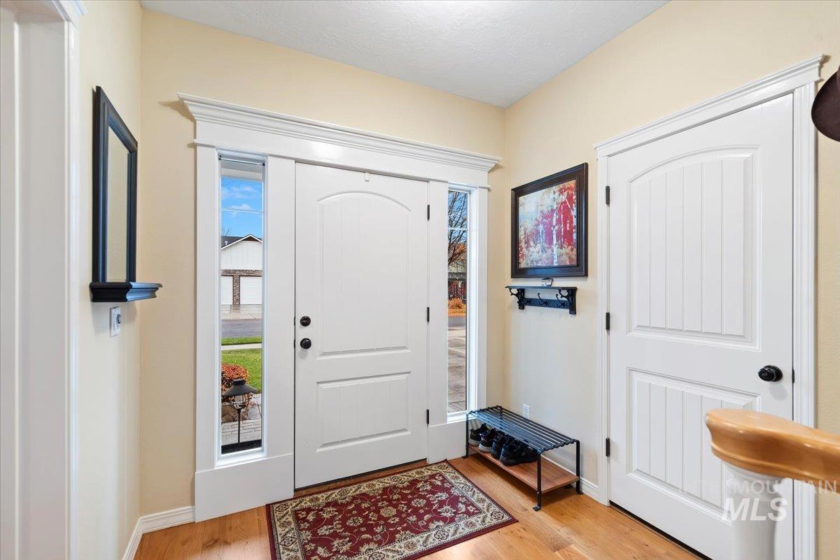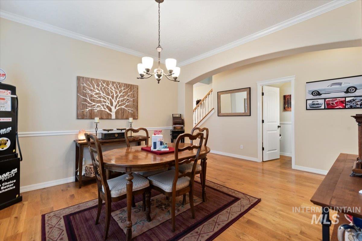 Beautifully positioned in the heart of Eagle, this refined 5-bedroom, 2.5-bath residence blends timeless elegance with everyday comfort. Just moments from Eagle’s premier dining, shopping, and amenities, the home showcases a grand open-concept kitchen and dining space designed to impress. Chiseled-edge granite countertops, rich hardwood flooring, and custom cabinetry anchor the space, creating an ideal setting for both intimate evenings and upscale entertaining. Enjoy tranquil views and enhanced privacy with no rear neighbors, while scenic community walking paths and a new bike park and sports complex lie just beyond the backyard. The main level features a comfortable living room, an inviting sitting room that can double as a private office, and a formal dining room—ideal for everyday living and entertaining. Upstairs, a spacious landing leads to generously appointed bedrooms and an oversized, thoughtfully designed laundry room. A versatile fifth bedroom provides flexibility for a bonus room, executive office, fitness studio, or media retreat. Completing the home is an exceptional 5-car garage, ideal for car enthusiasts, recreational toys, or additional storage. This distinguished home delivers luxury, versatility, and a coveted Eagle lifestyle—an opportunity not to be missed.