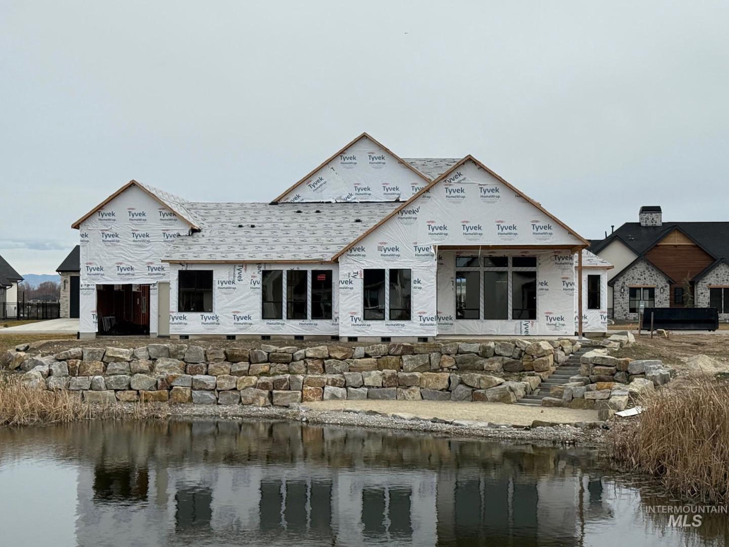Welcome to the Lakeshore plan, a beautifully designed open-concept home offering timeless style and upscale features ideal for Idaho living. This spacious floor plan includes 4 bedrooms, 3.5 bathrooms, and a dedicated office, delivering exceptional comfort and functionality. The main level features a luxurious primary suite complete with a soaker tub, walk-in shower, dual vanities, and a generous walk-in closet. Set up for a second main-floor en suite bedroom with its own full bathroom provides ideal accommodations for guests or multi-generational living. The great room and dining area are filled with natural light and showcase serene backyard views through tall windows, creating a warm and inviting space. The kitchen is perfect for entertaining, featuring an expansive island and fine finishes throughout. Upstairs, two large bedrooms and a full bathroom offer additional space for family or guests. Enjoy outdoor living on the covered back patio overlooking the community pond—perfect for relaxing evenings. The impressive 3-car garage plus a 39’ RV bay includes an EV charger and smart garage door openers, ideal for RVs, boats, or extra storage. Located in the River Walk District of Middleton, this vibrant community offers walking paths, river access, ponds, pickleball courts, and an unbeatable location in the charming town of Middleton, Idaho.