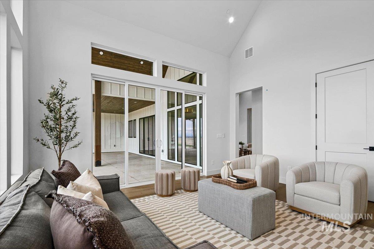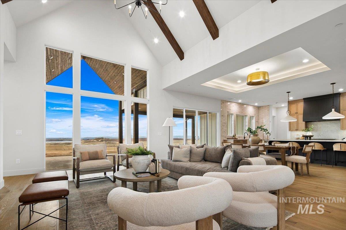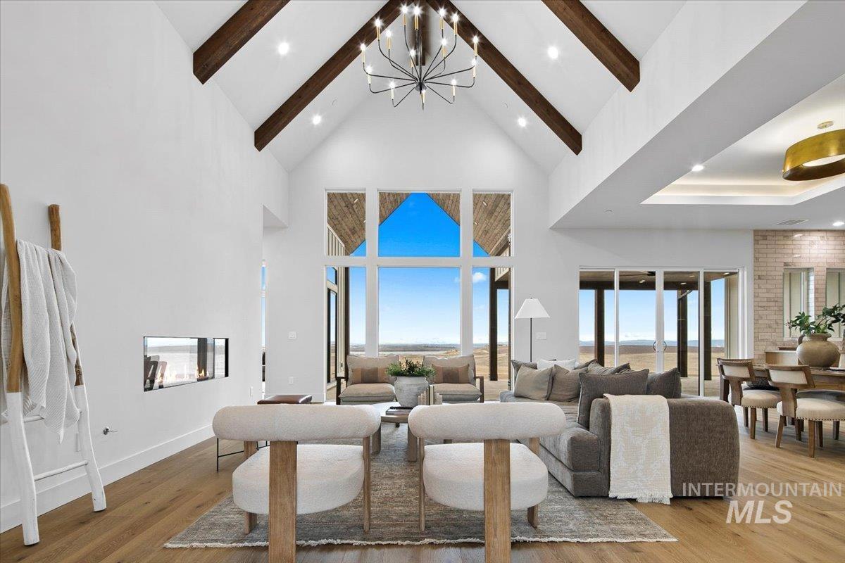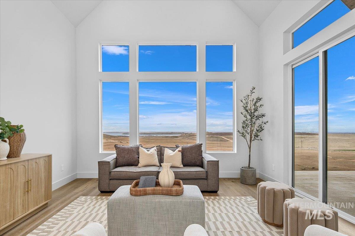 Must see lake views! Discover luxury country living on nearly 2 acres just south of Lake Lowell. This thoughtfully designed single-story home features 4 spacious bedrooms, 3.5 bathrooms, an office and large bonus room not included in bedroom count, and an impressive 52’ RV bay in addition to the 3-car garage perfect for all your toys and storage needs. Enjoy elevated living with built-in Thermador appliances including built-in fridge, two dishwashers, hidden prep kitchen, and designer finishes throughout such as hard surface (quartzite) countertops, engineered hardwood floors and motion activated toe-kick and soffit lighting. 60" Indoor Heat & Glo Primo Fireplace, covered patio with cedar wood planks. Expansive windows frame scenic views of Lake Lowell, offering the peace of rural living just minutes from Nampa’s conveniences.