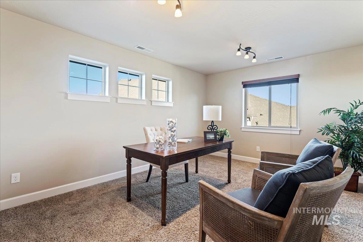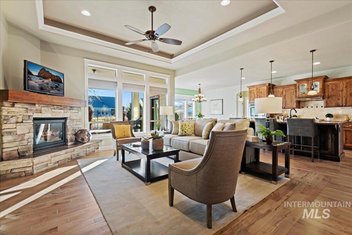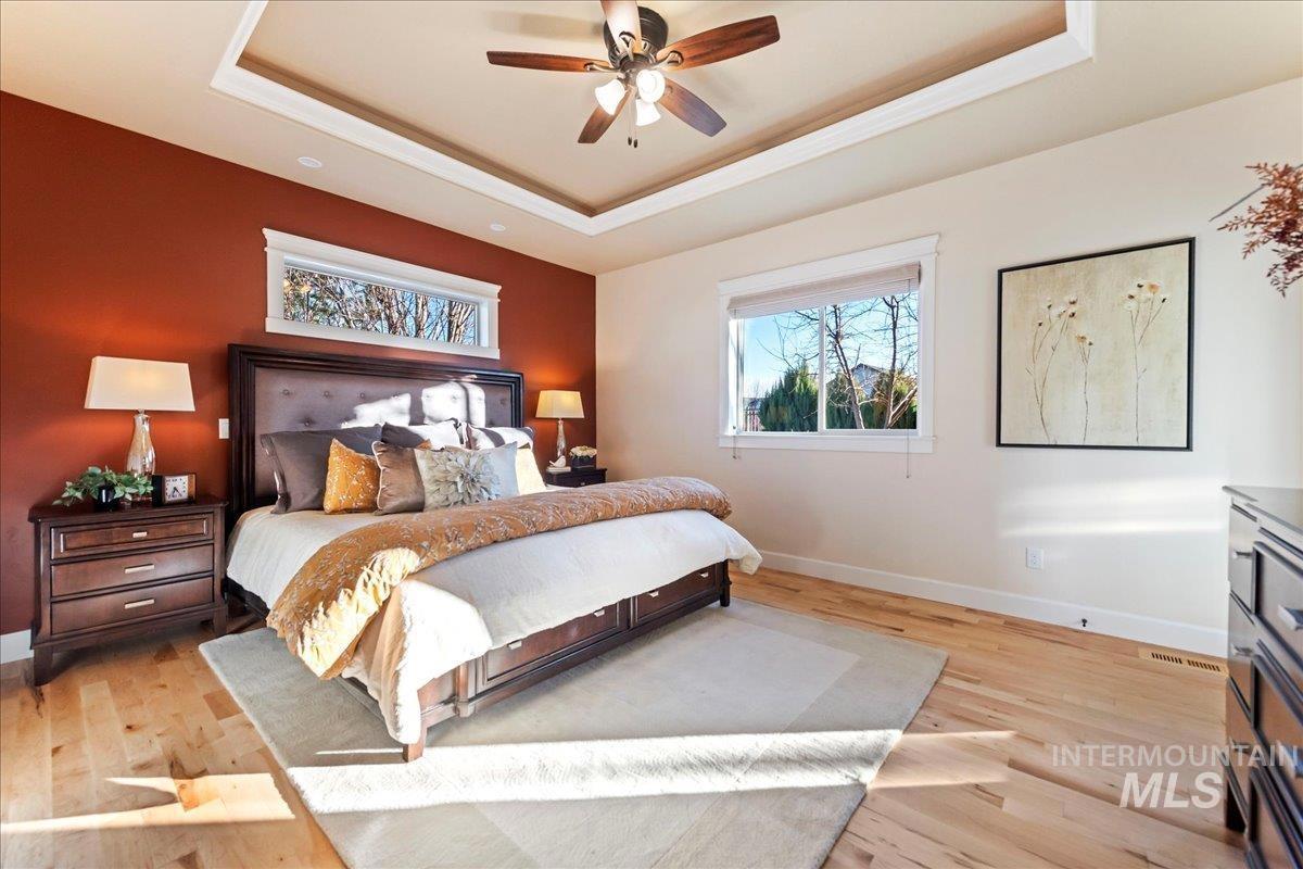 PRIME LOCATION IN SOUTH MERIDIAN! This custom home was built for efficiency and functionality, with refined features throughout. Meticulously maintained, the split-bedroom floorplan is spacious & seamlessly connects the living, kitchen & dining areas for everyday living & entertaining for large gatherings. The culinary enthusiast will thrive in the kitchen with double ovens, tremendous cooking/prep area, gas cooktop, high-end appliances, a butcherblock shelf & expansive walk-in pantry! The upstairs flex room offers endless possibilities (bedroom/office/classroom/crafts). ABUNDANT storage throughout, coffered ceilings with soft recessed lighting, gas fireplace, & beautiful hardwood flooring. Enjoy the serene & tranquil setting, covered patio, water feature, & no rear neighbors. Any gardener will delight in the multiple raised garden beds, manicured landscaping & large storage shed, dual HVAC units. The 43` deep RV garage w/ ADDITIONAL double-gated RV parking space is a VERY RARE & VALUABLE find that offers security & tremendous savings from off-site storage fees. Resort-style community amenities w/ walking paths, pool, spa, state-of-the-art fitness center, & clubhouse. Just 1.5 miles to I-84, 2.5 miles from the future Costco, Meridian Library, Amphitheater/Event Center, Roaring Springs Waterpark. Only 20 minutes to Micron Technology. MOVE-IN READY and INCREDIBLE LOCATION!